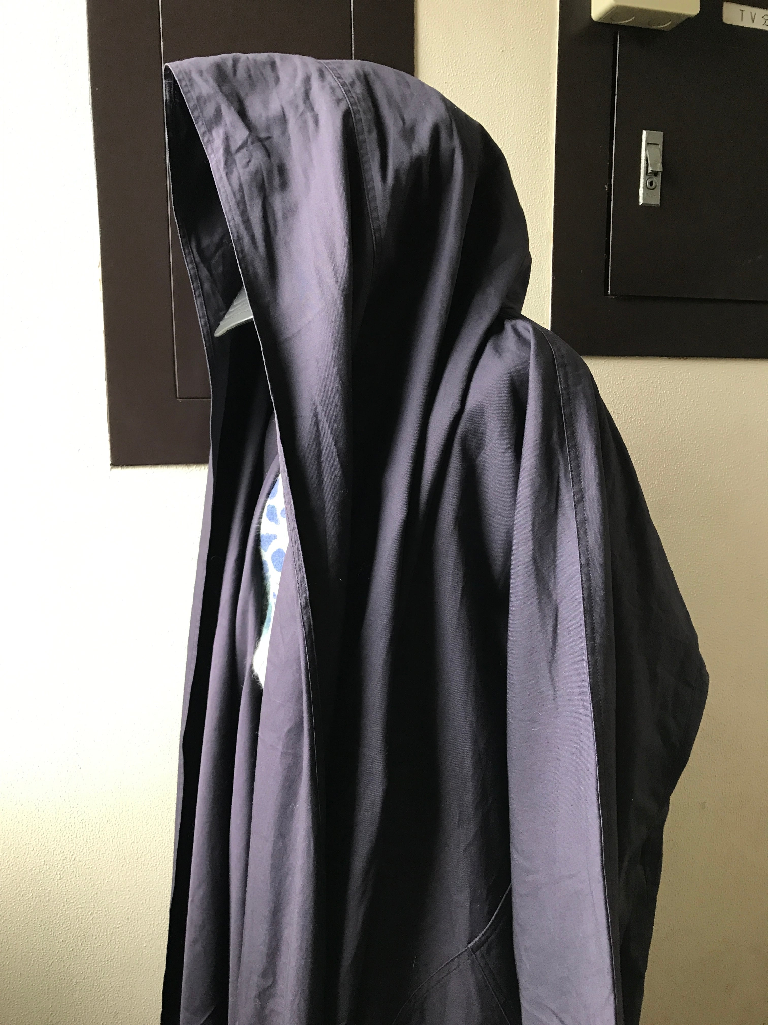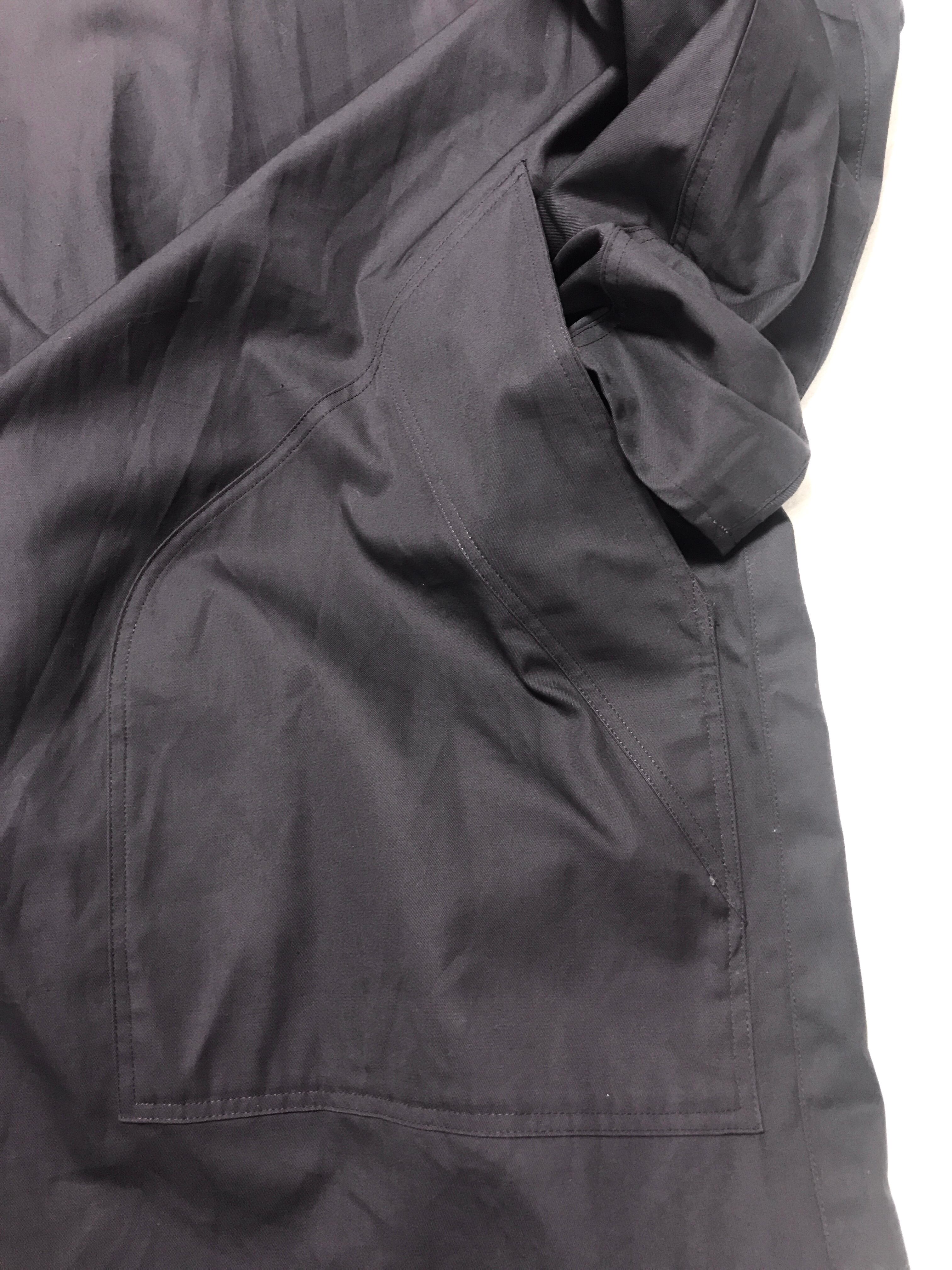 人に着せると、その延長された前端が全部ドレープになってフロントに溜まります。