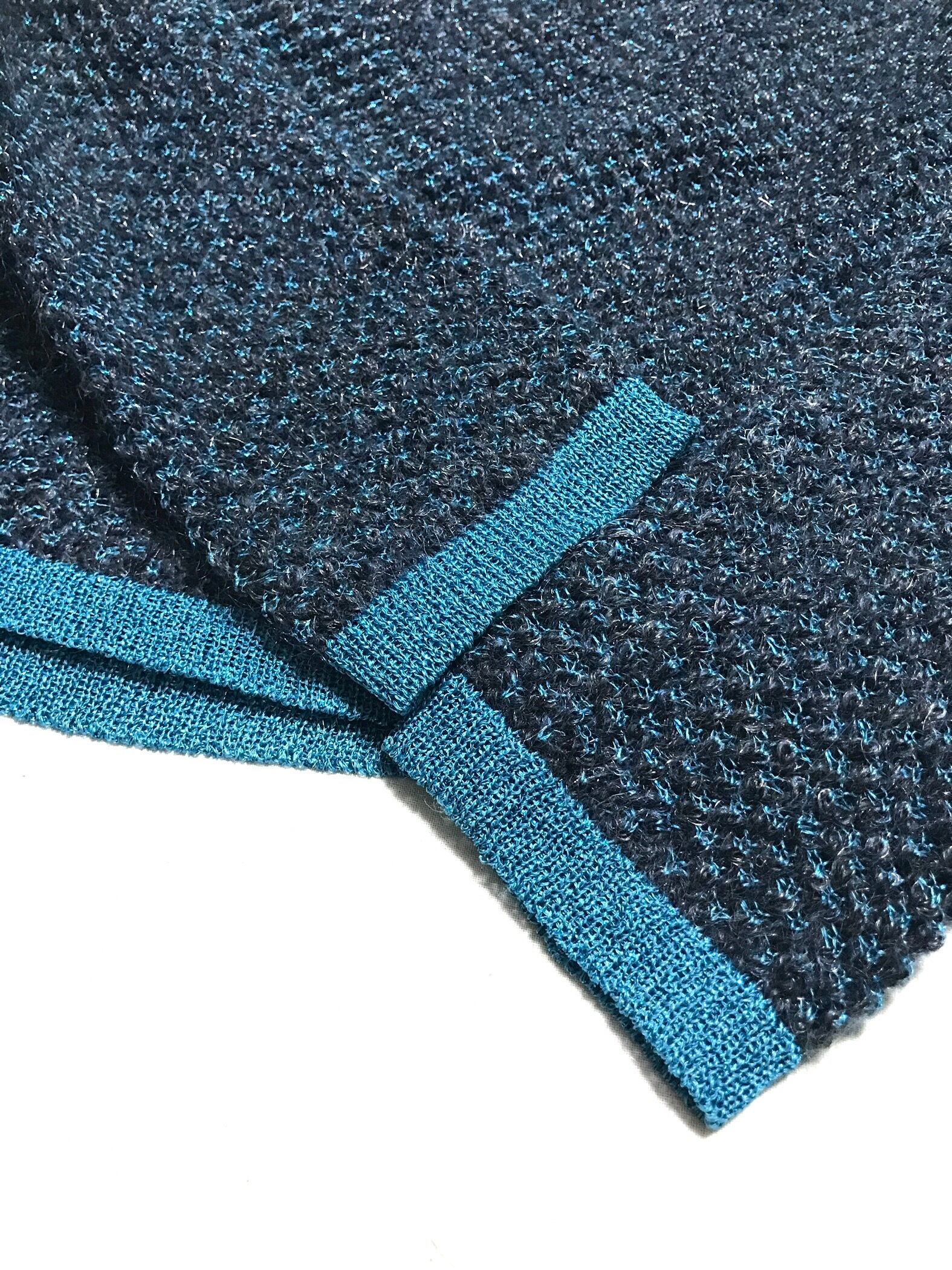 青のラメ糸を混ぜ込んでの凹凸感のあるポコポコした編み地。