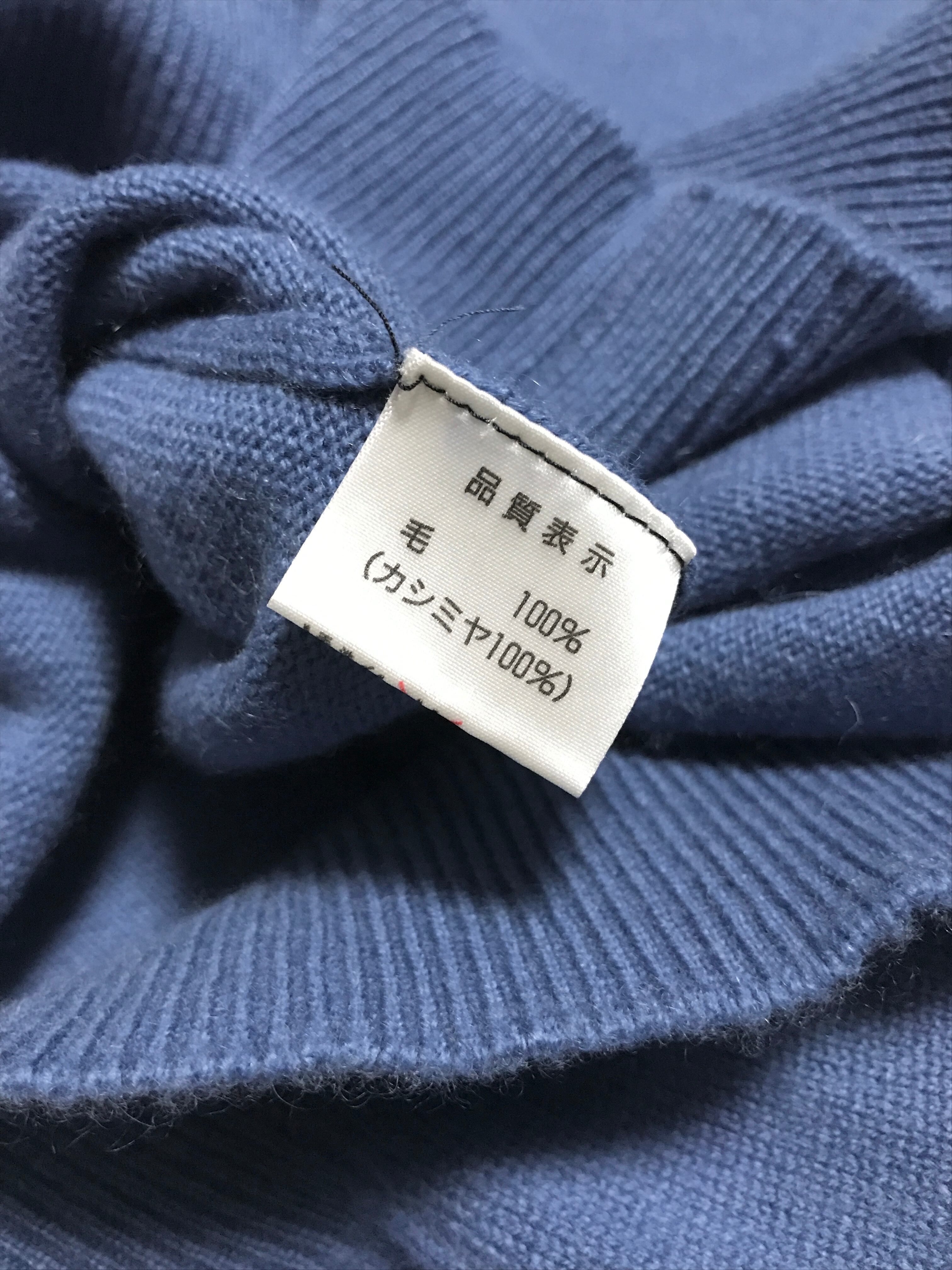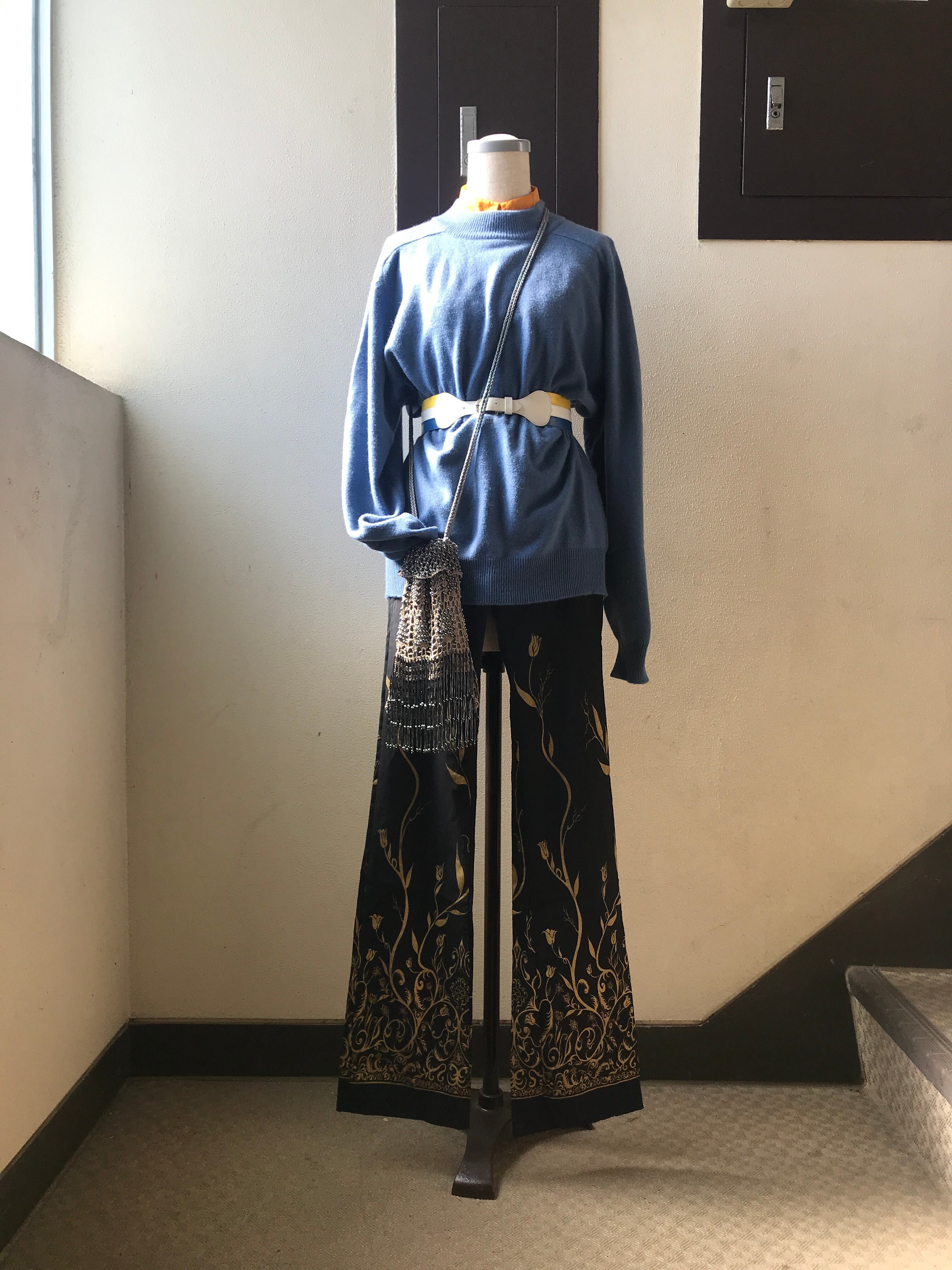よく青色は「落ち着いた雰囲気を出す色」とか「誠実な雰囲気を…(以下同文)」とか「クールな…(以)」とか、おおよそそんなパブリックイメージのもと扱われますが、前述した全ての要素を含んで更にそこに青色ではなかなか両立し得ない「あたたかみ」も兼ね備えてしまうのがこちらのセーターですね。