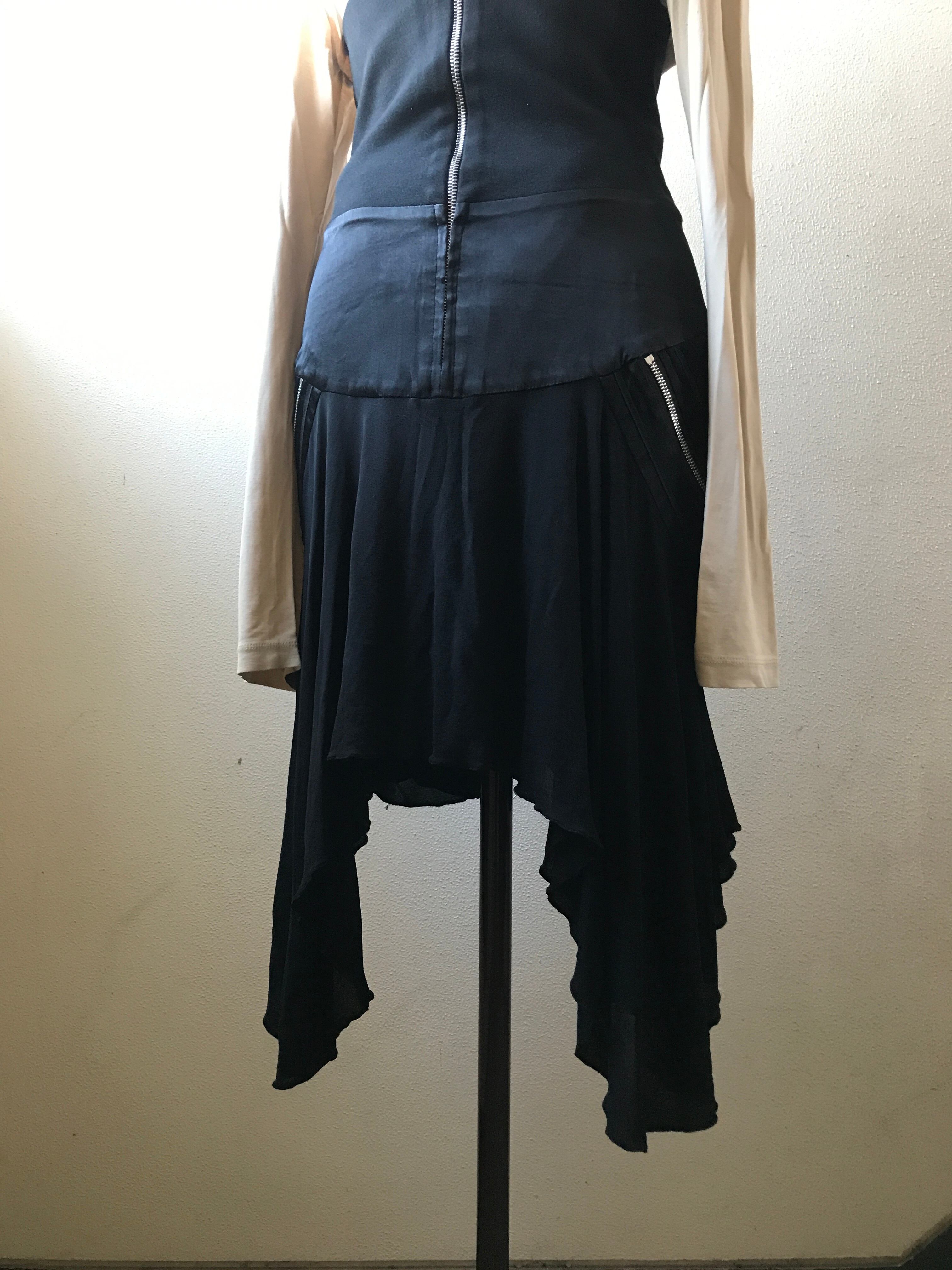 メタルジップ×フレアの作為的なドレーピングのコントラストが強烈な魅力を放つ1着。