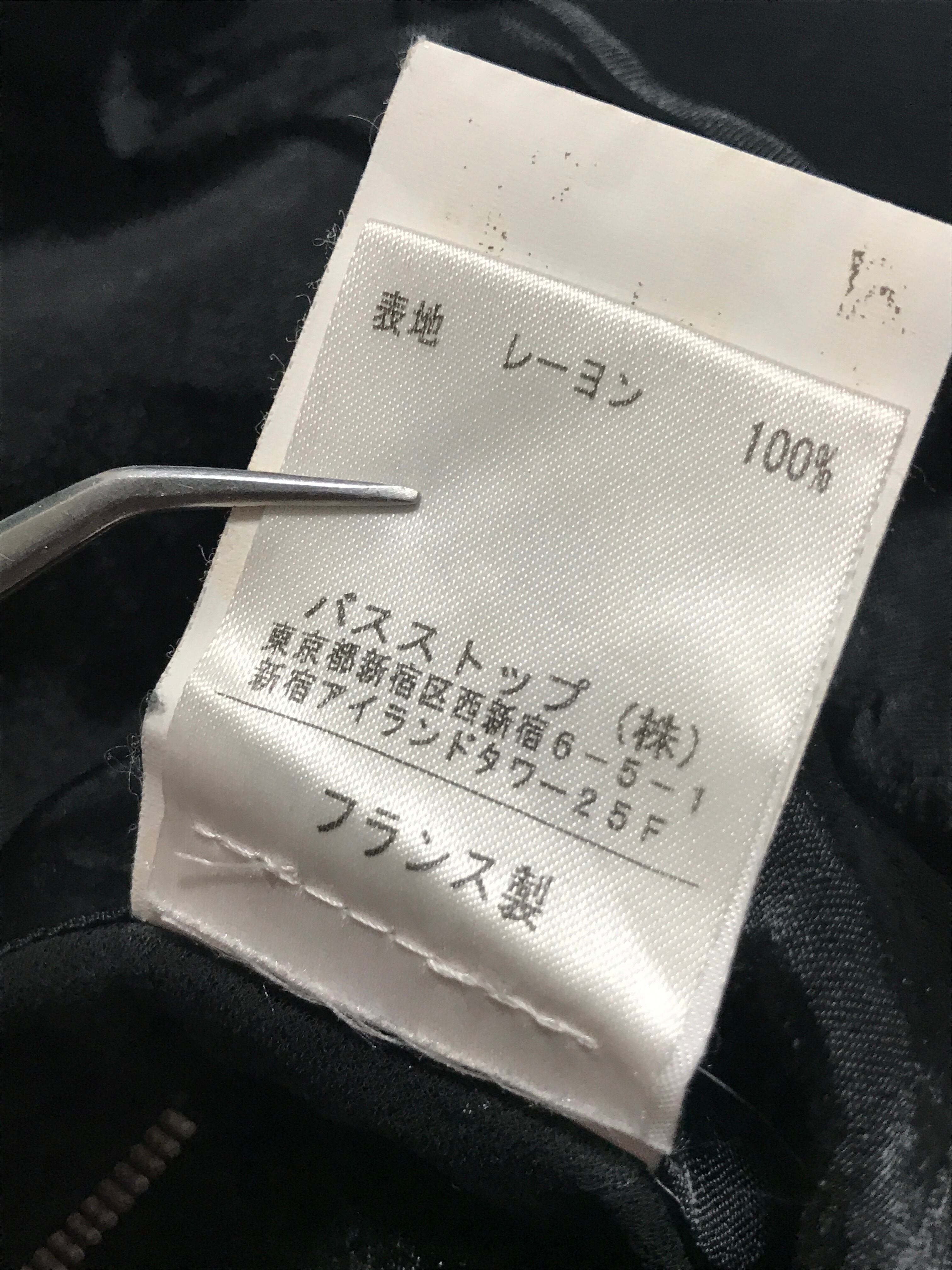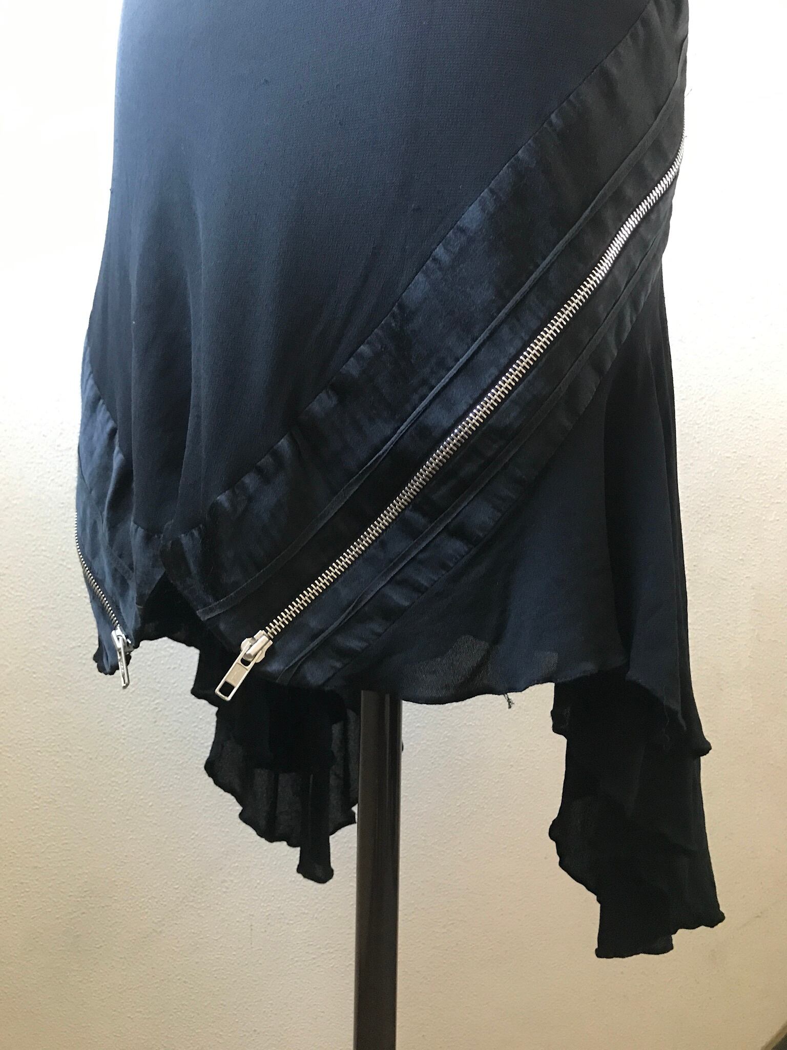 巧みなカッティングの中に配されたメタルジップが、ランダムであるはずのドレープの流れを固定しながら落ちていく、という中々高度な落ち感操作が入っていますね。