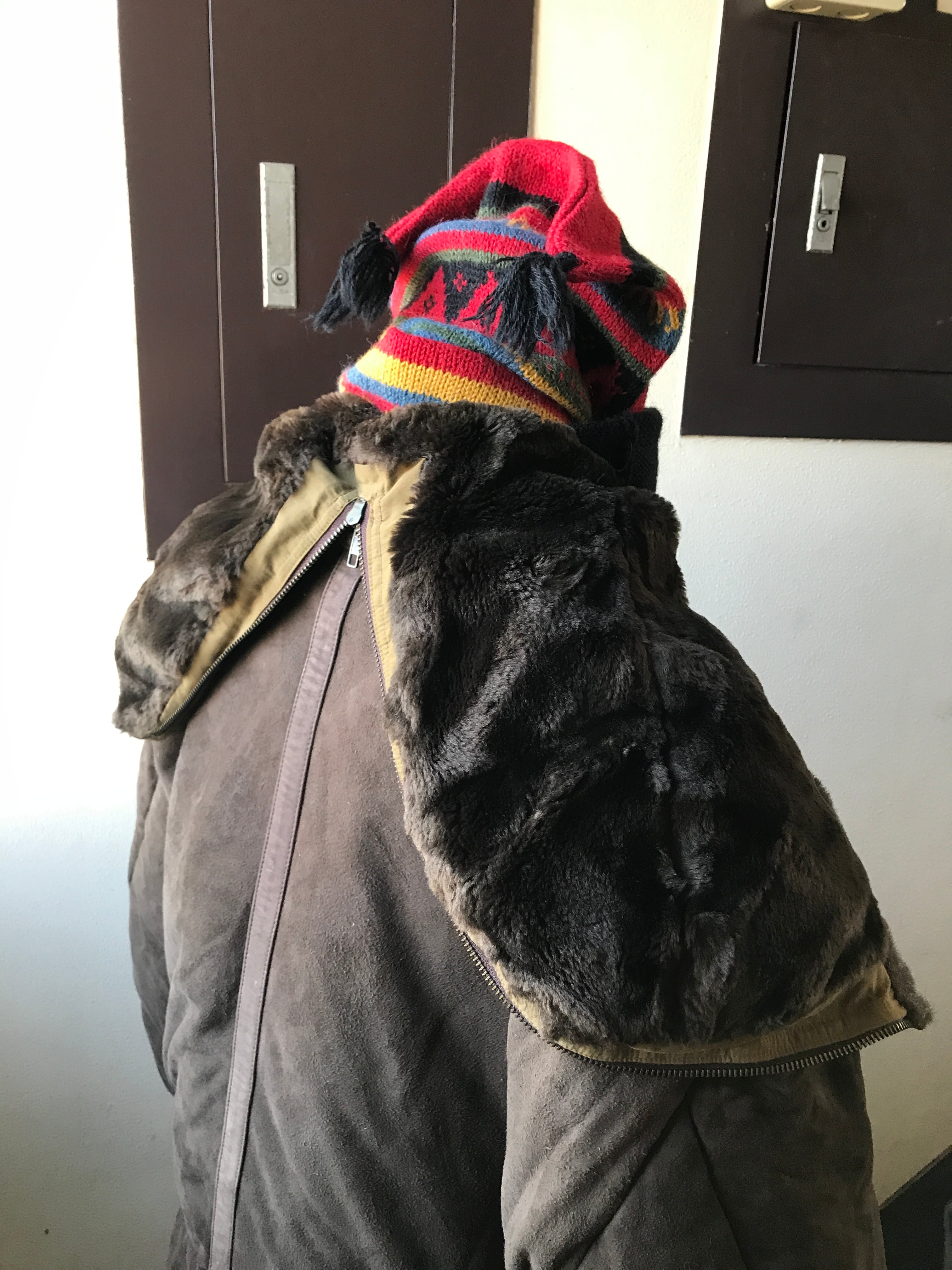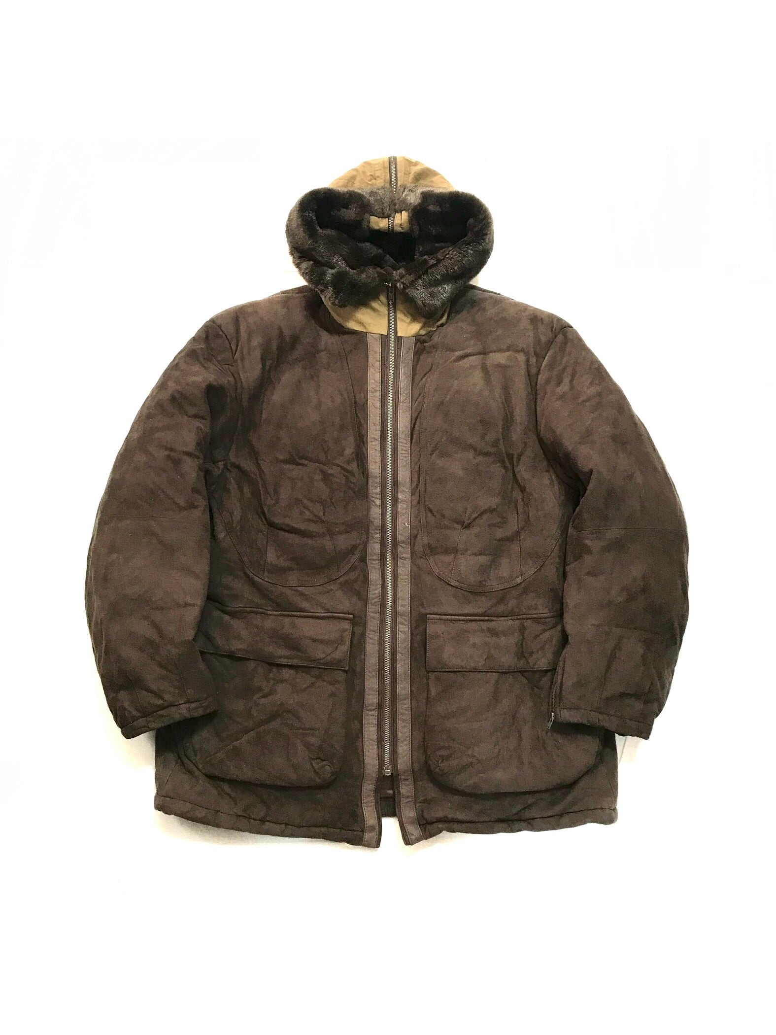 こちらは薄く柔らかなスエードレザーに中綿をパンパンに詰めたパファーコート。