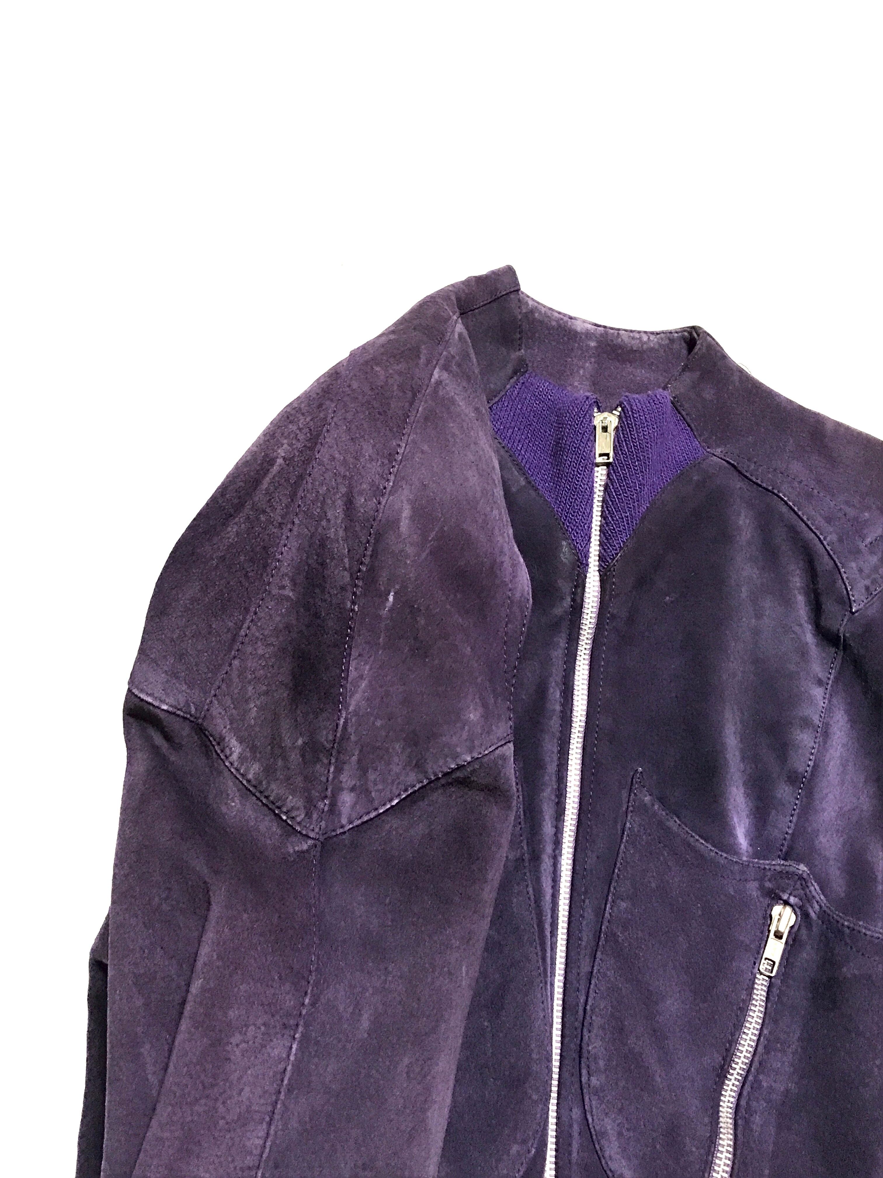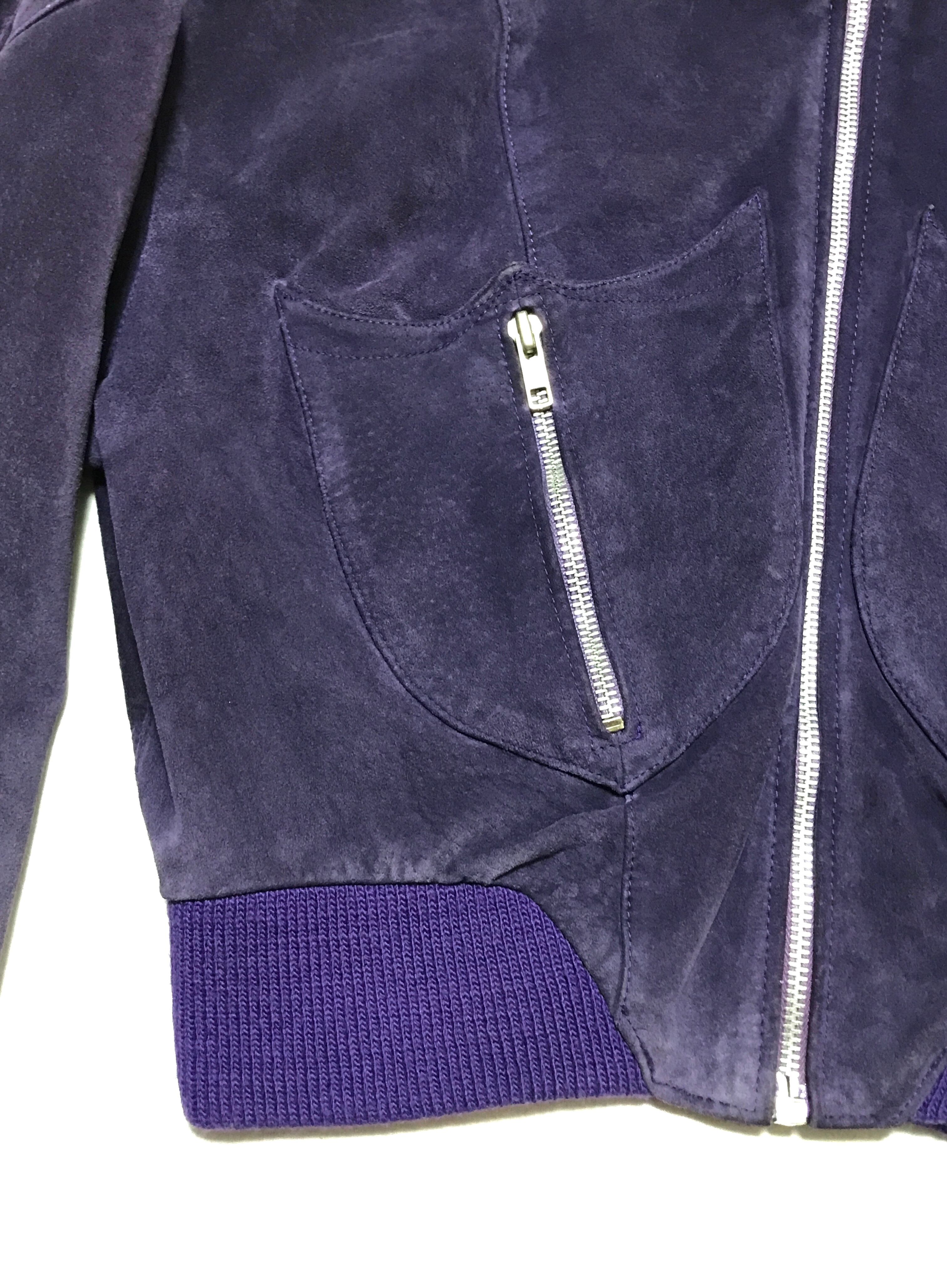 紫に染め上げたピッグスエードで仕立てたジップアップジャケット。