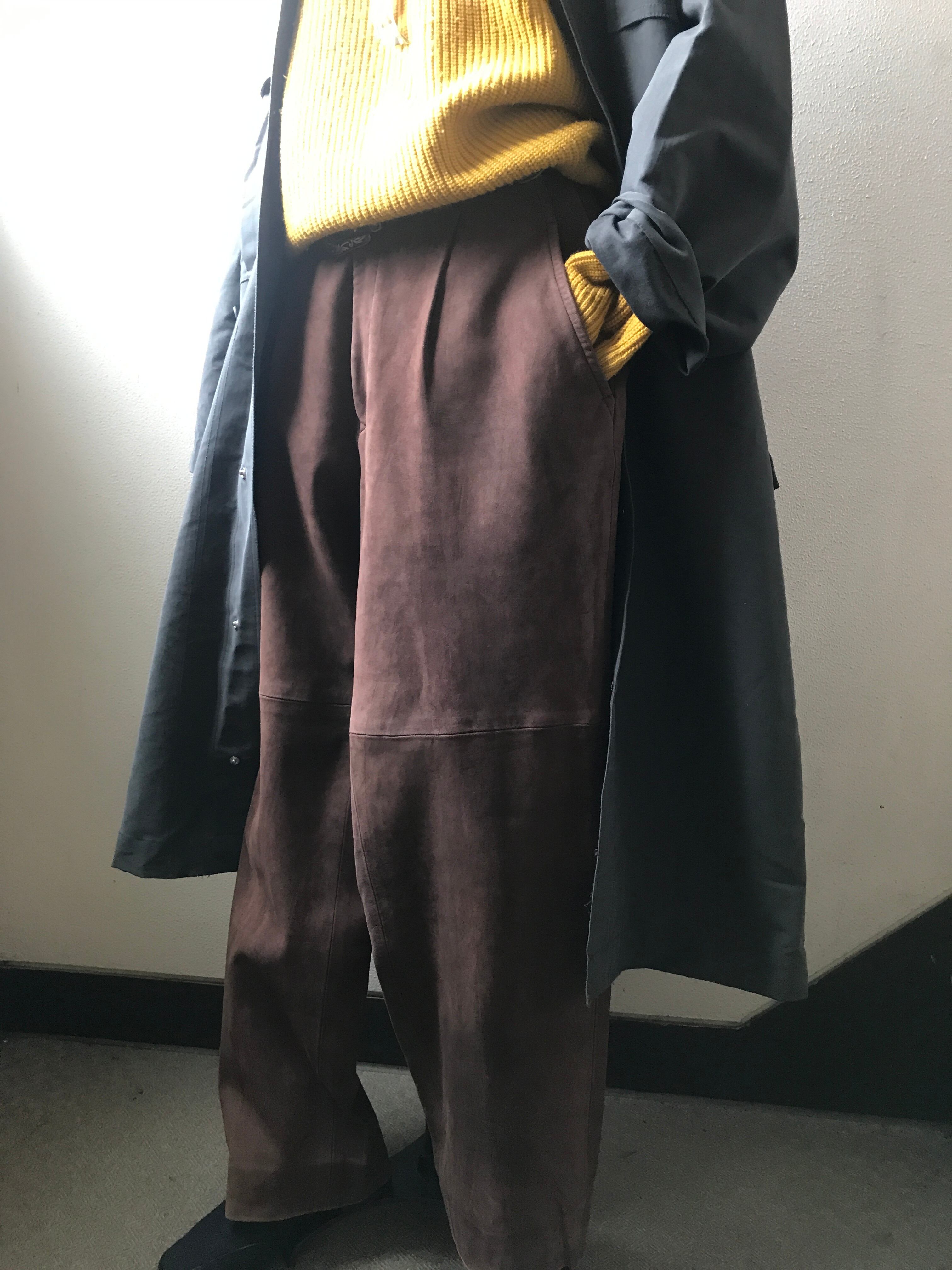 ズシリと重いヌバックレザーで仕立てられた貫禄のあるワイドスラックス。