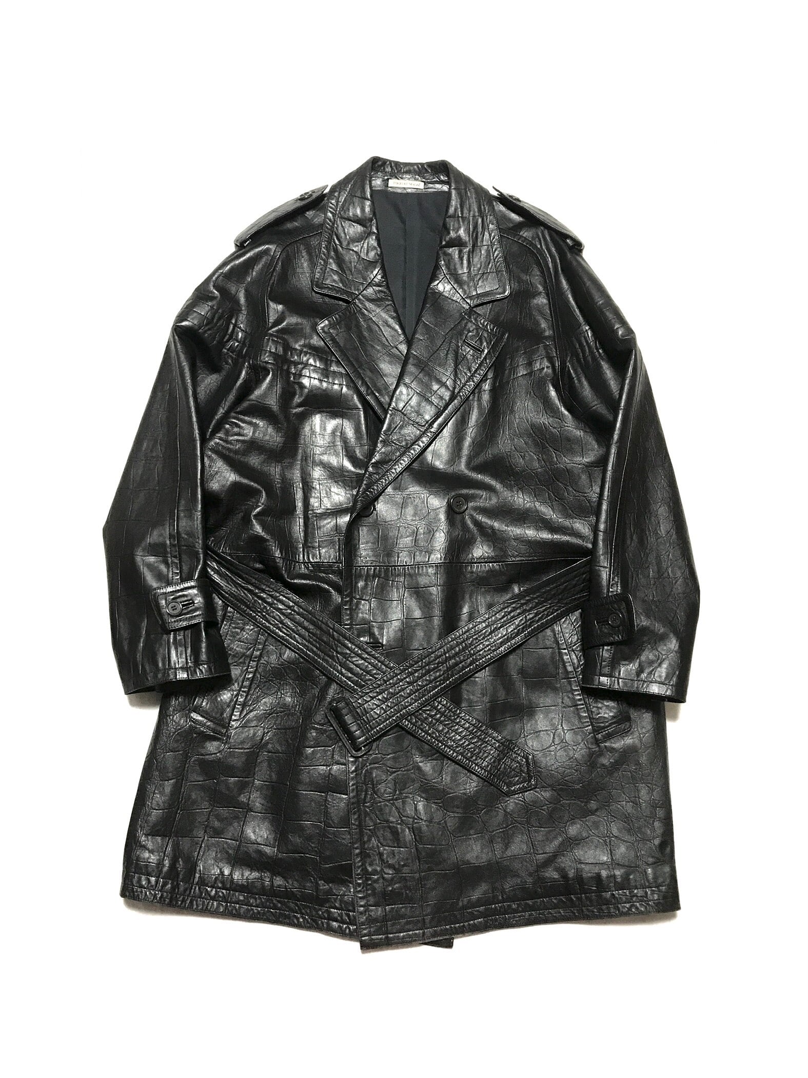 エンボス加工のブラックラムレザーで仕立てられたフルレザートレンチです。