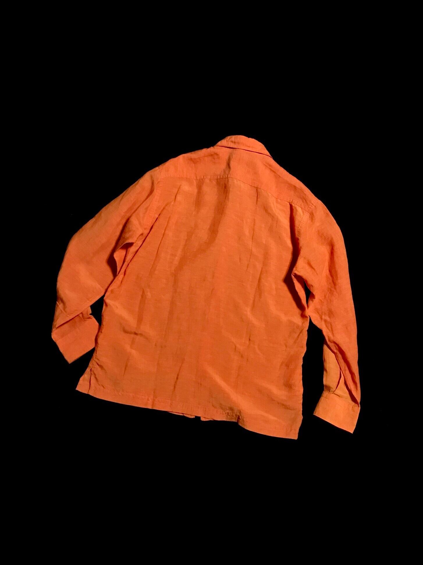オレンジのテンセルリネン(リネンの軽やかさはそのままに、少しシワが付きにくかったりケアが容易になってます)を用いて、通常の前立ての隣にハーフジップ機構を配置したデザイン。
