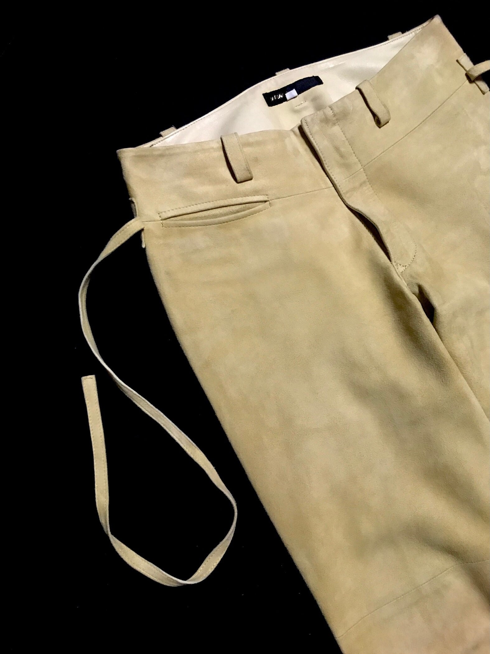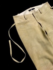 バックヒップライン(厳密にはHLより数センチ上)辺りにベルト状パッチを叩き縫い、そこに挟まれたレザーコードを任意の箇所で結んだり結ばなかったりする仕様です。