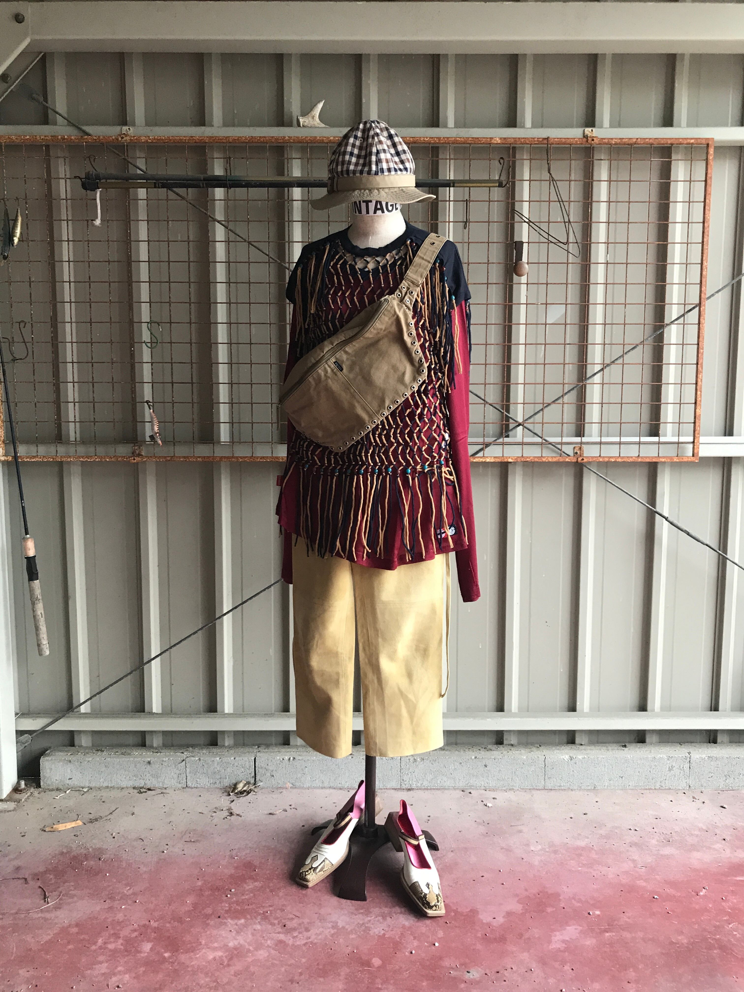 フルでマクラメニットだとあまりに非日常的過ぎるので、見慣れた日常的なフォーマットをわざと土台に置いて、こうしたアヴァンギャルドをデイリーに楽しもうというベクトルかなと。