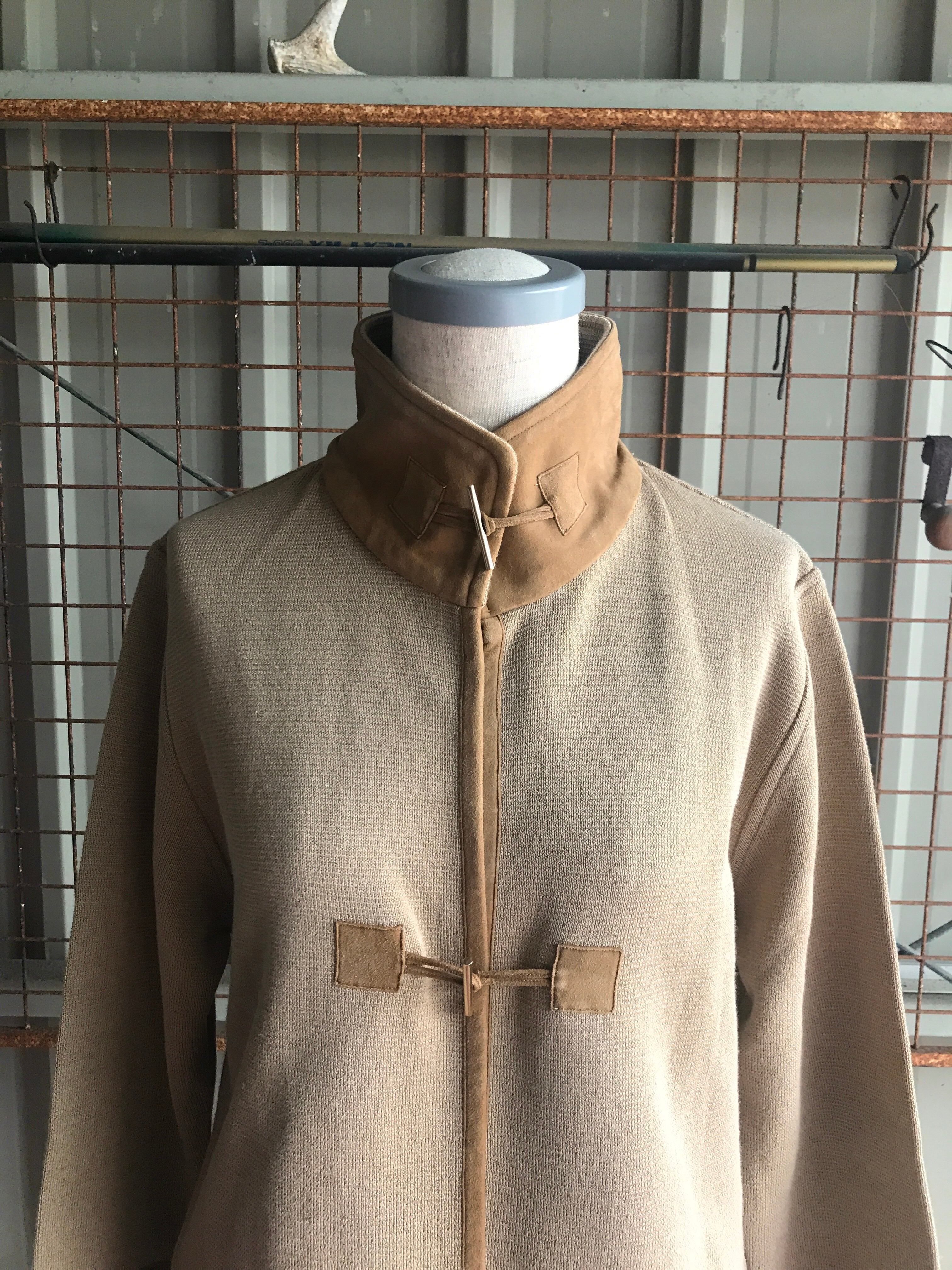 そのトグル周りの機構に加えてスタンドカラーには羊革ヌバック、身頃のエッジにも同素材でのトリミングが入るデザイン。