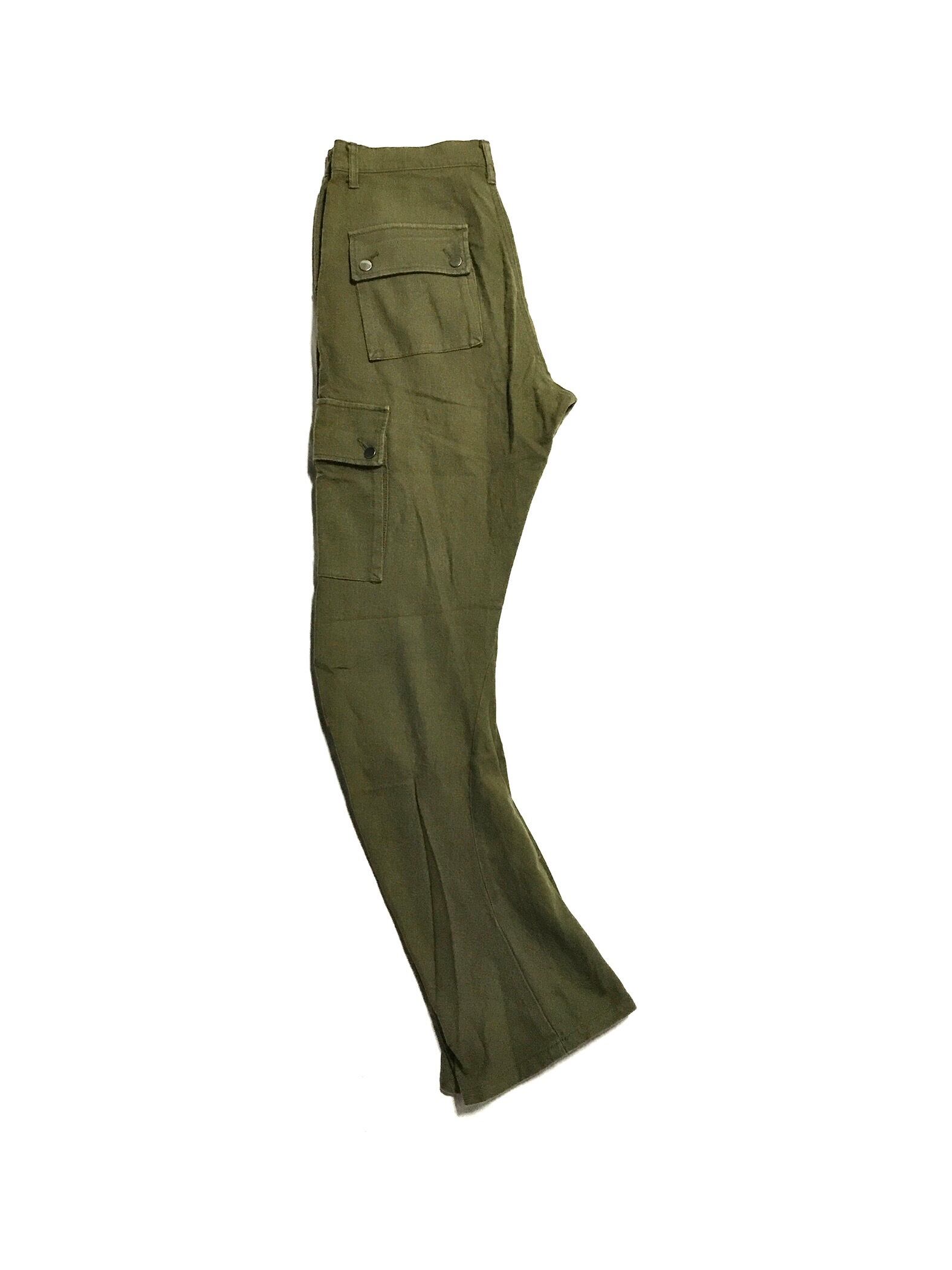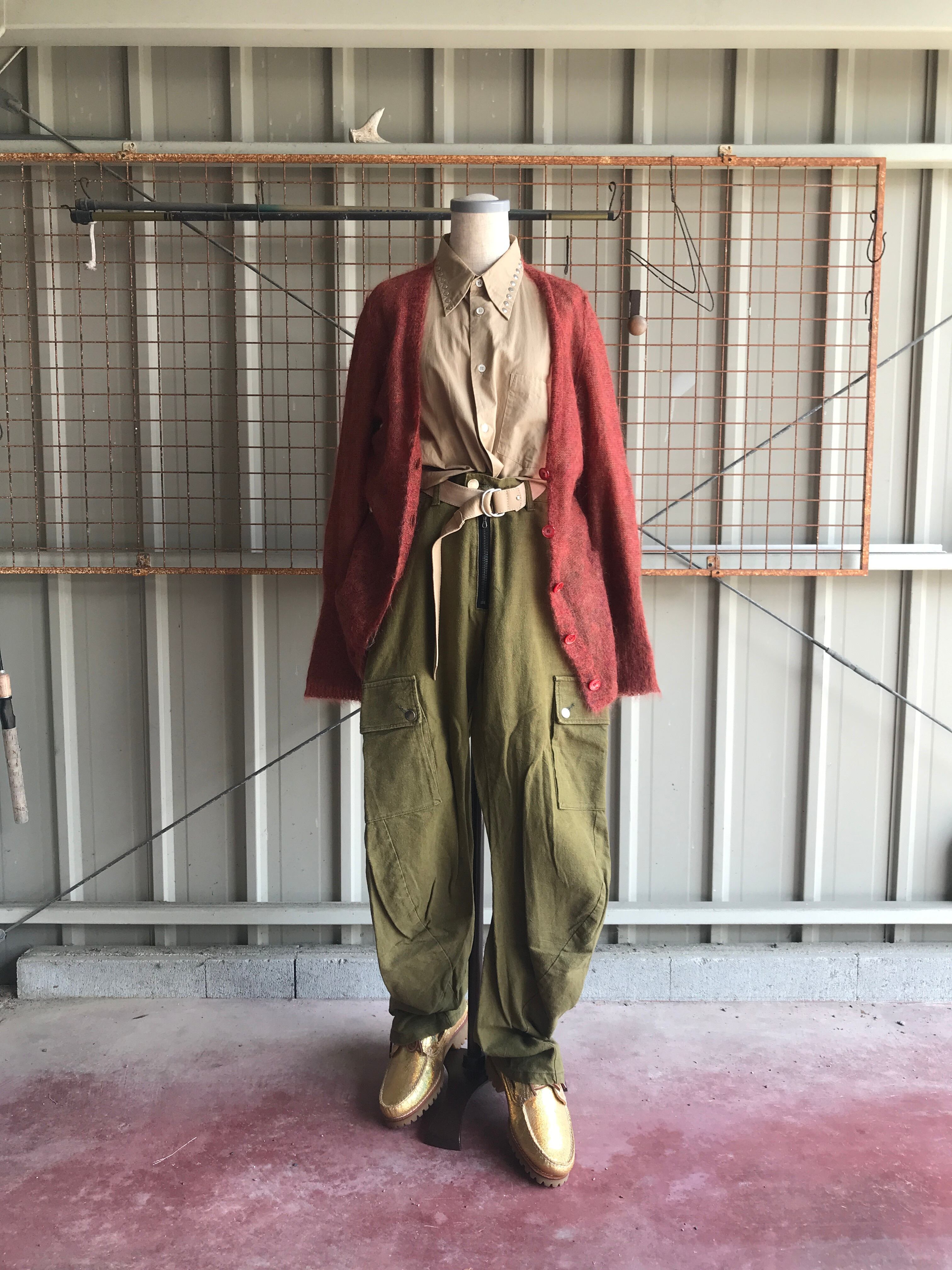 フレアシルエットのカーゴをカッティングで人体工学的に捻じ曲げた一本という感じ。