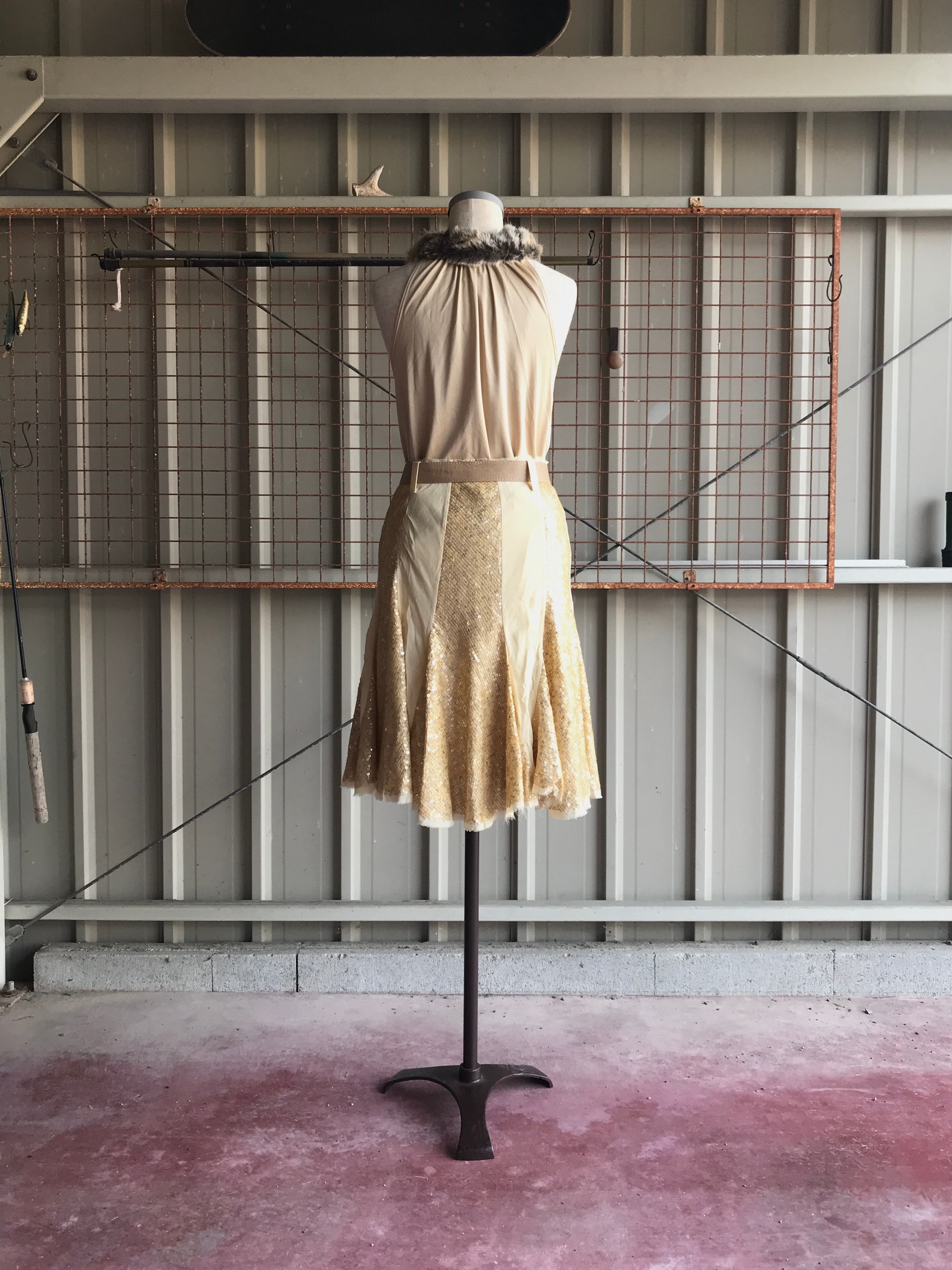 大きくフレア展開したパーツを全てバイアスで裁断し、それを無数の極小スパングルで飾り、重くならないようディテールでバランスを取る。