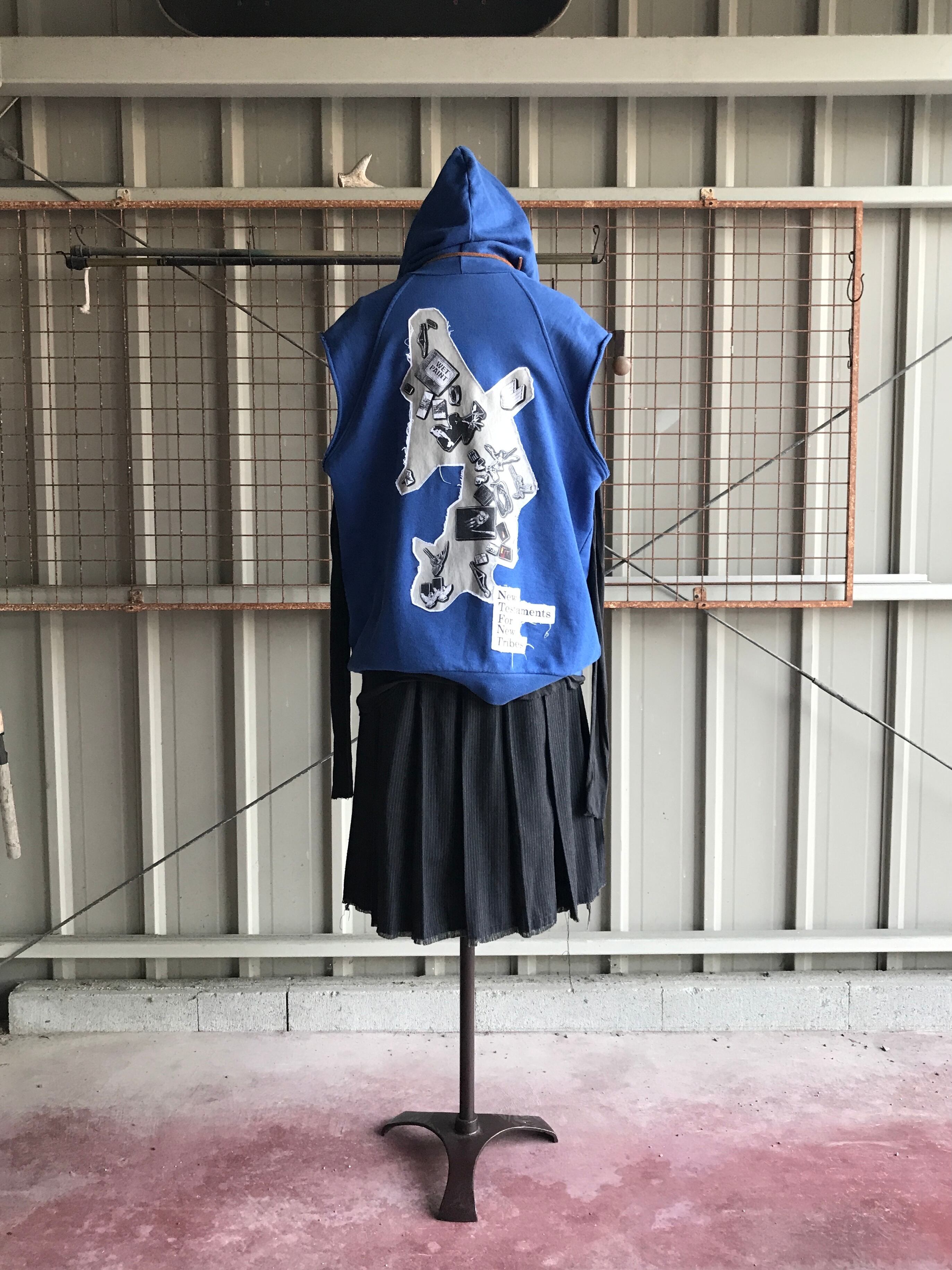 それをプリーツスカートに引用してジェンダーのクロスオーバーを図ったデザイン。