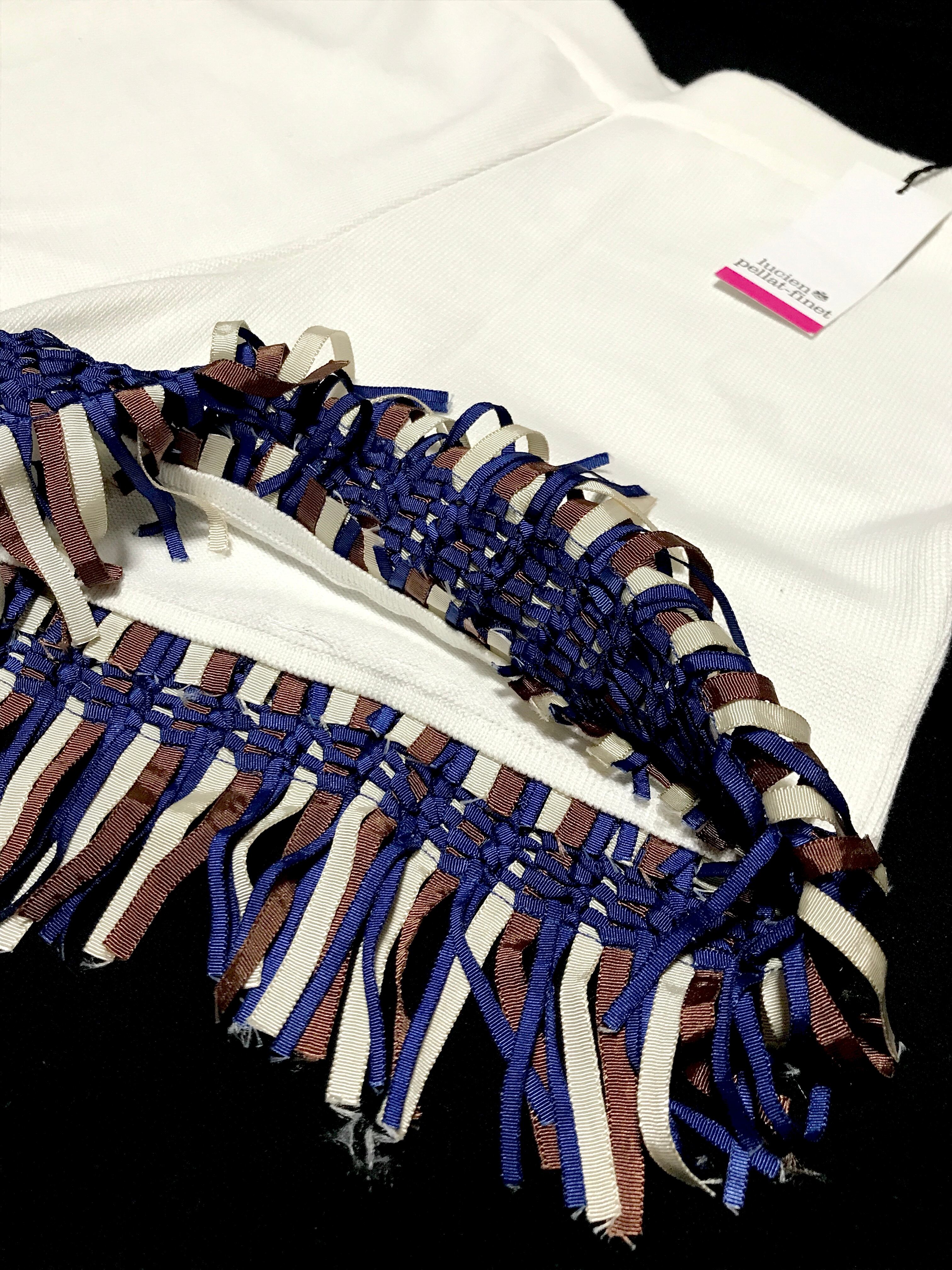 コットンニットのオーガニックでヘルシーなノリから、化繊の細巾リボンを編み込んだ、凝った仕様のフリンジデザインをプラス。