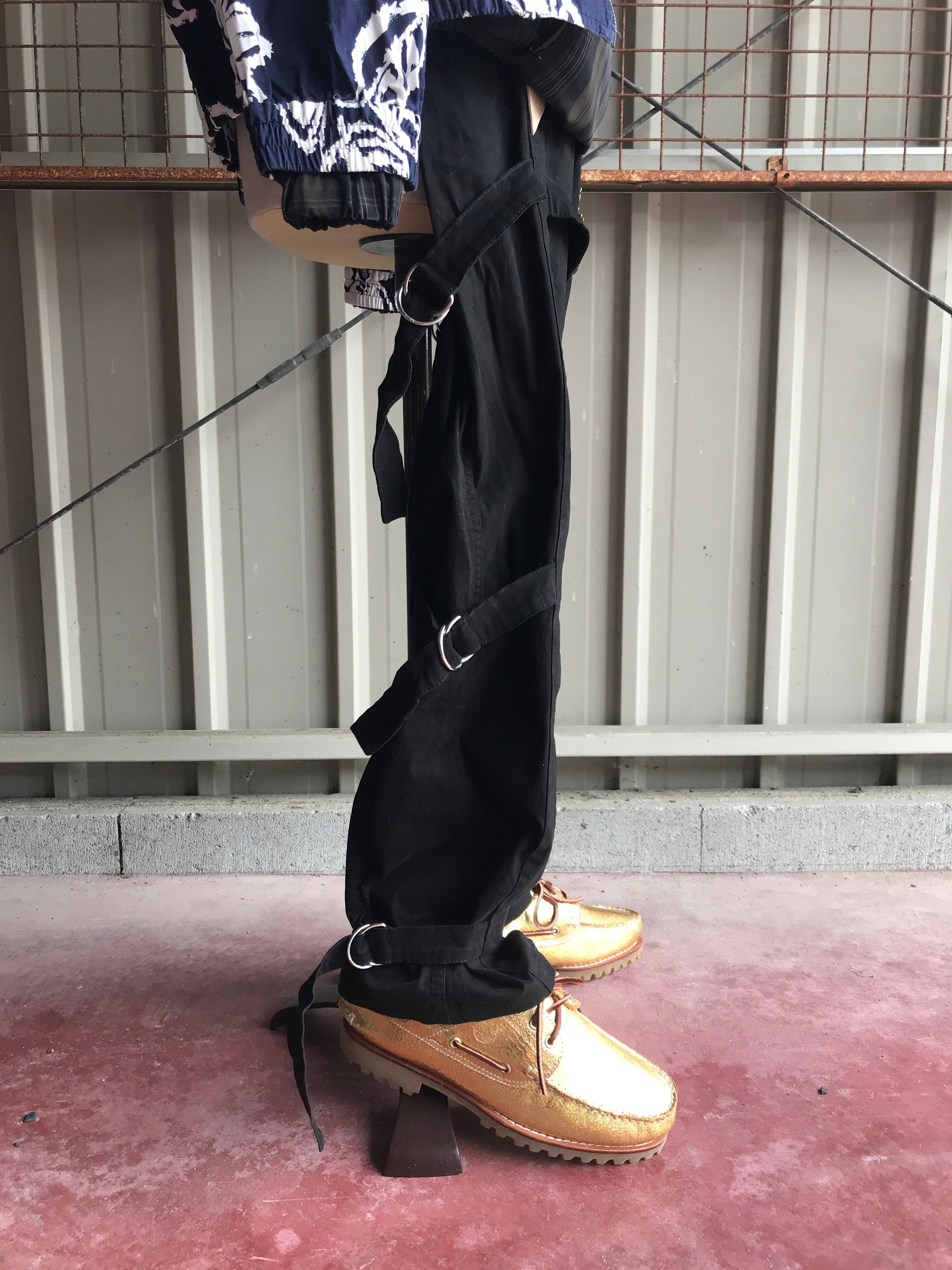 の3箇所にアジャストベルトを配したボンテージパンツです。