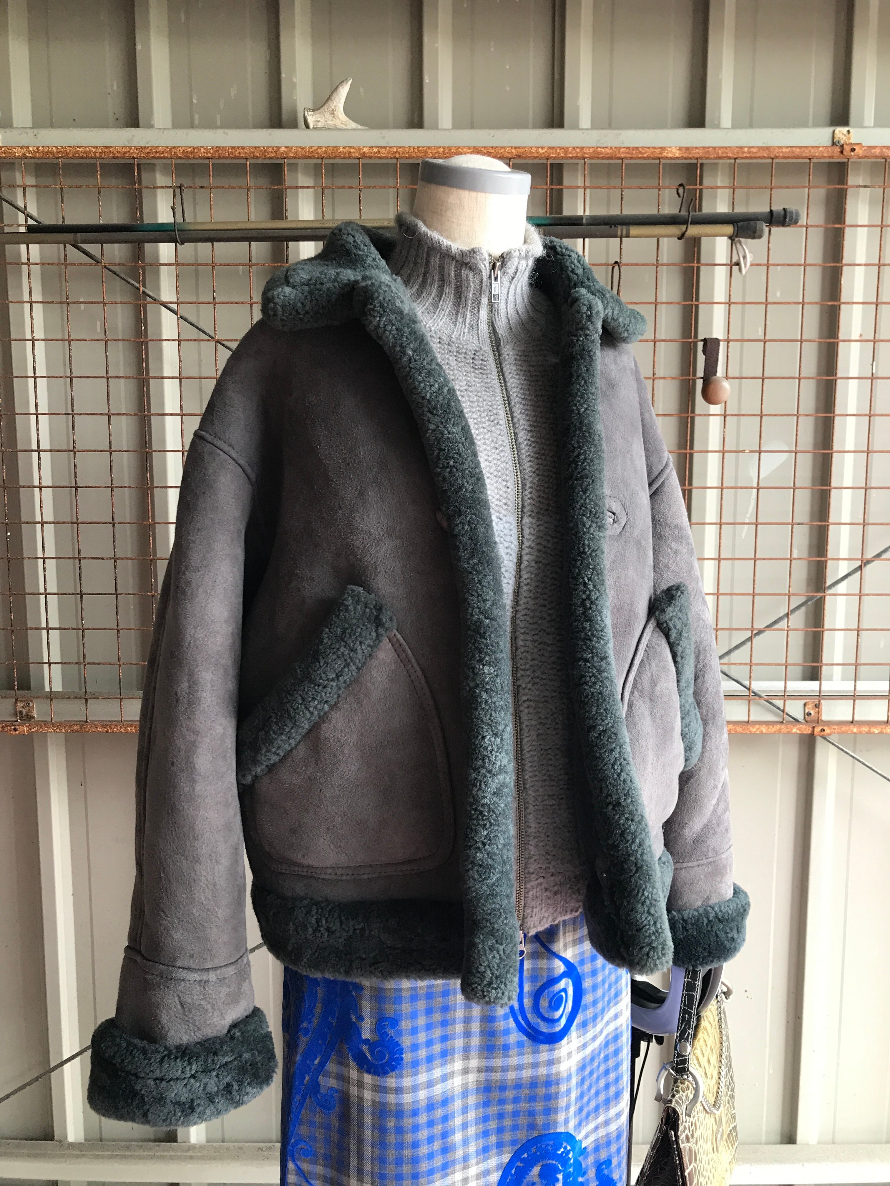 灰色のムートンジャケット。