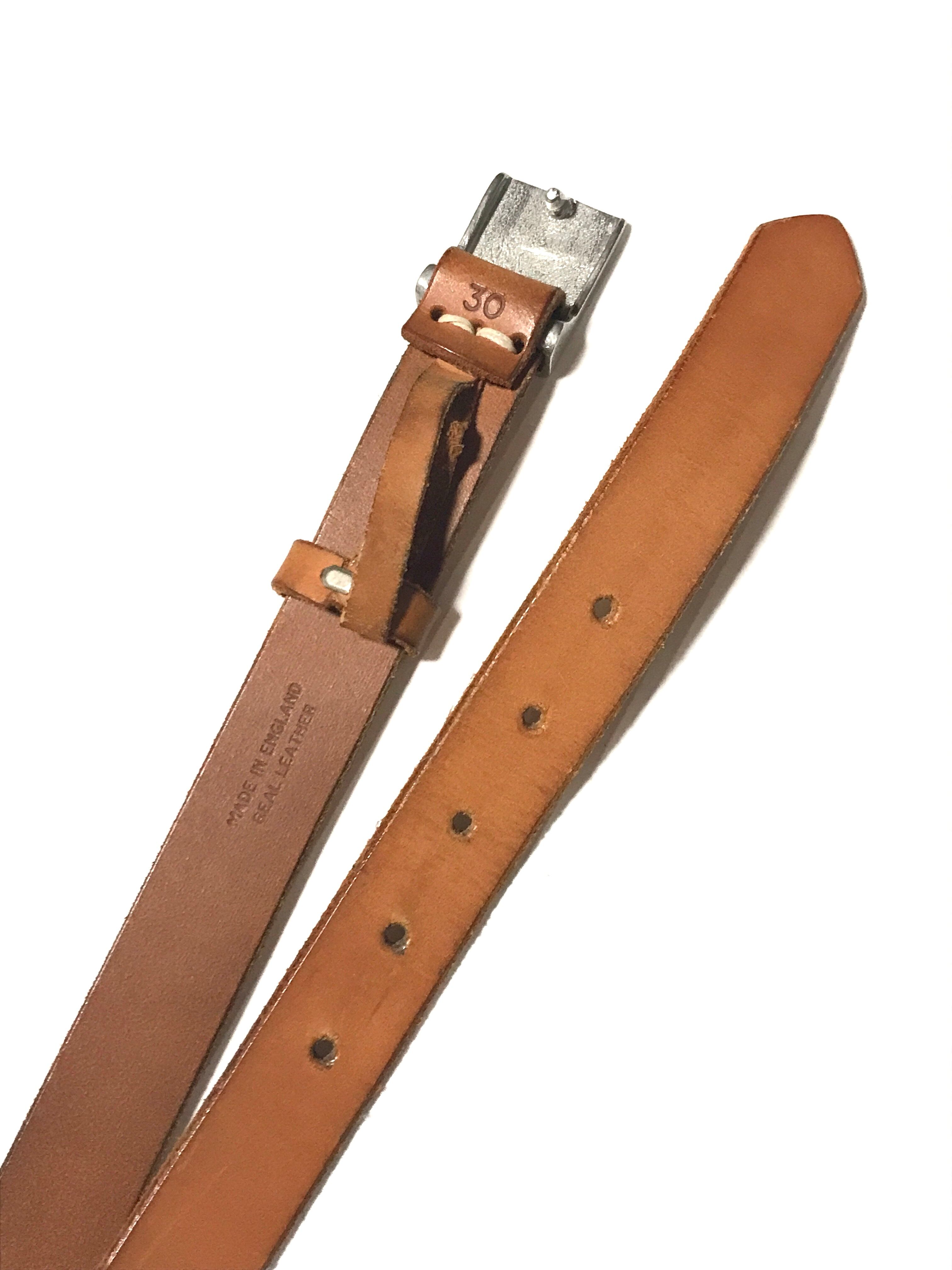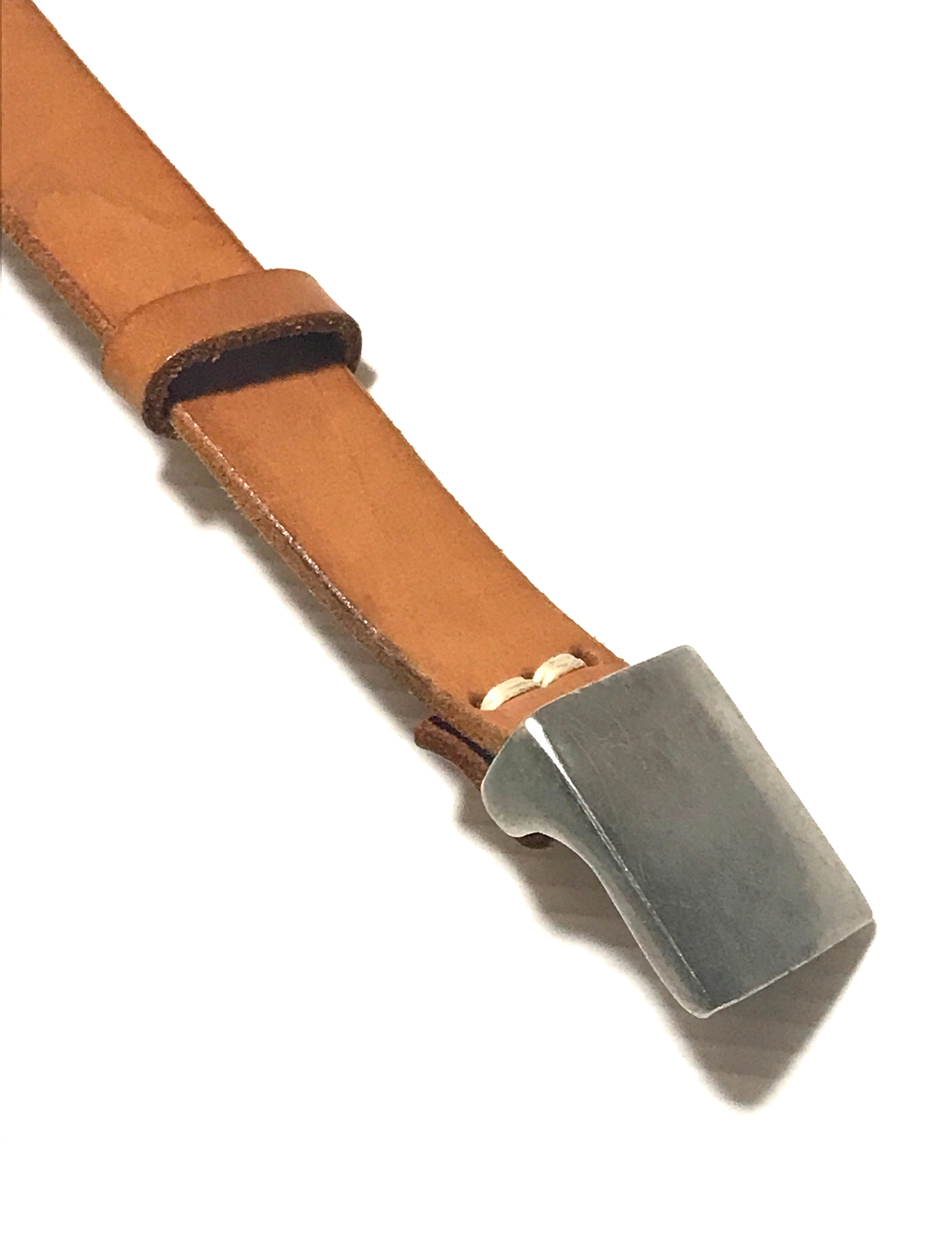 ピンフックがバックルと一体になったミニマルなデザインのレザーベルト。