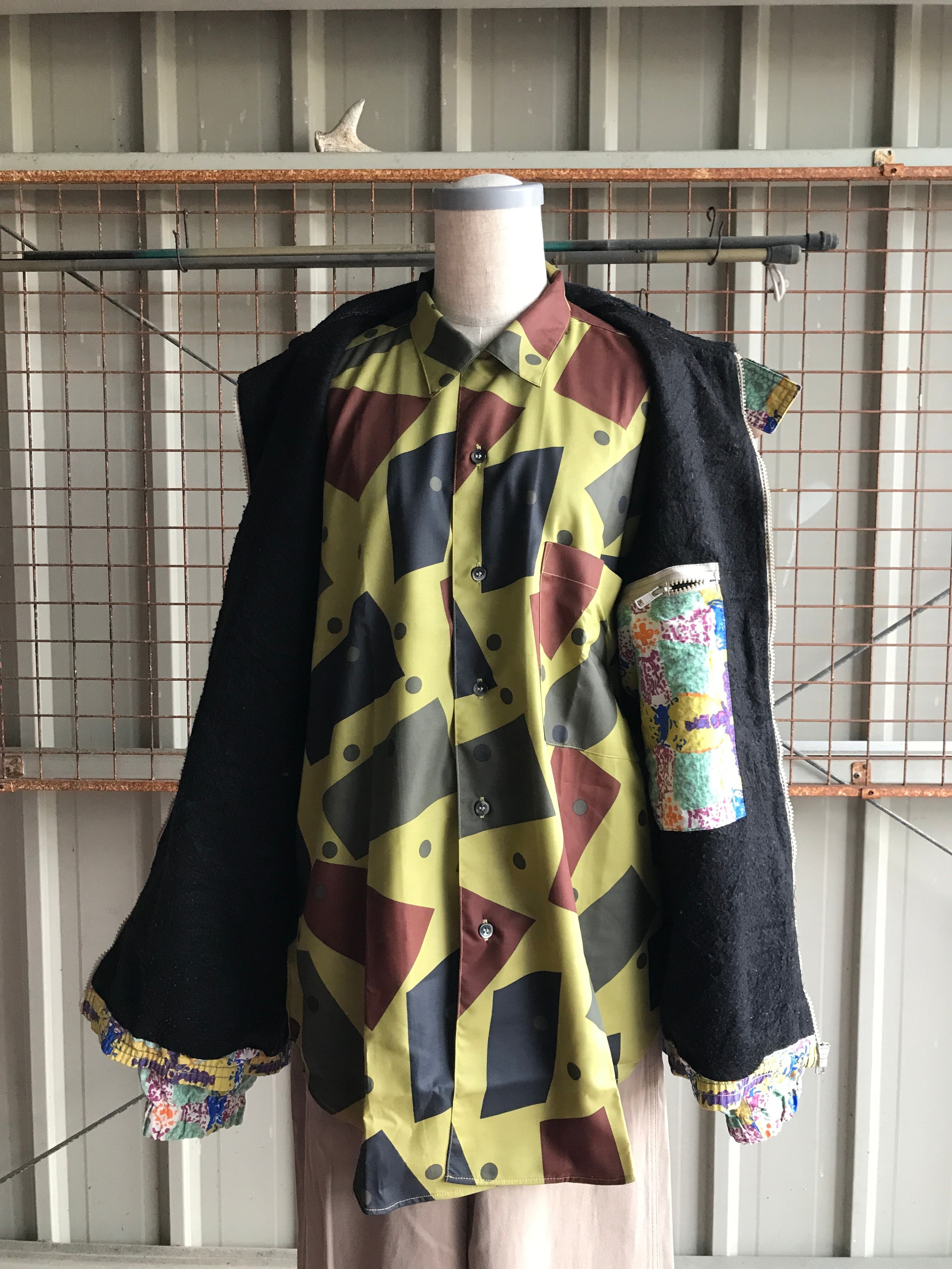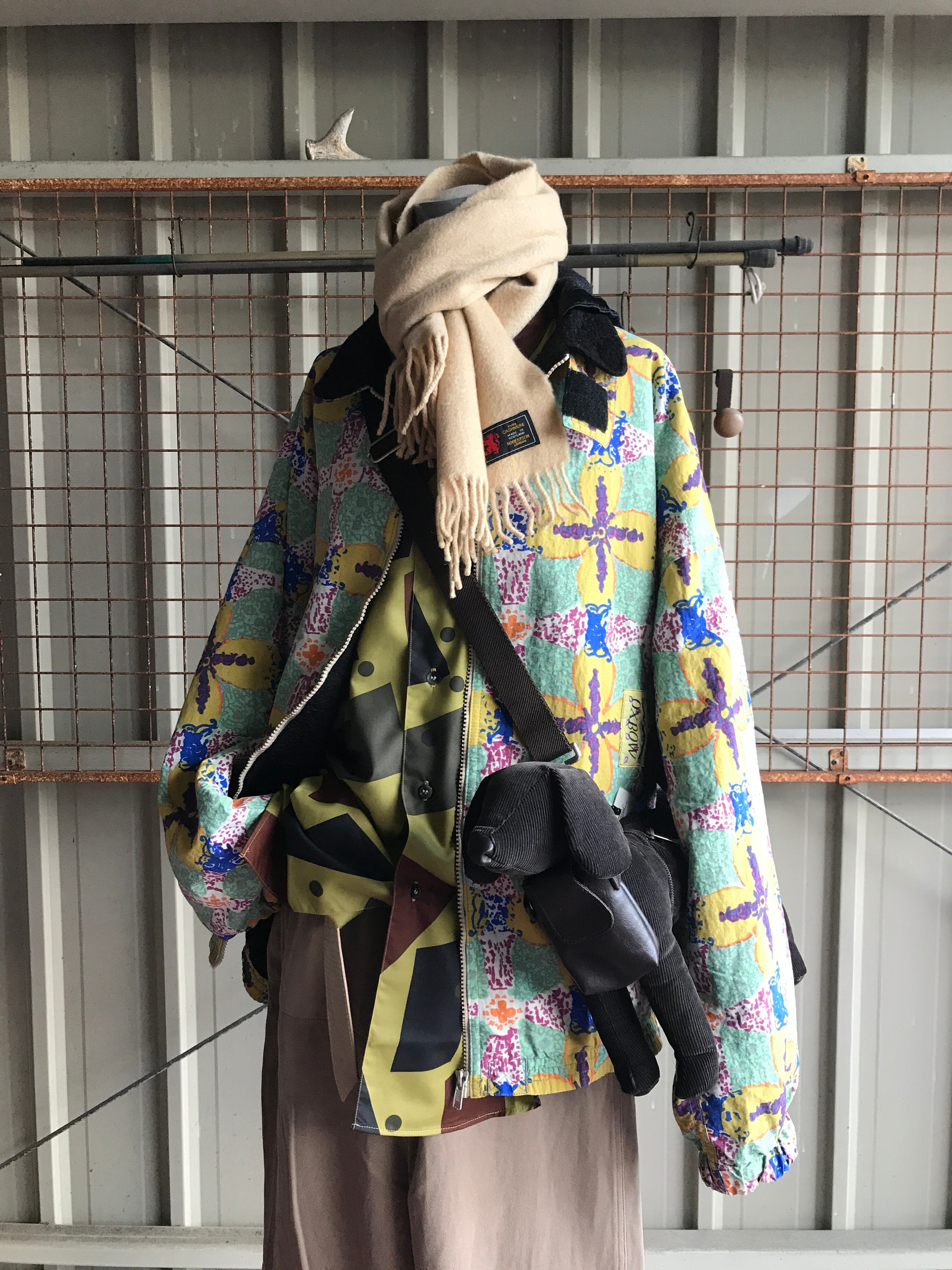この服も言っちゃえば結構着たもの勝ちに近いところがありますが、一点投入でこれ見よがしに目立たせるよりは、同じく掴みどころのないアイテムと合わせてスノッブに組んだり、柄重ねて開き直るのが個人的に好きです。