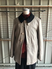 この撫で肩&鳩胸メイクは前ボタンを2つ以上閉めれば発動するんですが、例えば1番上のみを閉めたり、前開けにしたりすると撫で肩&鳩胸の為に用意されたゆとりが全部裾に逃げて、身頃前端を外に捌けさせる。