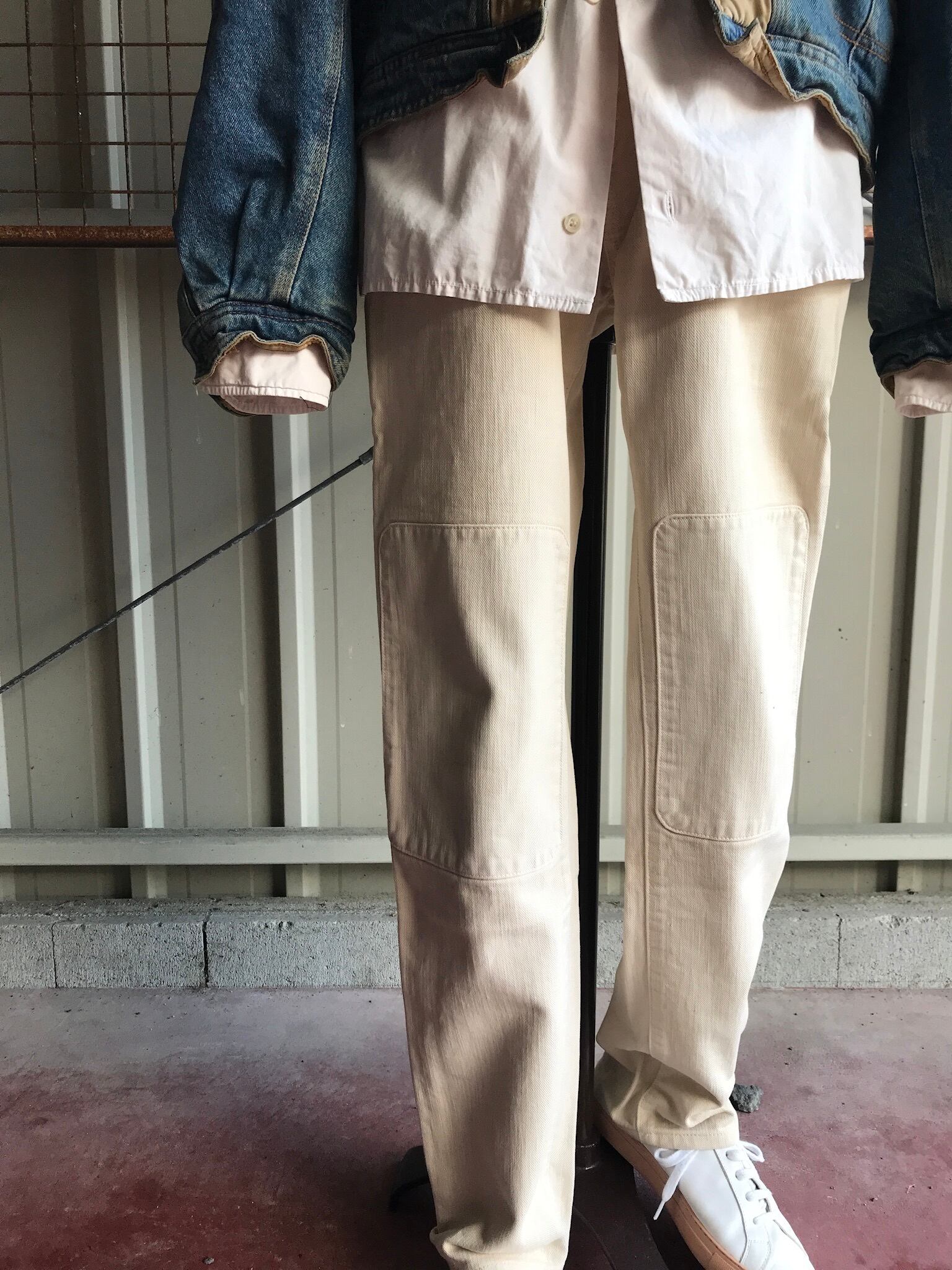 ほんわかしたクリームカラーで作られたダメージジーンズ。
