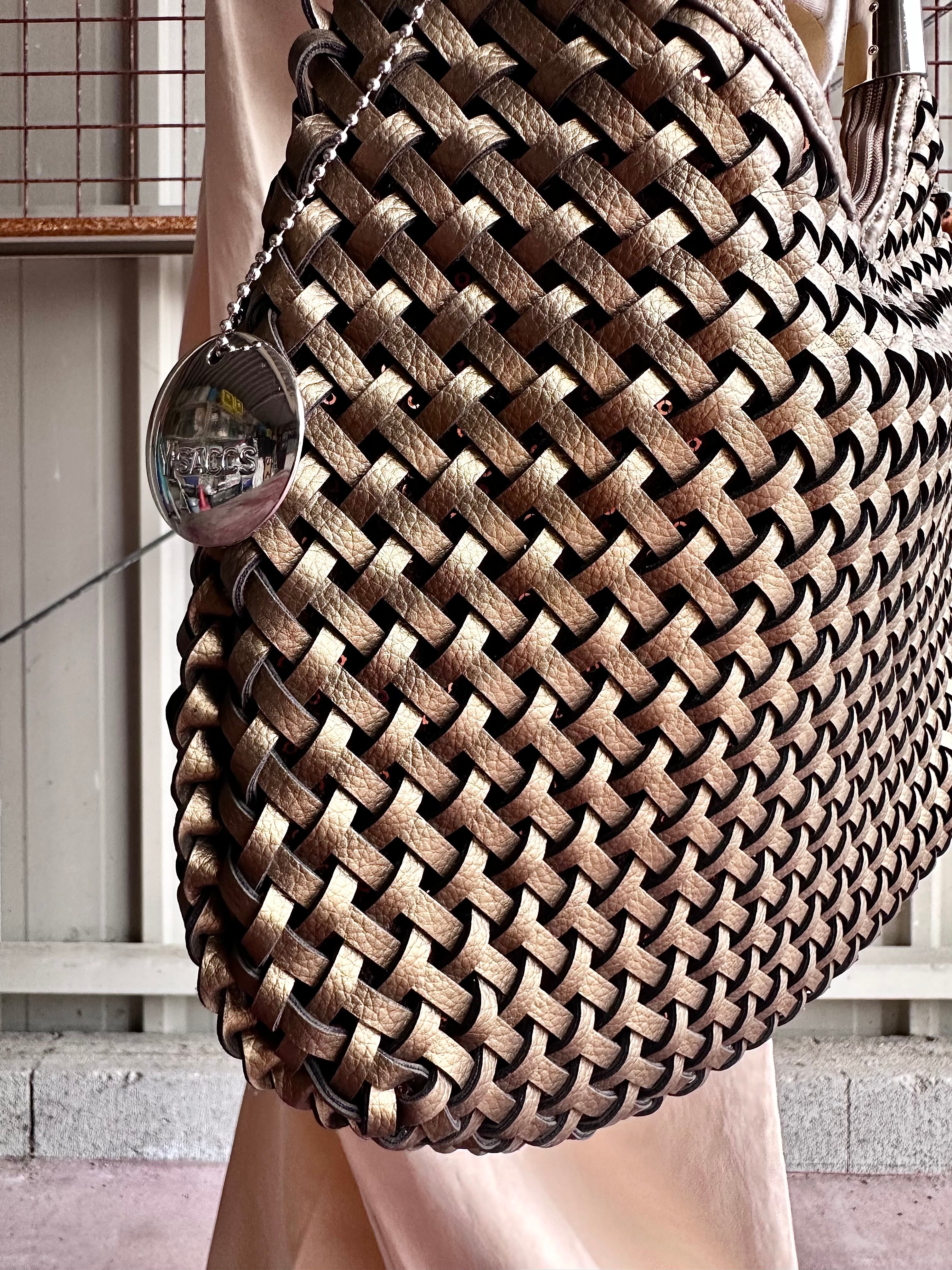 ボッテガヴェネタが世に広めた革細工技法ですが、このバッグではボッテガの様にピタリと短冊を敷き詰めたりせず、あえて隙間を空けた緩めの織り込み。