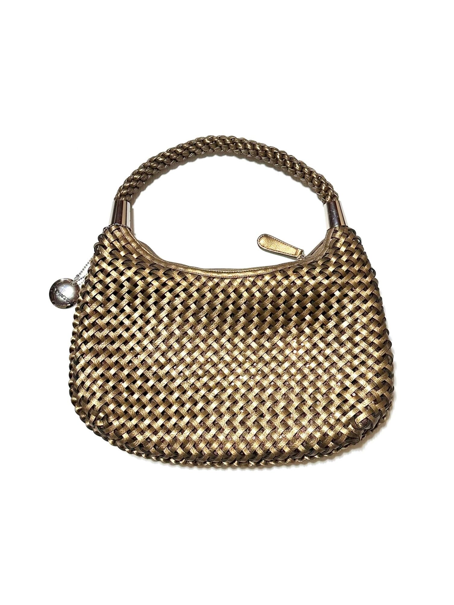 金塗りのレザー(人工か天然か今ひとつ判別付かず)のイントレチャートで仕立てられたハンドバッグです。