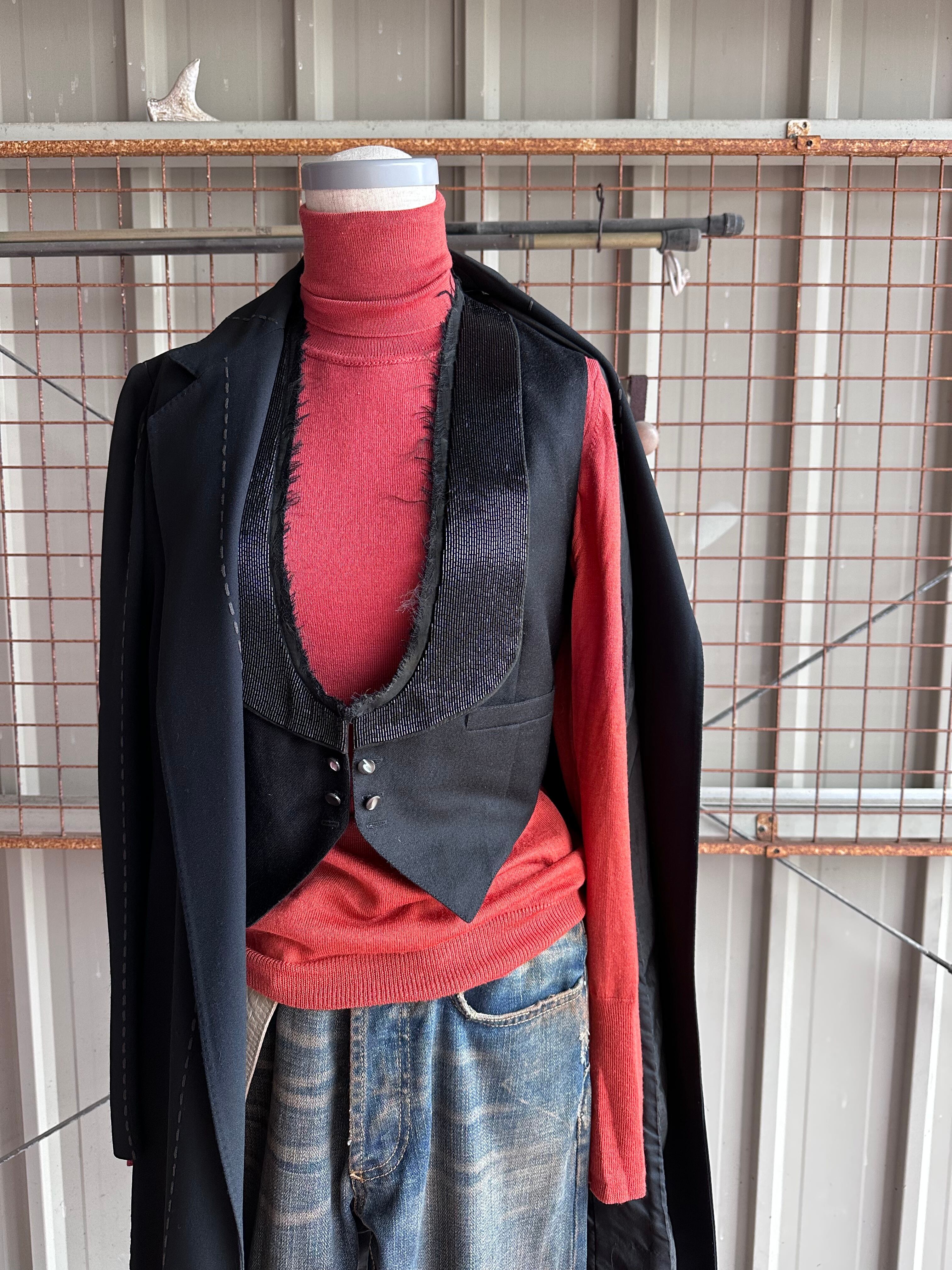 ラペル折れ線をカットアウトしたショールカラーのウエストコート。