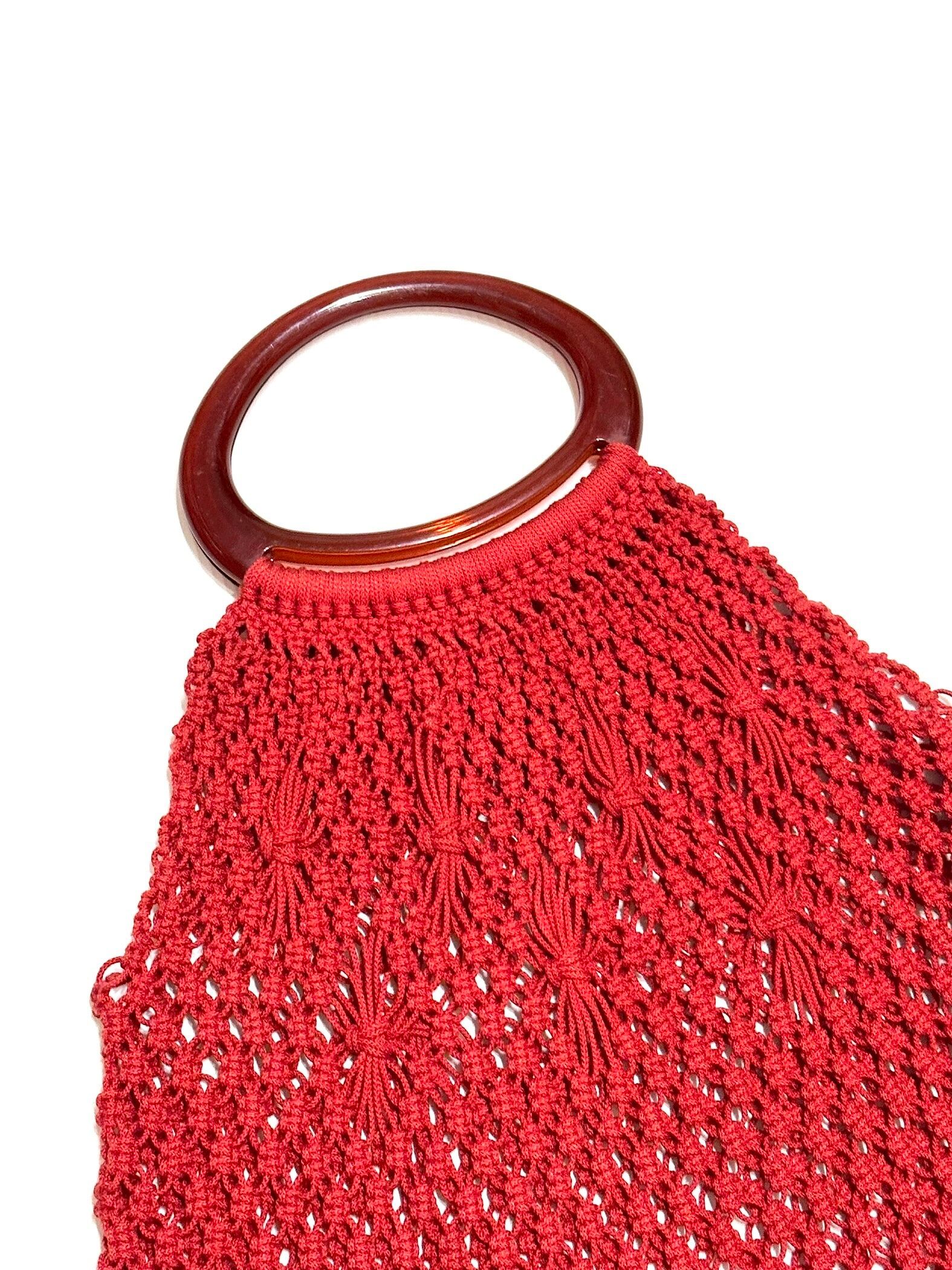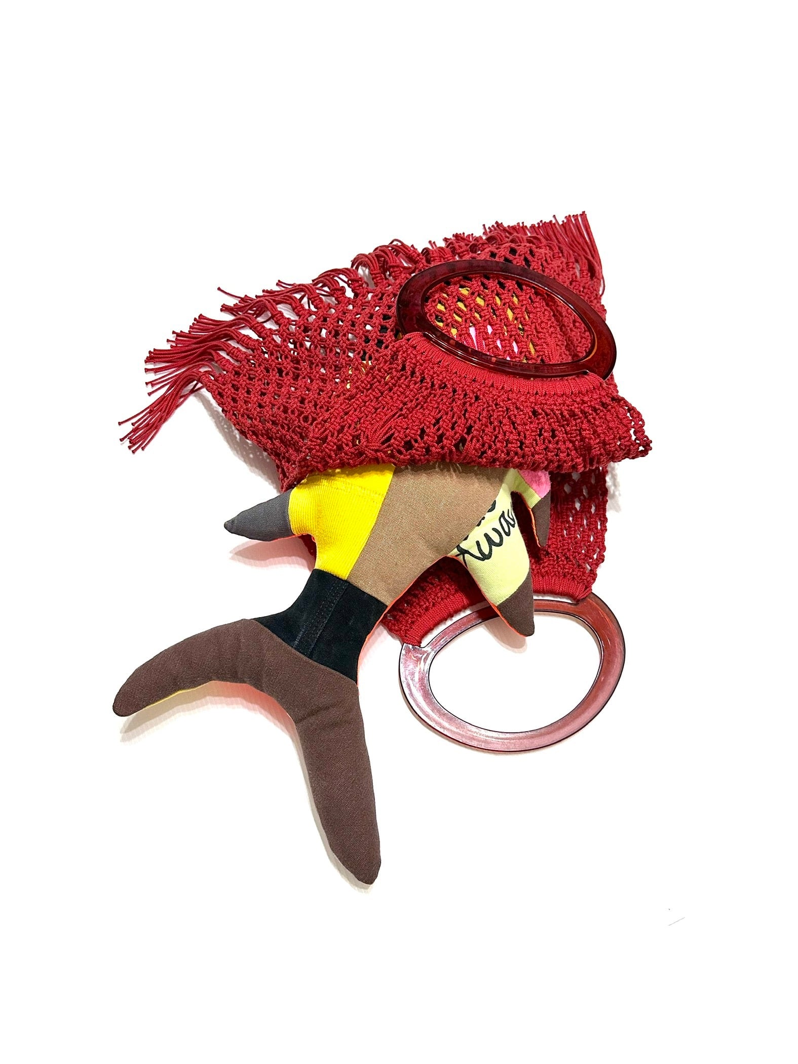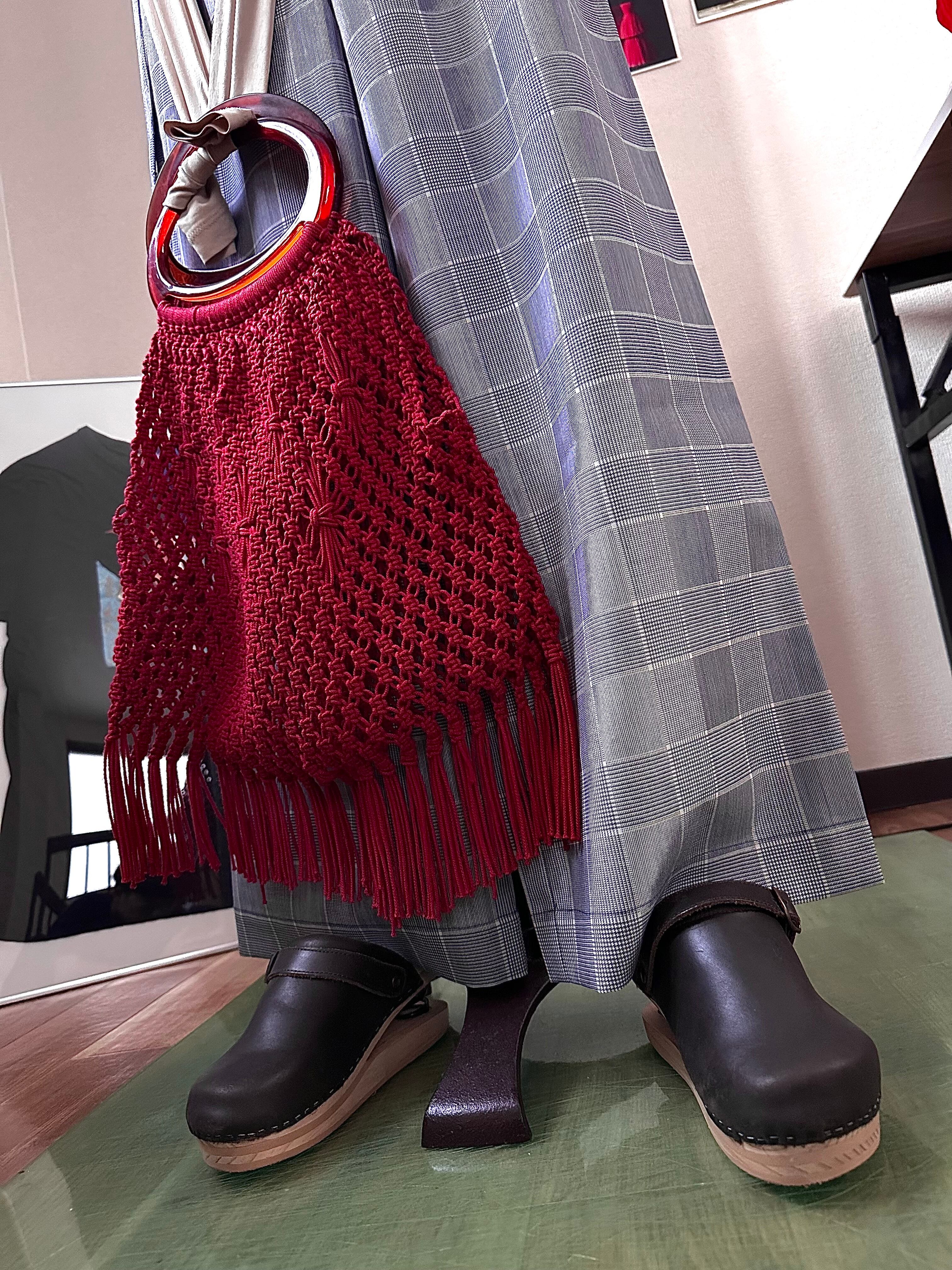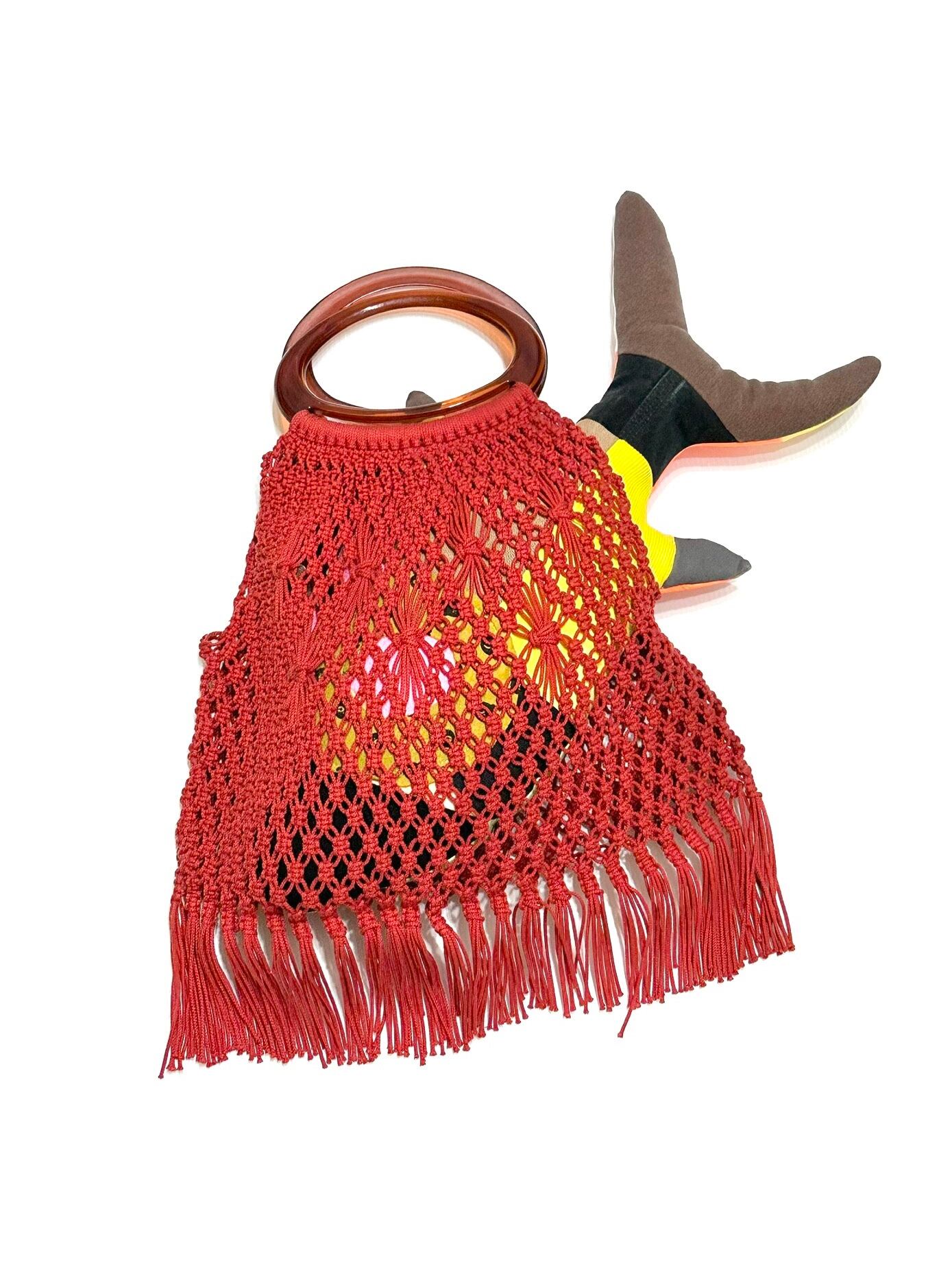 バッグボディの中程に部分的にあしらわれた藁人形みたいな編み変えがファンタスティック。