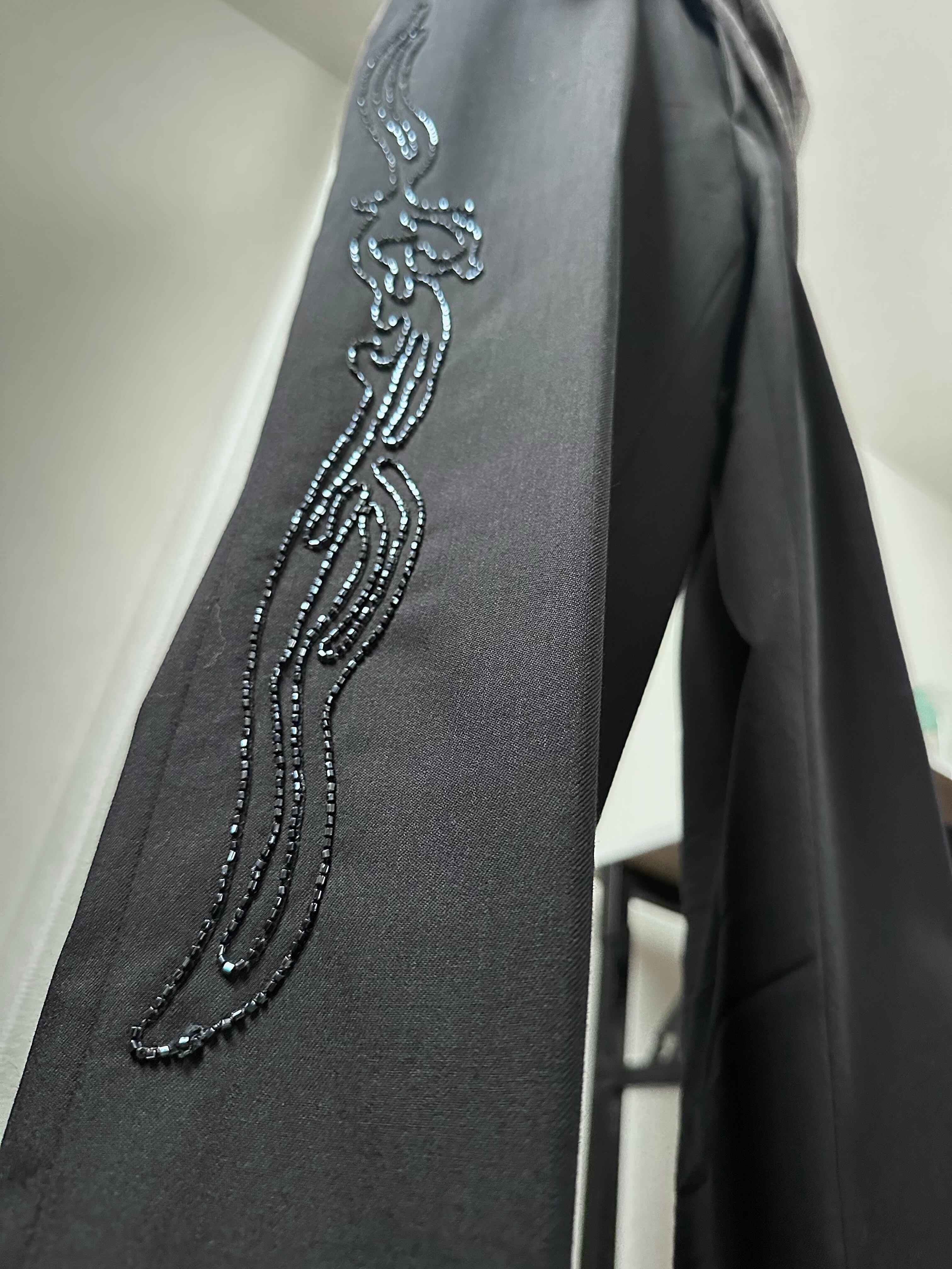 ボディ側面に左右非対称なガラスビーズ刺繍。