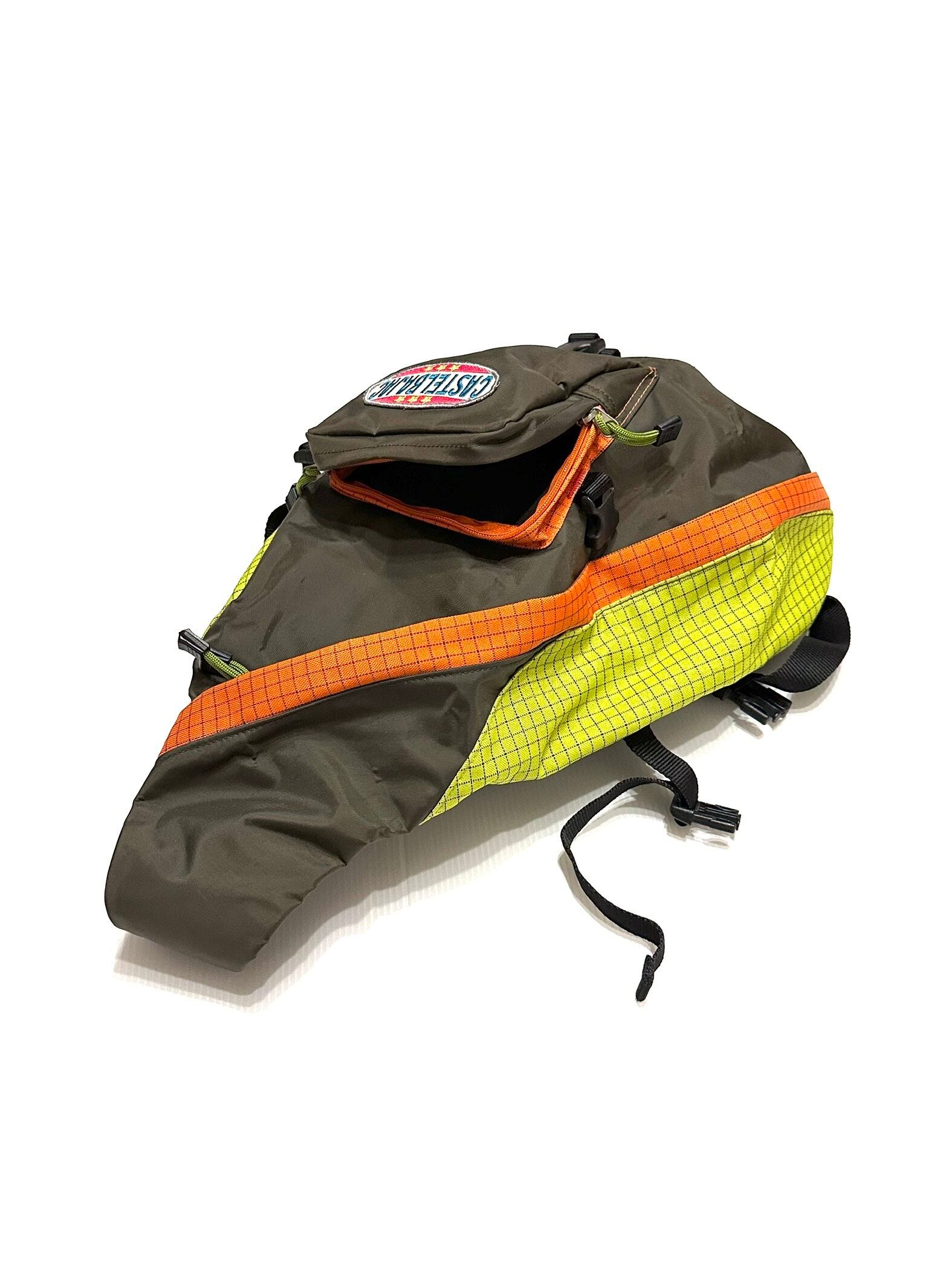バッグのボディ3辺を縛るアジャストベルトに加え、フロントもY字型ストラップ。