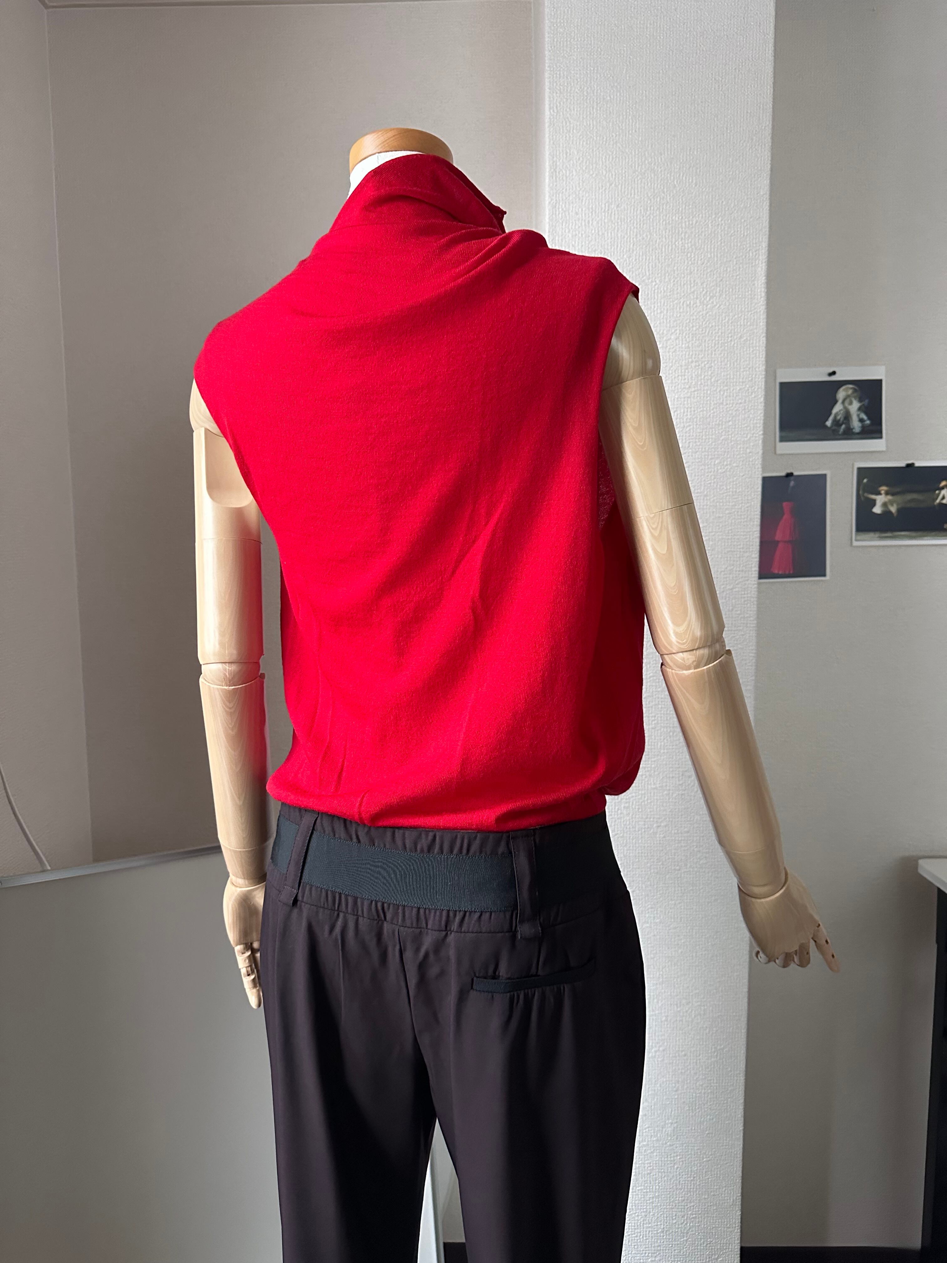 そんなカットを支える滑らかで柔らかな薄手のウールニット、ノースリーブとは言え 日本の夏には少し暑いです。