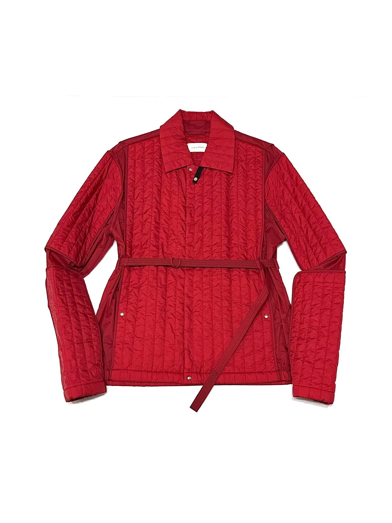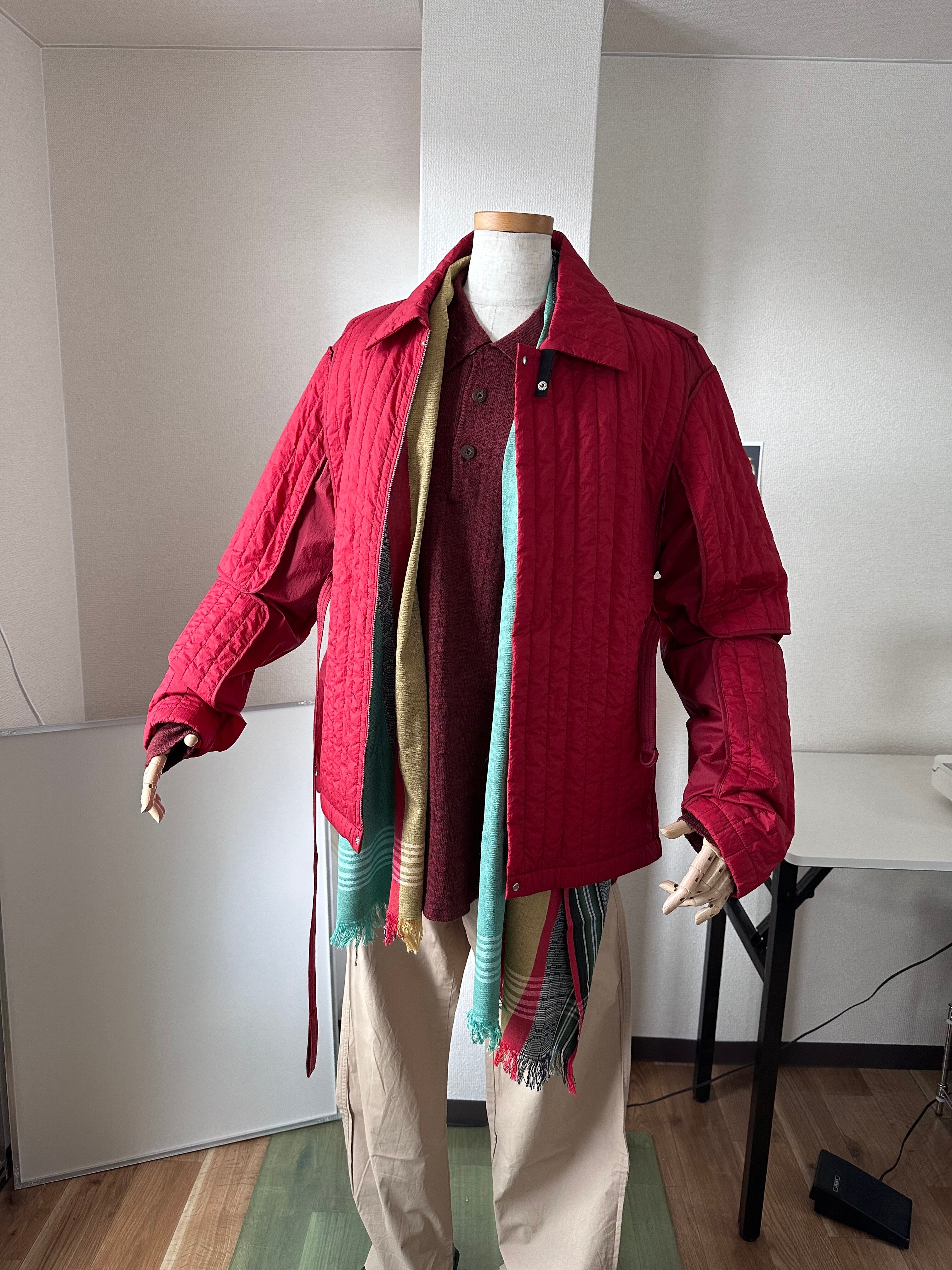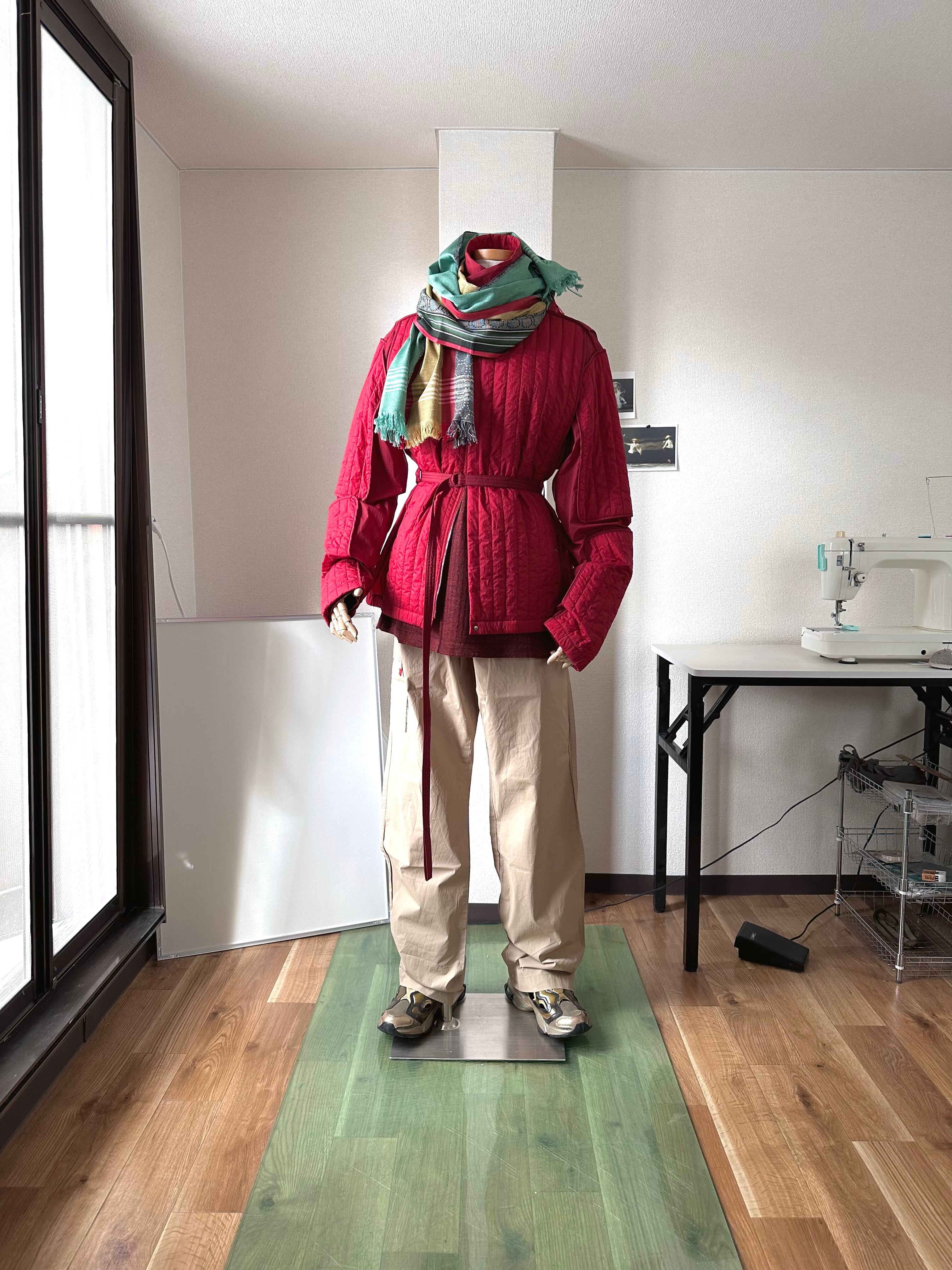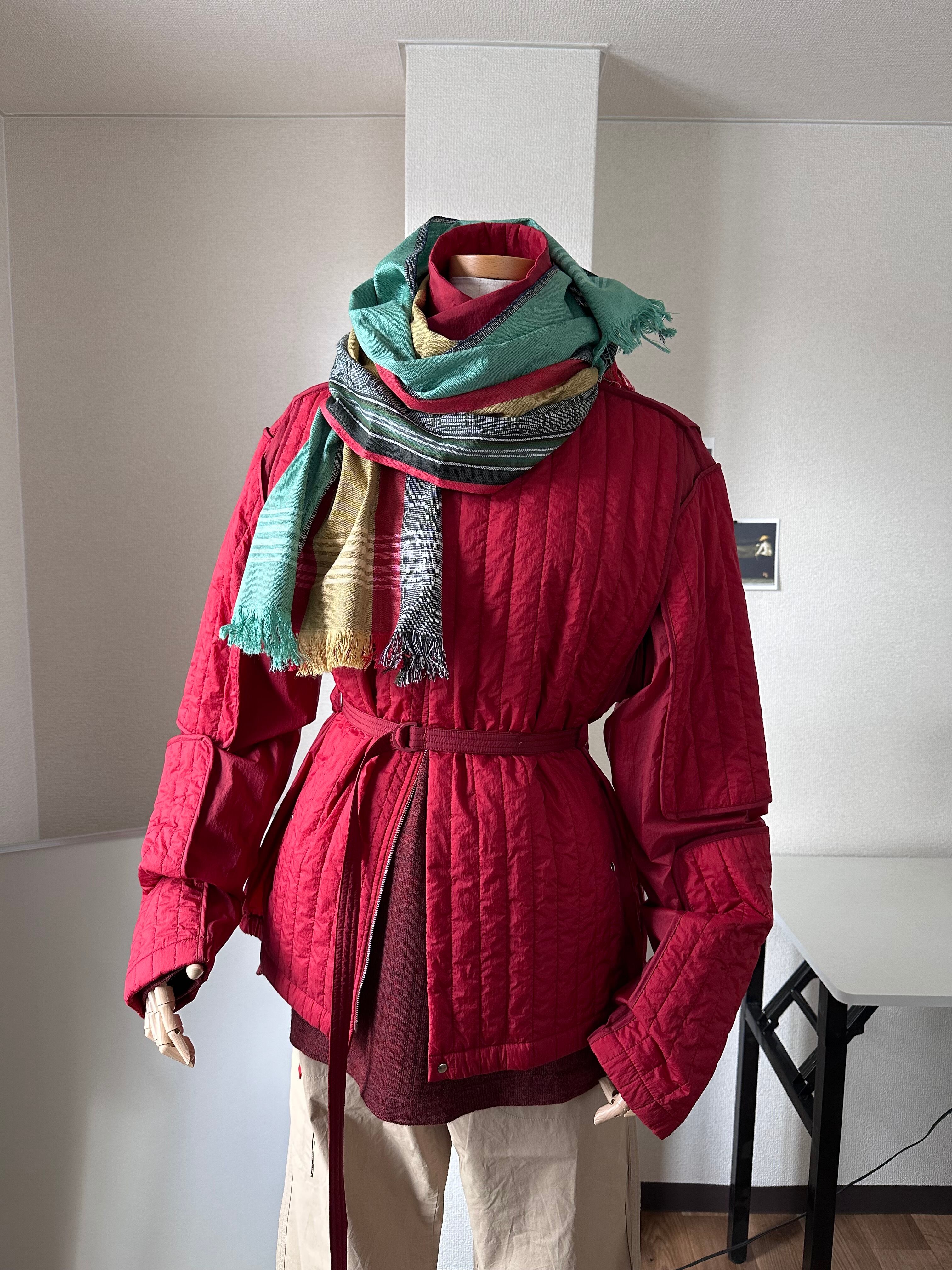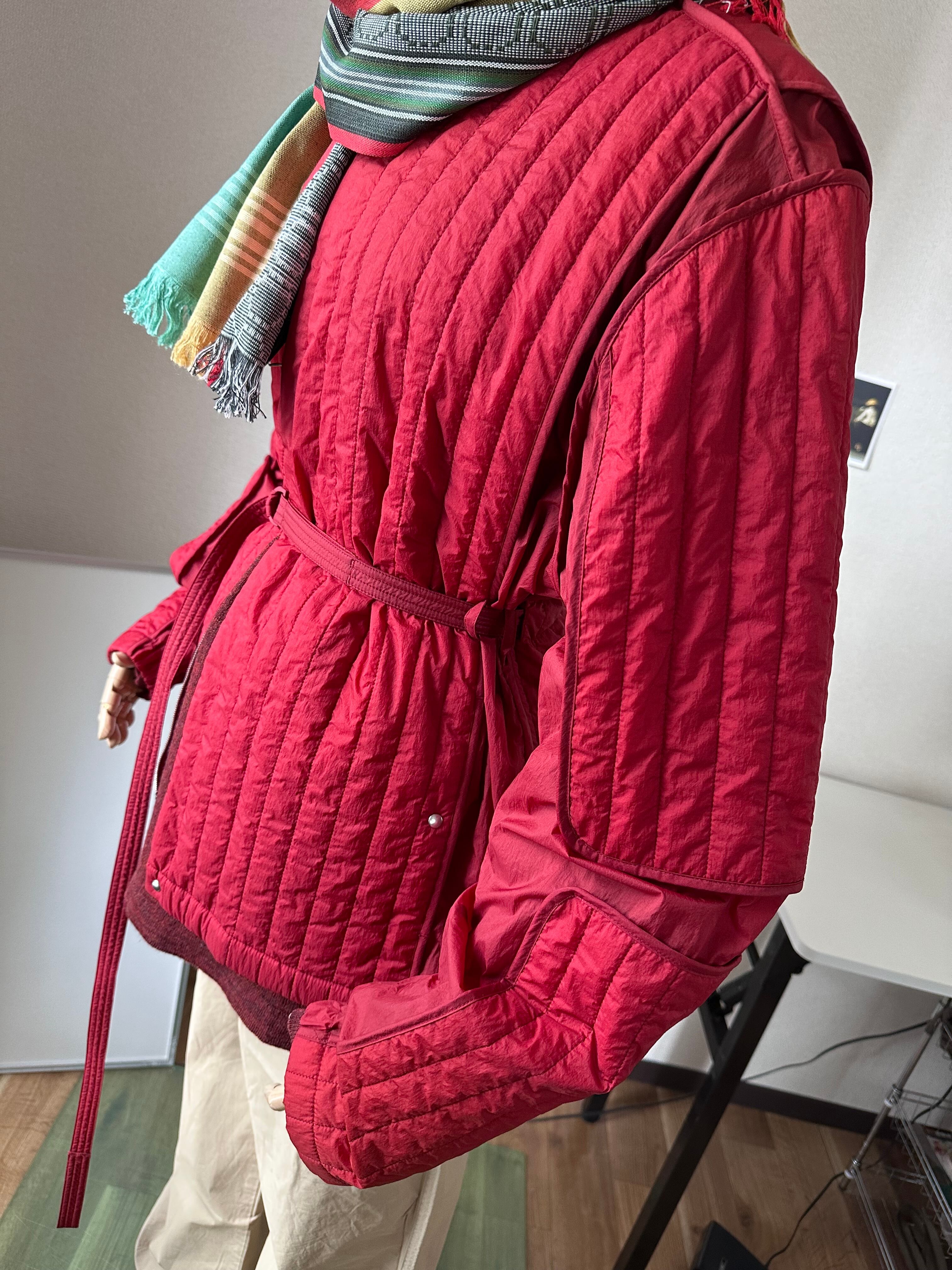 人体の可動域を避けるように敷き詰められるその配置とストライプ状のキルティングステッチが作る線のリズムは日本の甲冑/鎧のよう。