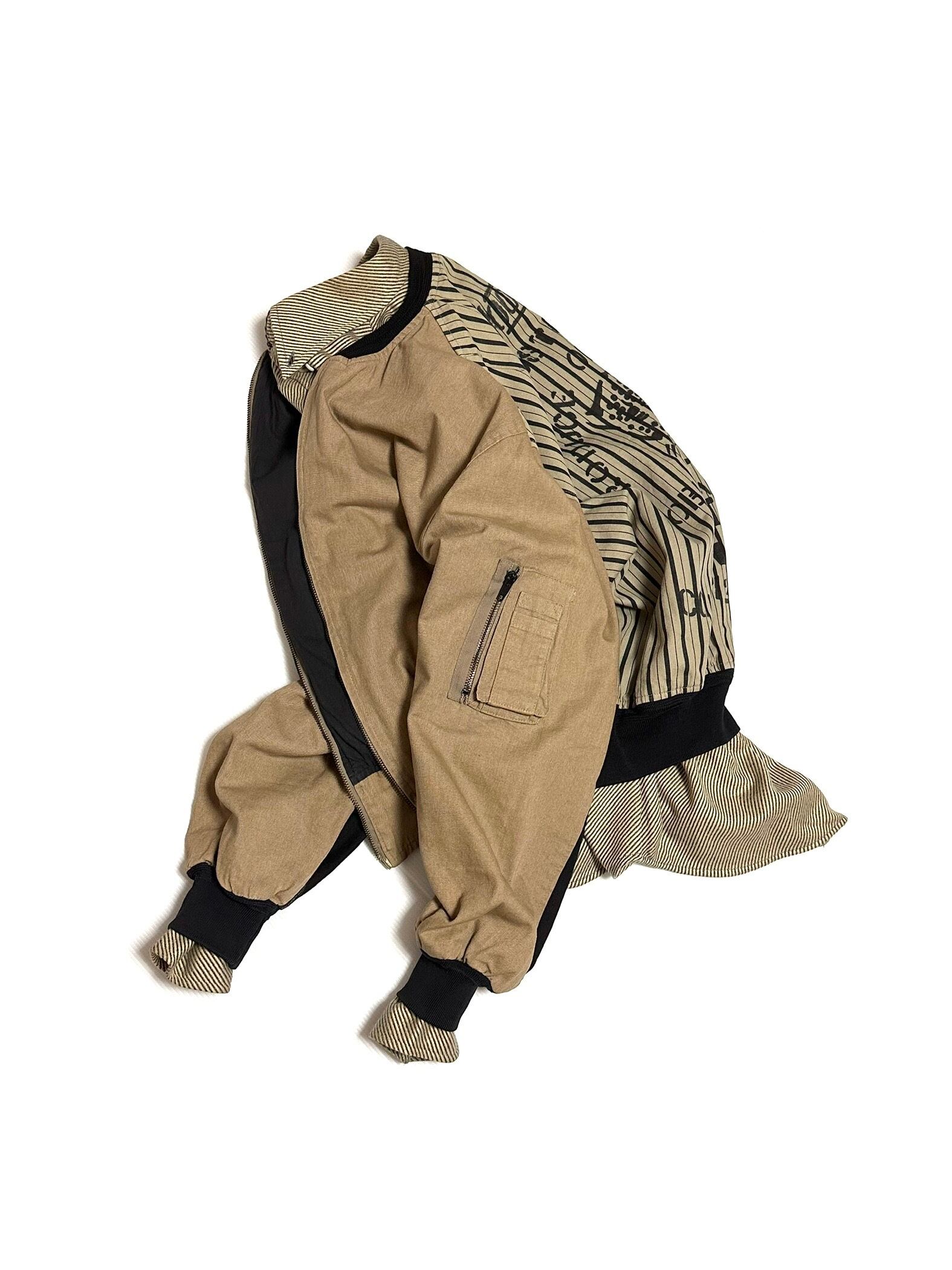 着丈と身巾がほぼ同寸のワイドなボンバージャケットに、強烈な異国情緒をトッピングしたデザイン。