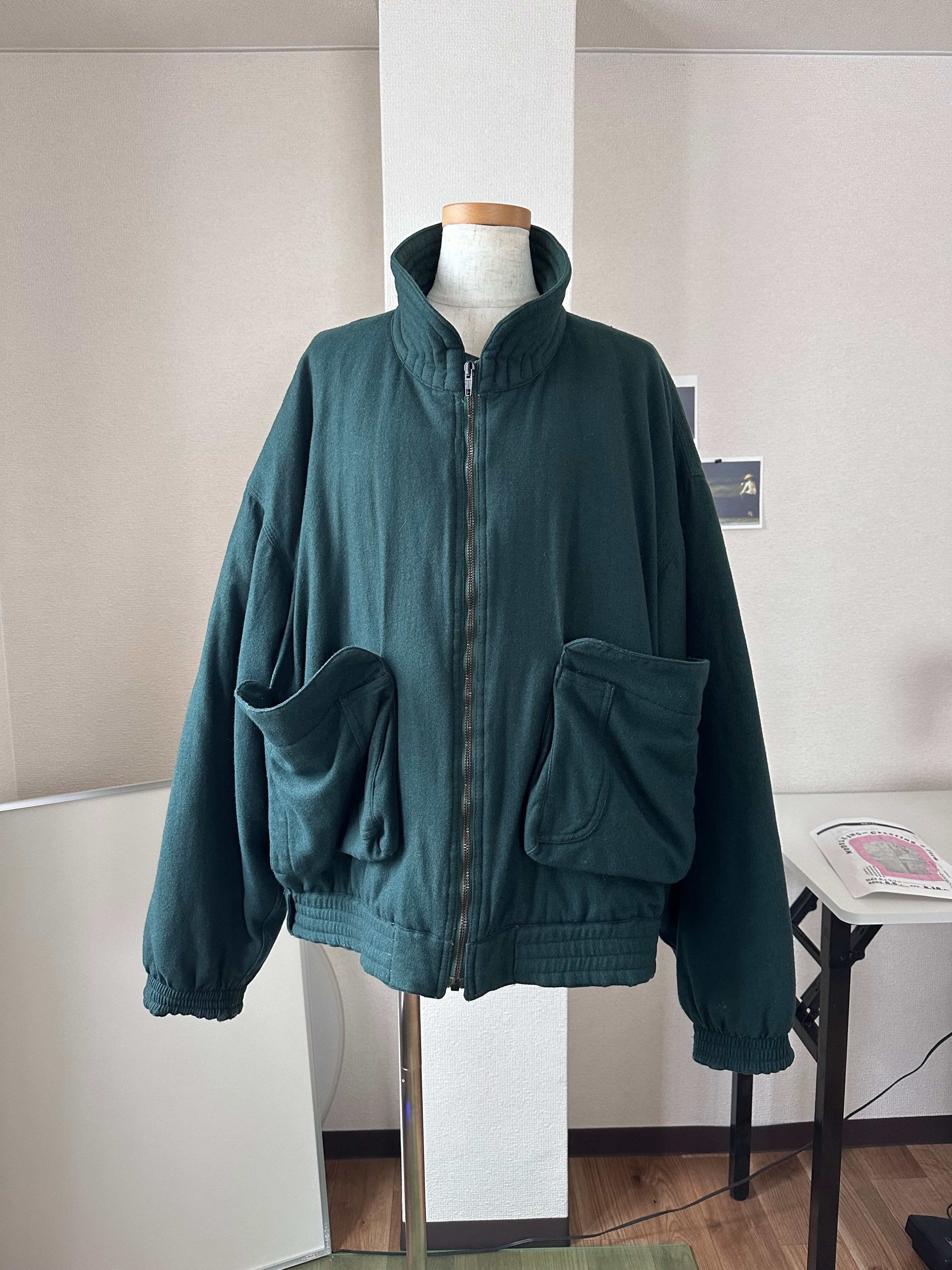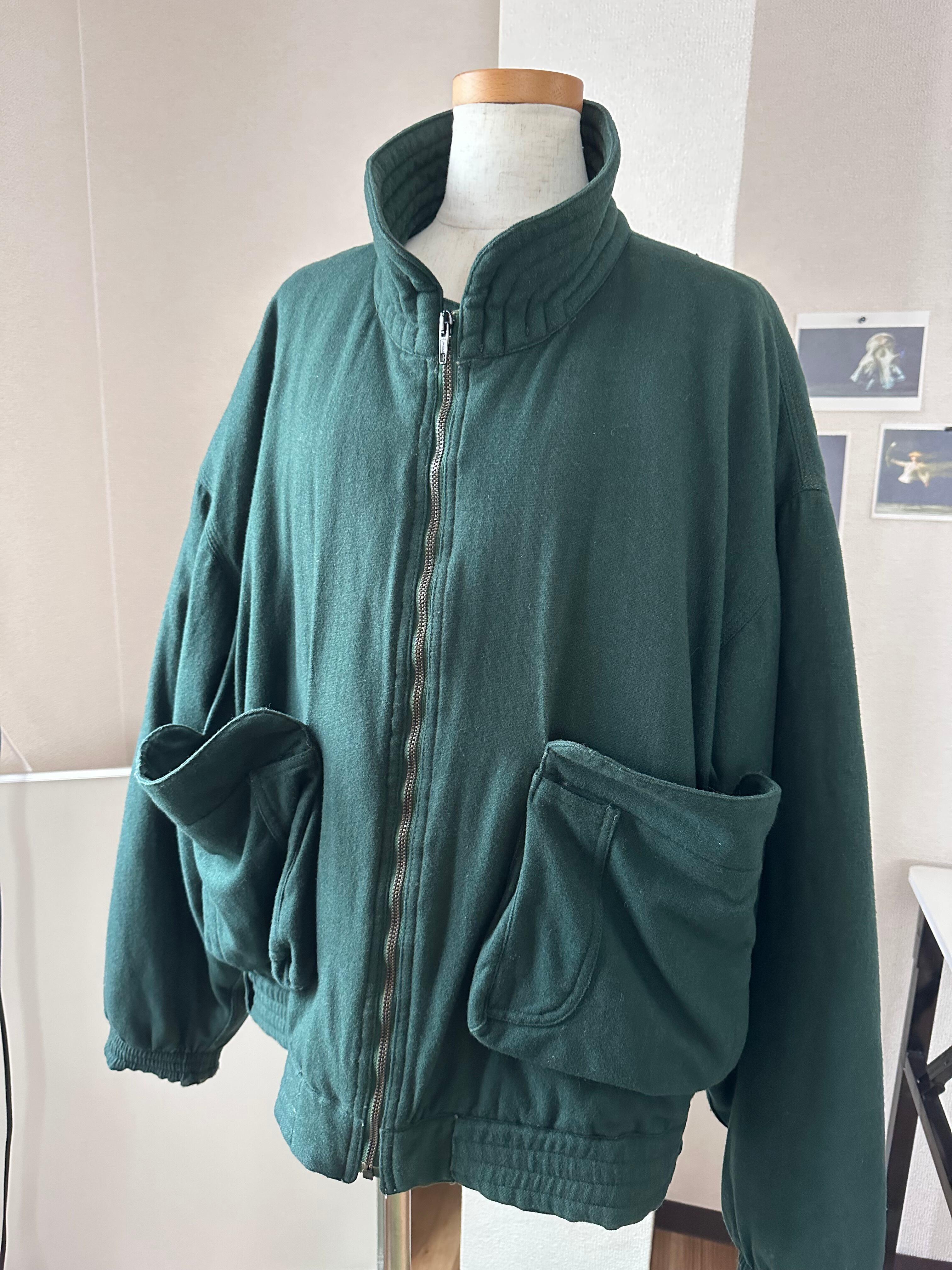 青みがかった上品なモスグリーンのウールシャモアで仕立てられたボックスシルエットのブルゾン。