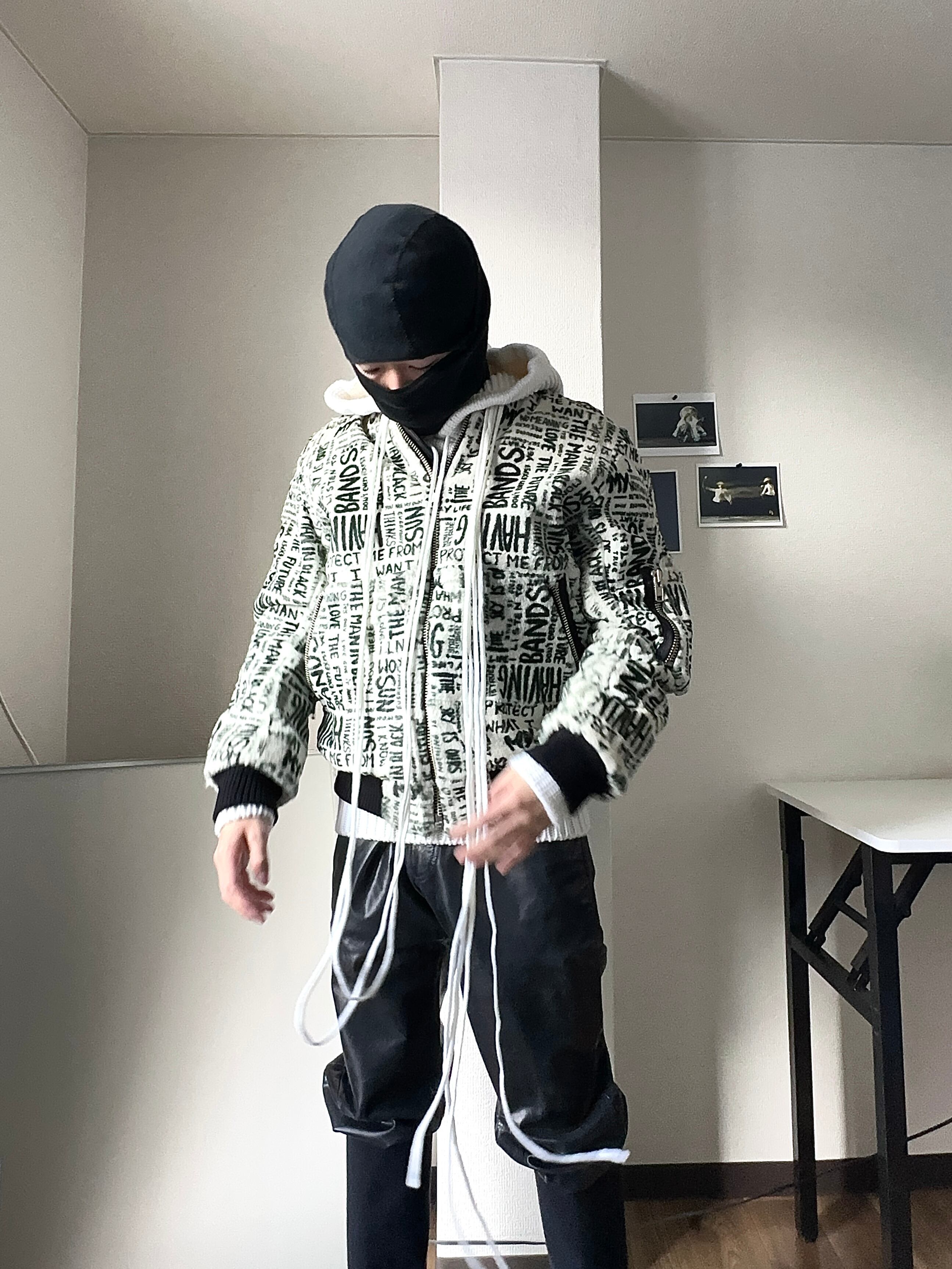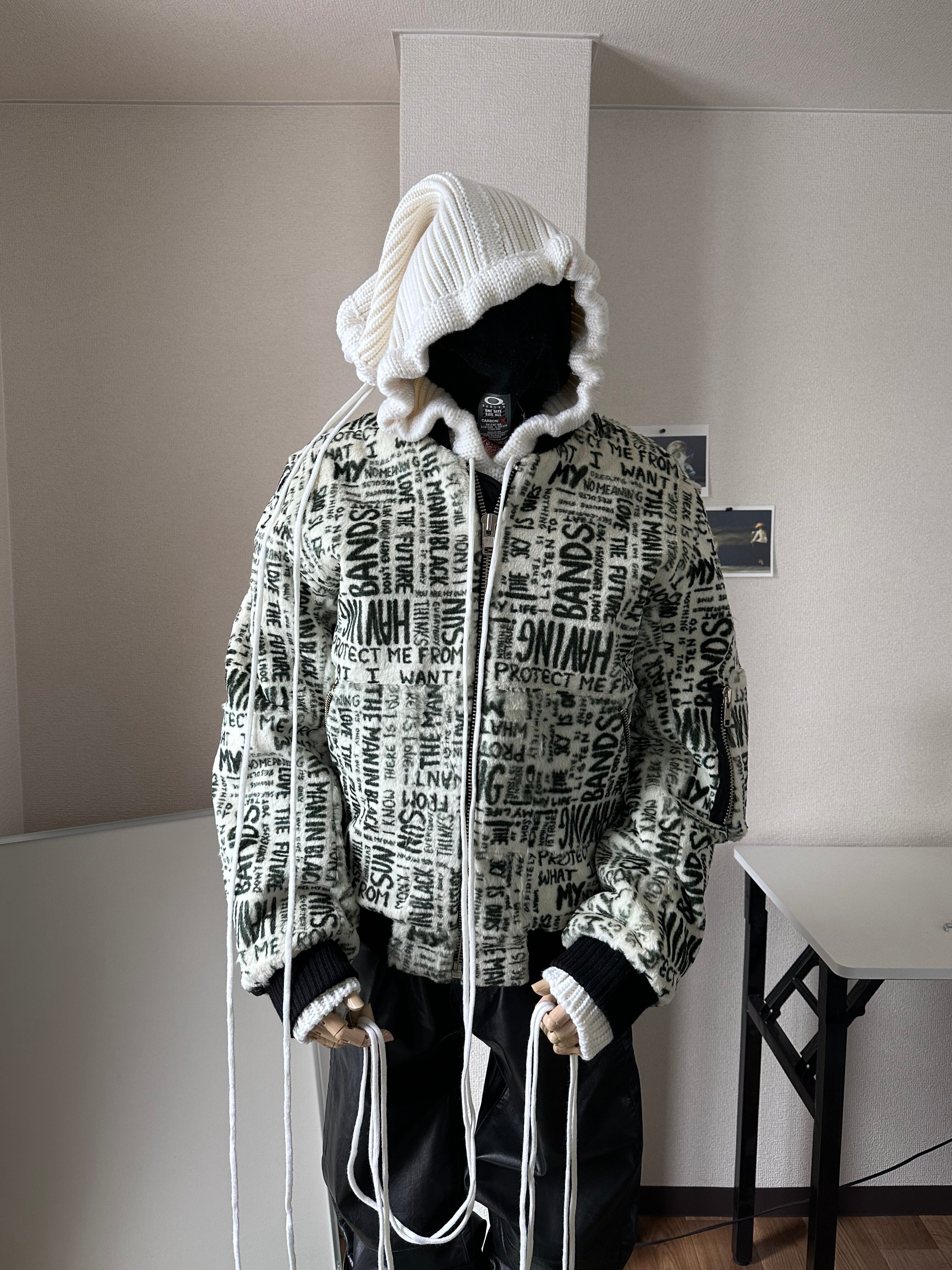その毛皮にはストリートグラフィティを思わせるテキストの不規則羅列プリント。