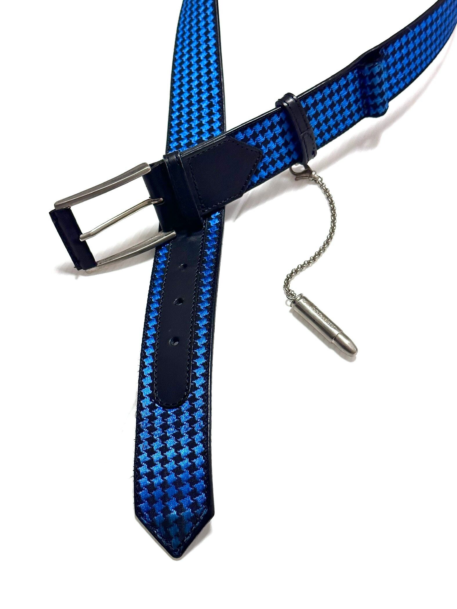 レザーボディのベルトに光沢のある青×黒ハウンドトゥースのテキスタイルを重ねた構造。