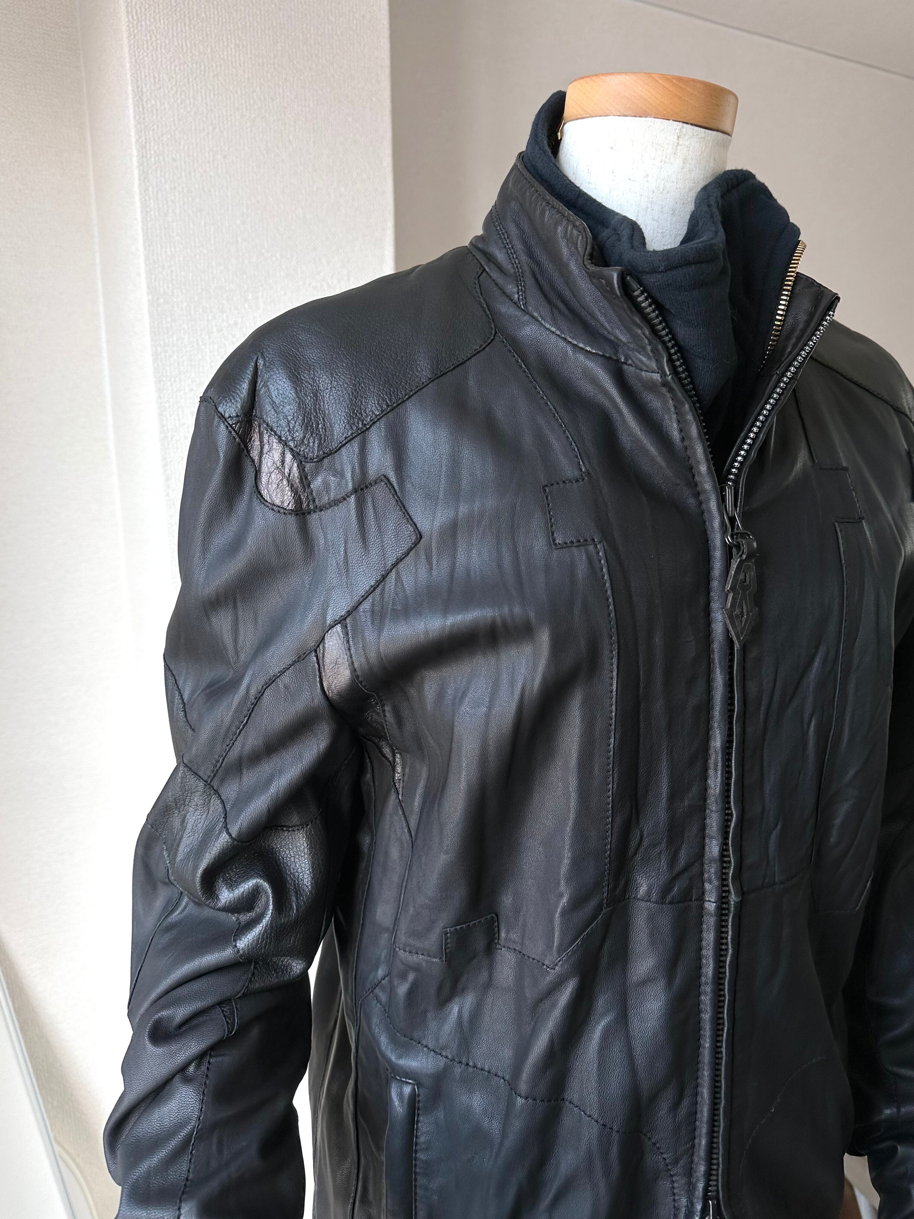 ベース自体は、割とオーセンティックなシングルブレストのライダースジャケットなのですが、こうも派手に暴れられるともう判らない。