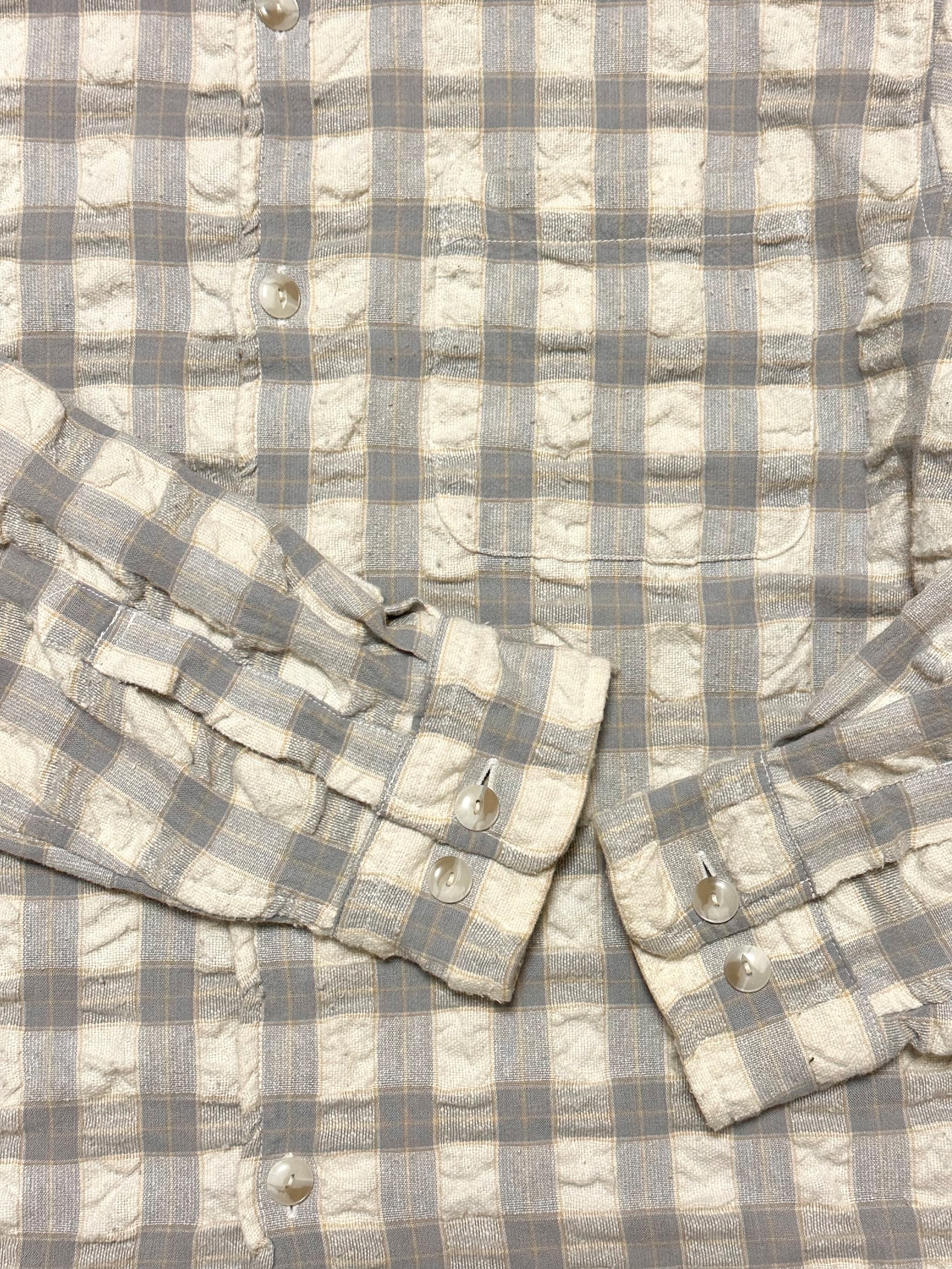 タータン調の線組みをベースに、縮率の違う素材をミックスして加工を入れることで規則的な柄出しとその柄に紐付いたシュリンクを生み出してます。