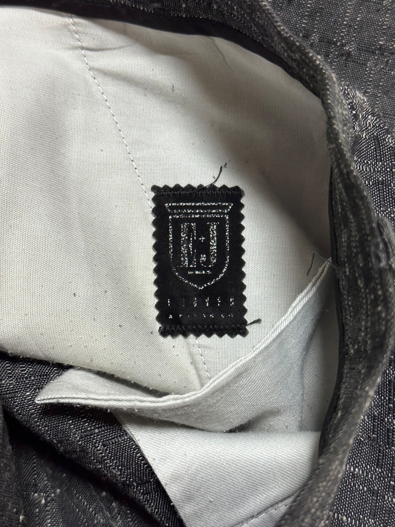 乾いたチャコールグレーの中に太い白糸を規則的に混ぜ込んだ絣っぽい生地。