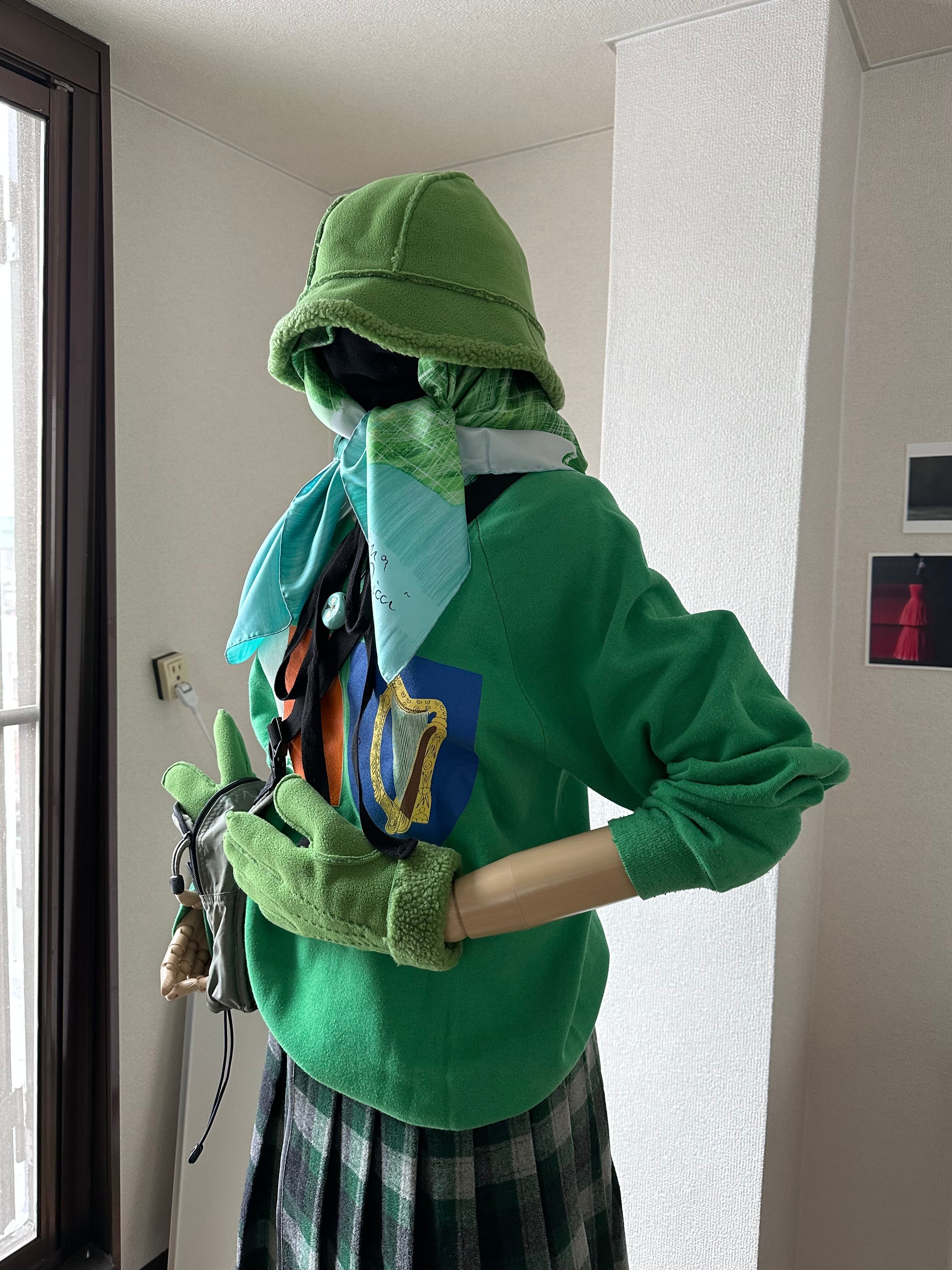 バケットハットとグローブのアンサンブル。