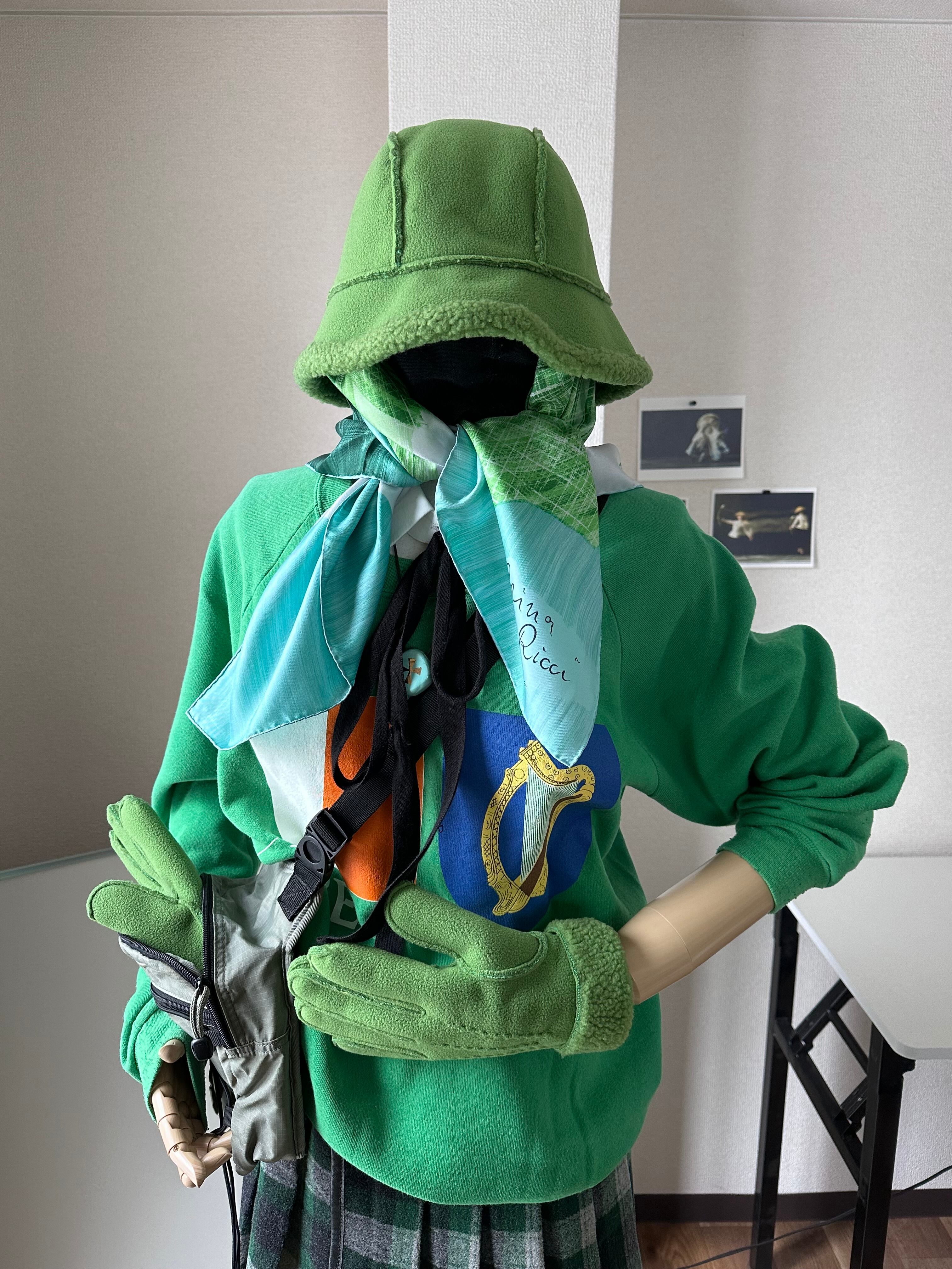 これ普通にスウェットとかにネックレス感覚で付けても良いんですけど、留める部分がリボンなのでパーカーのフードを被った上から巻いちゃっても成立するんですよね。