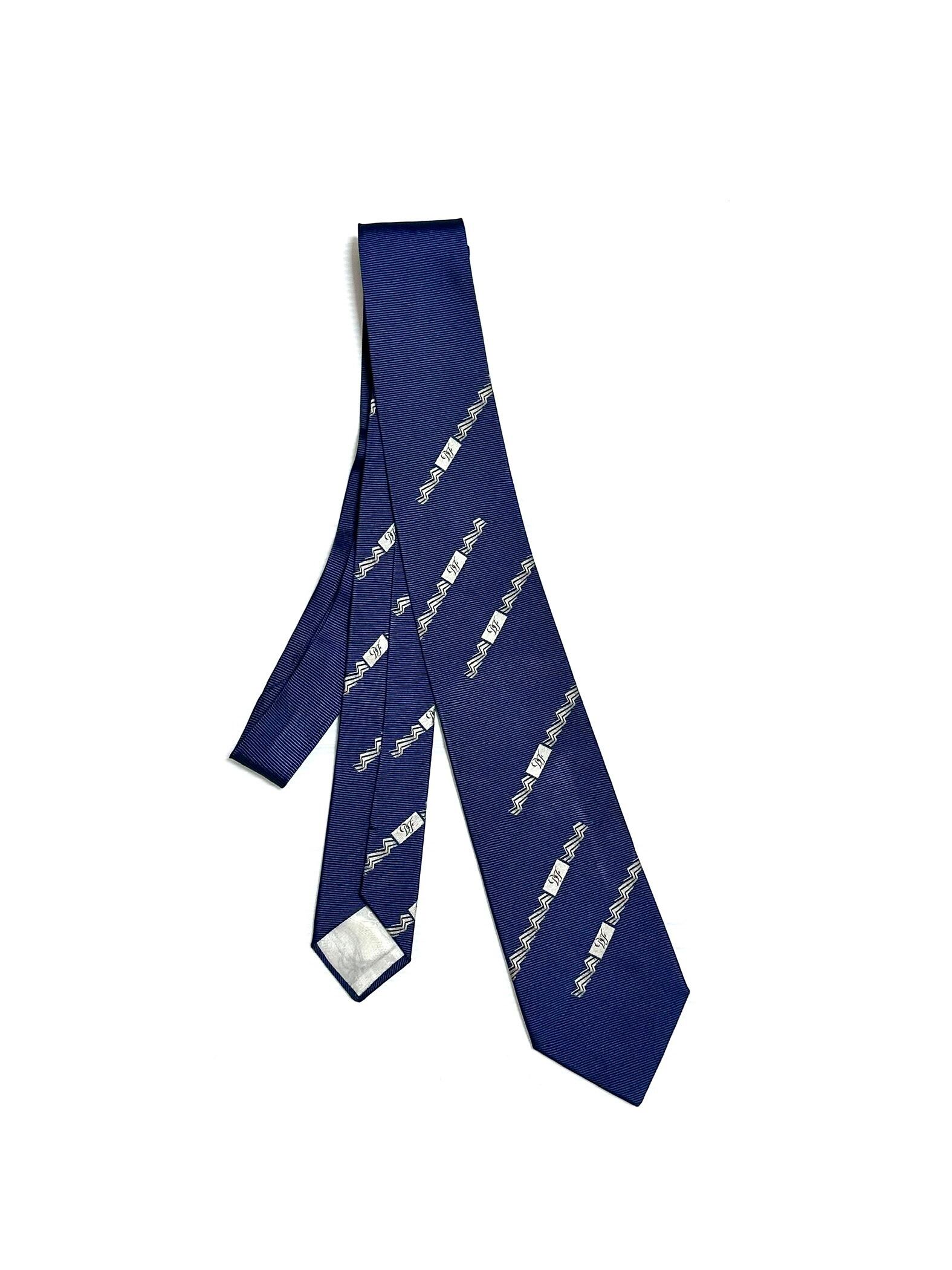 少しミルキーに濁した深く柔らかいネイビーに、変則ピッチでのロゴ入りレジメンタルストライプ。