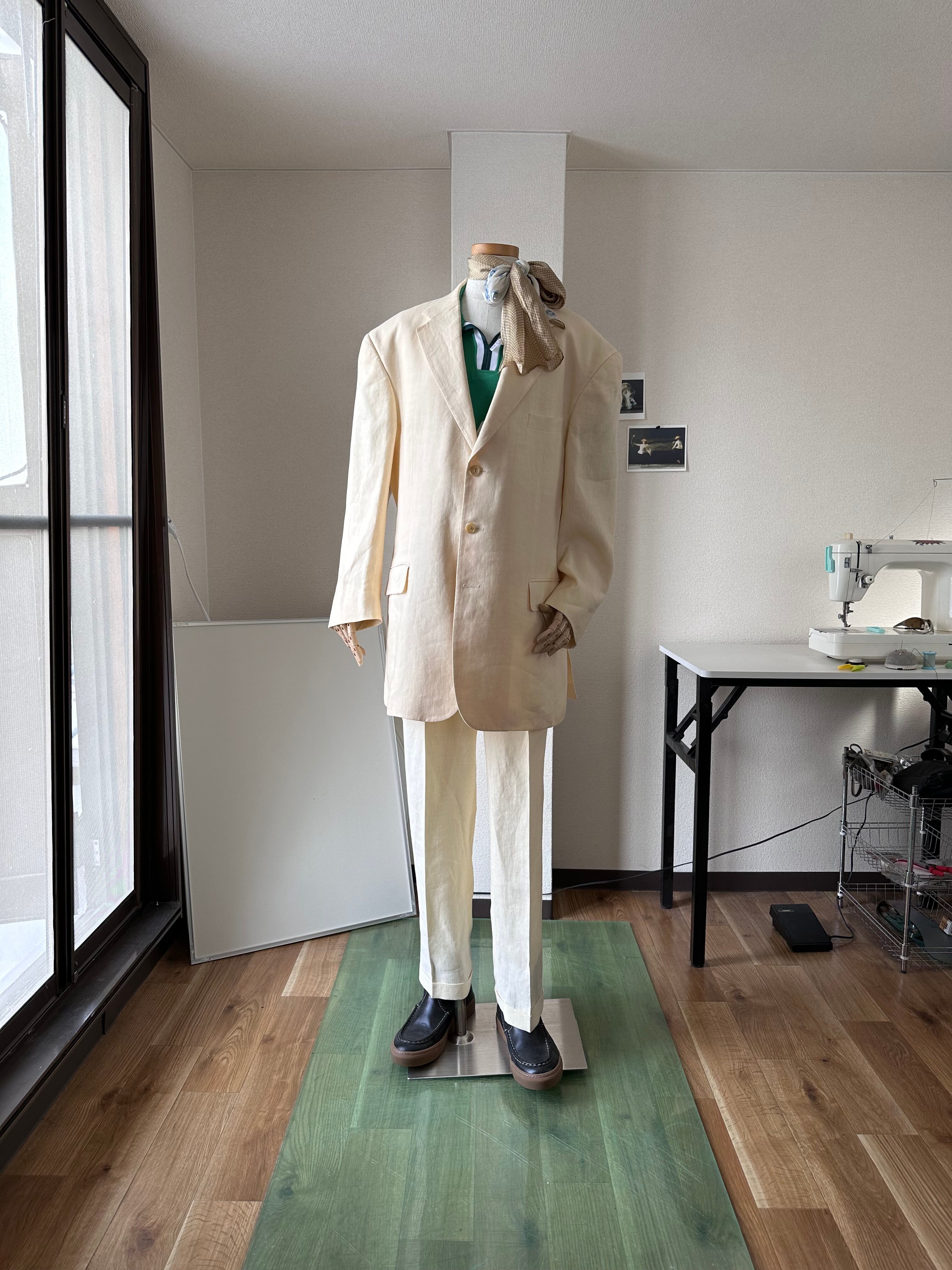 今回、極めて似た色/生地のリネンジャケットとセットで入荷出来そうなんですが、それぞれ型番とかサイズ感は全然違う別個体なのでセット購入はお薦めしません……。