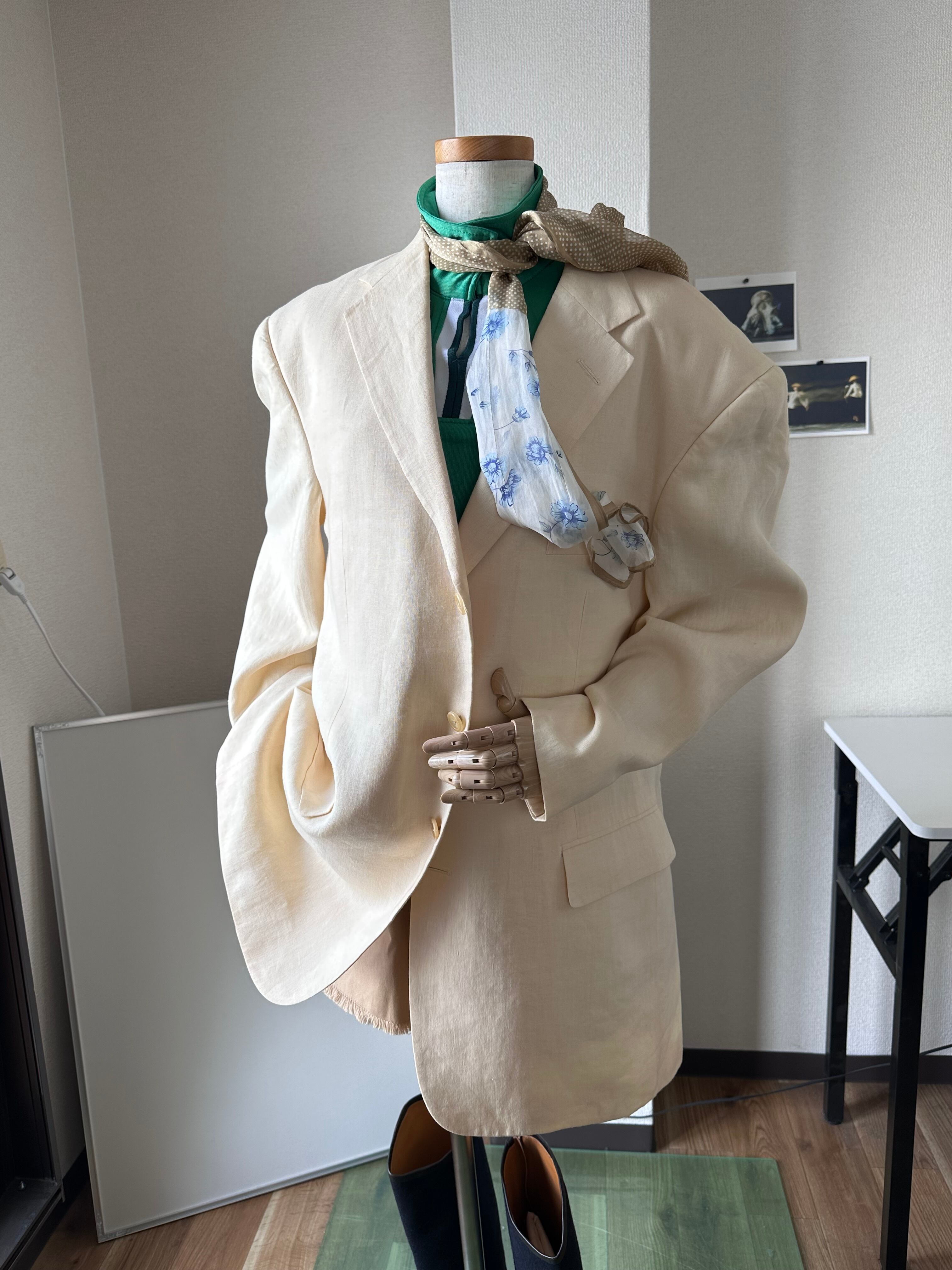 また、今回極めて似た色/生地のリネンスラックスが入ったので一応着せ付けてみていますが、型番もサイズ感も全然違うので、セットアップとしての御用意は叶いません……。
