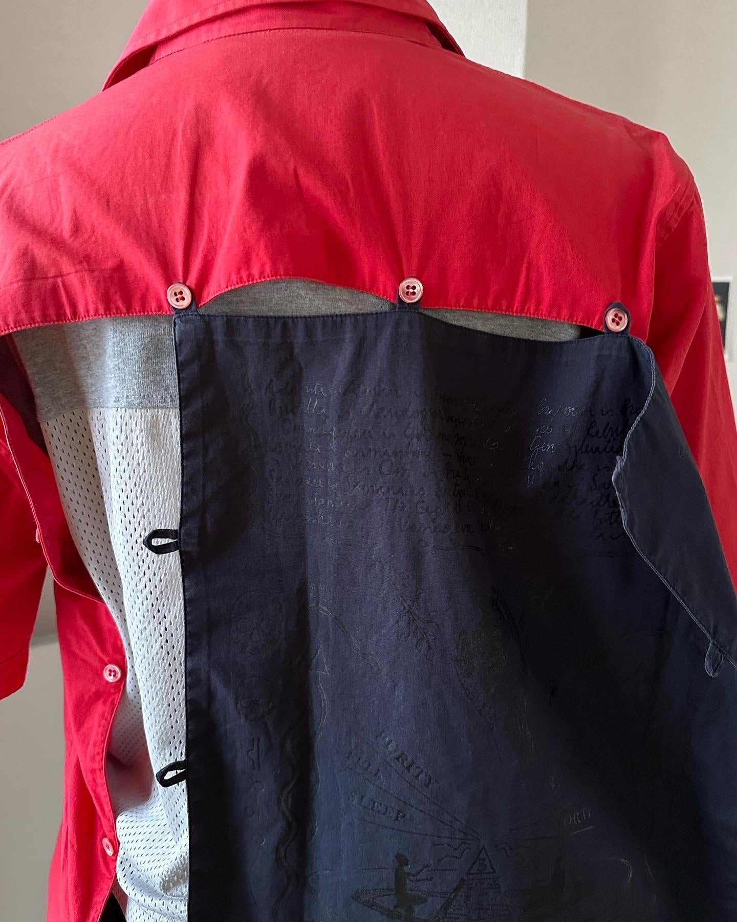 窓状に取り外せるバックパーツが付属した半袖シャツ。
