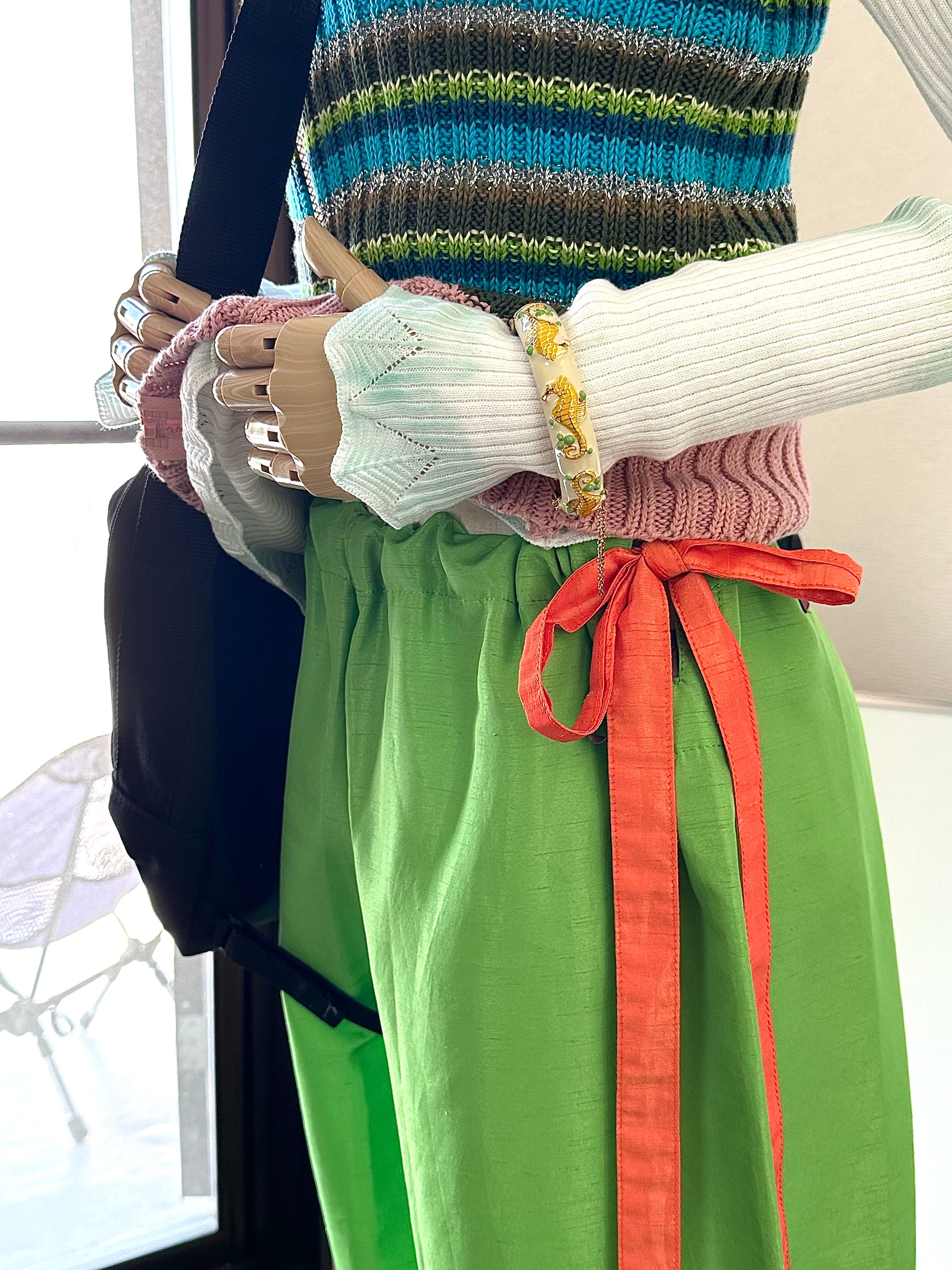 斑らに洗いエメラルドグリーンが染め散らされたランダムダイ。