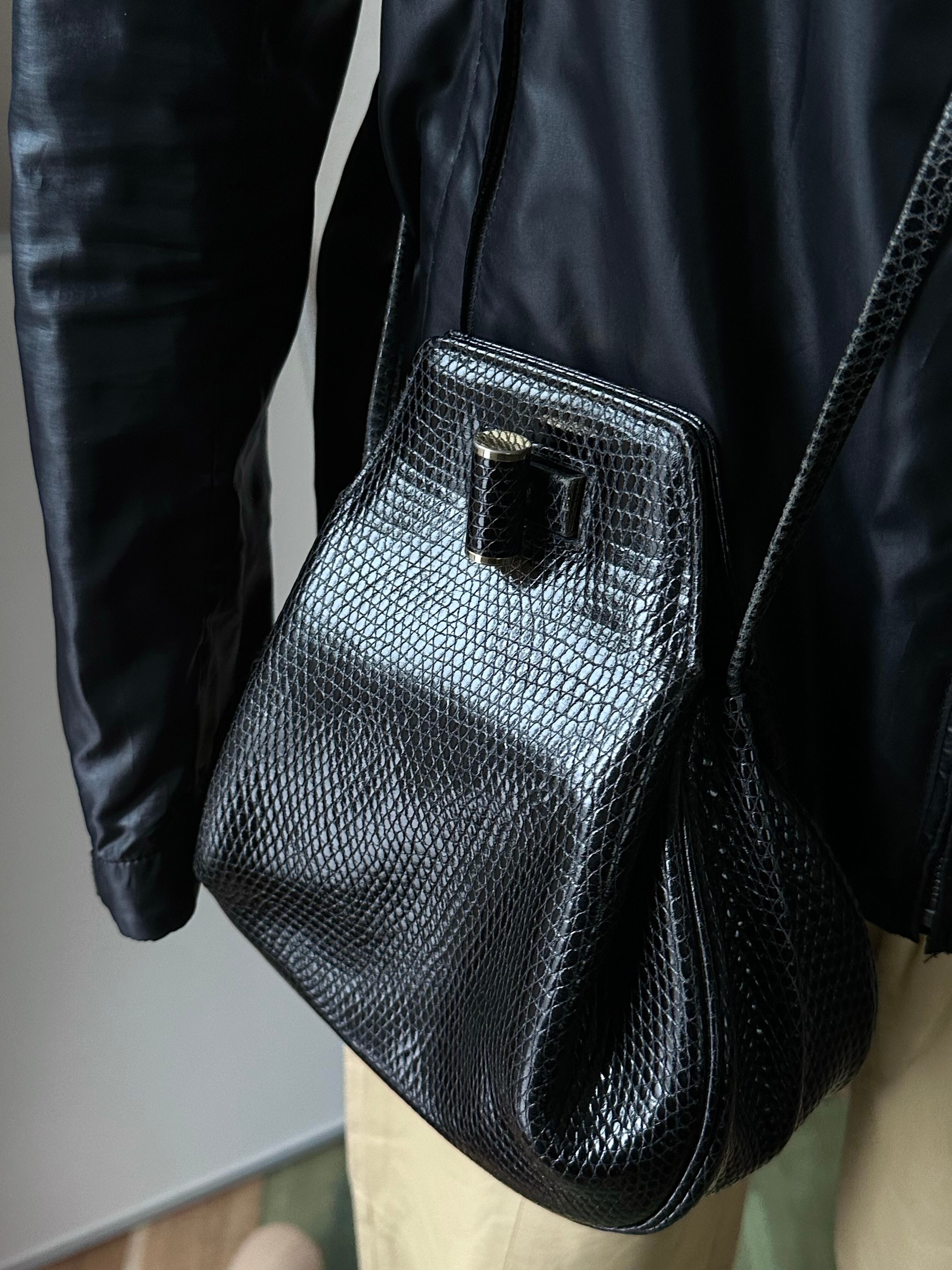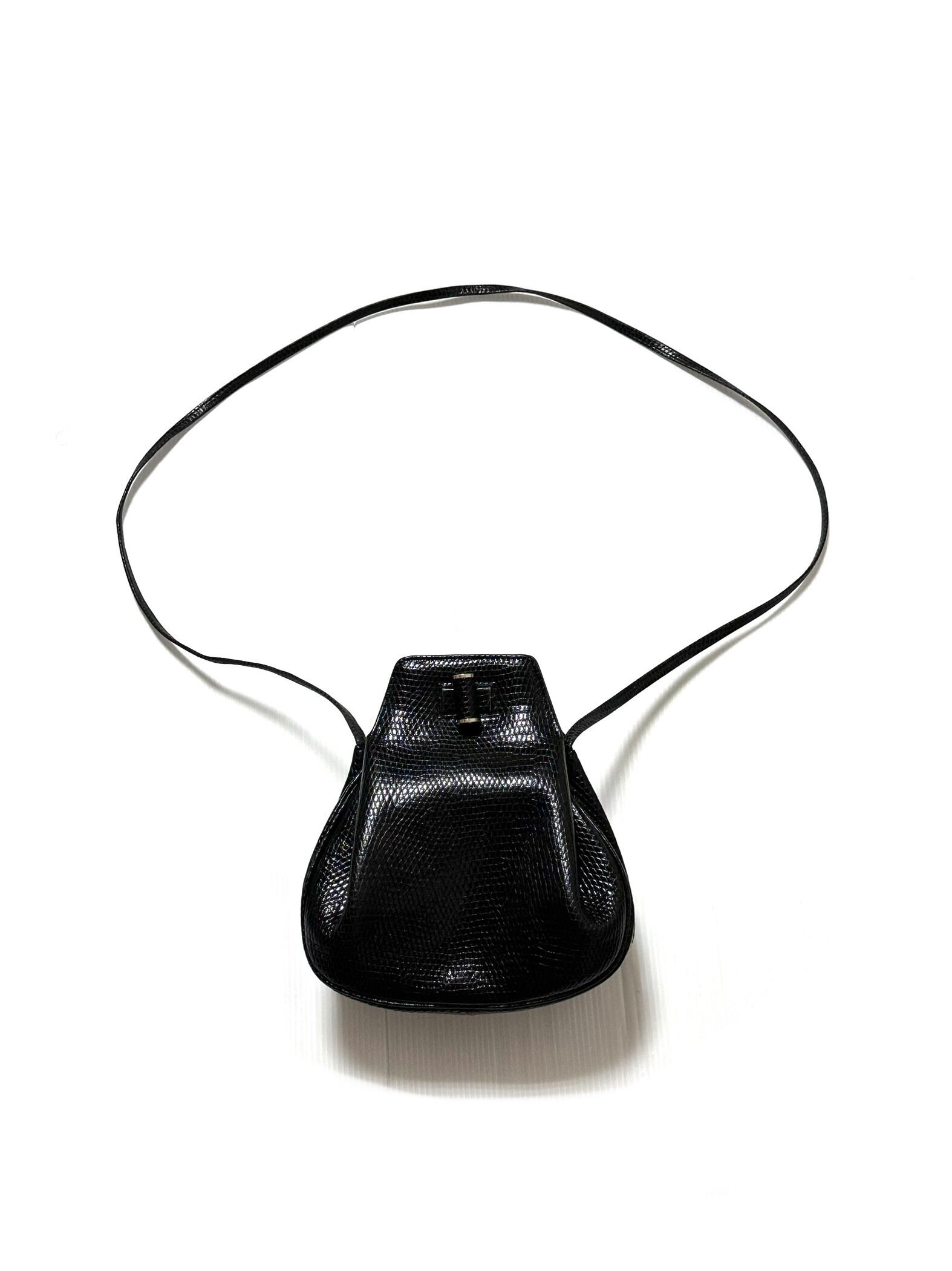 鱗の敷き詰められた美しい皮目を型押ししたブラックレザーの仕立て。