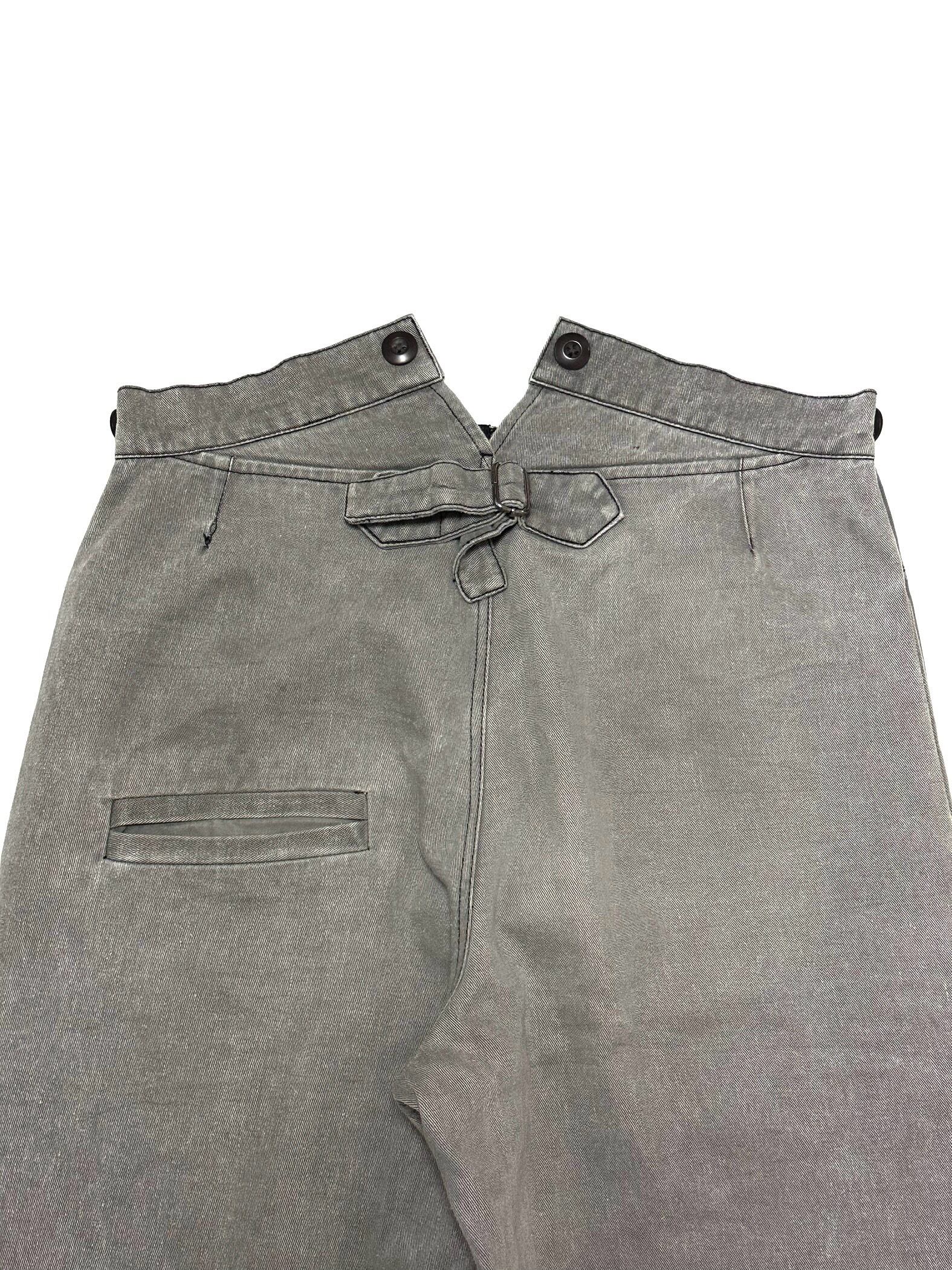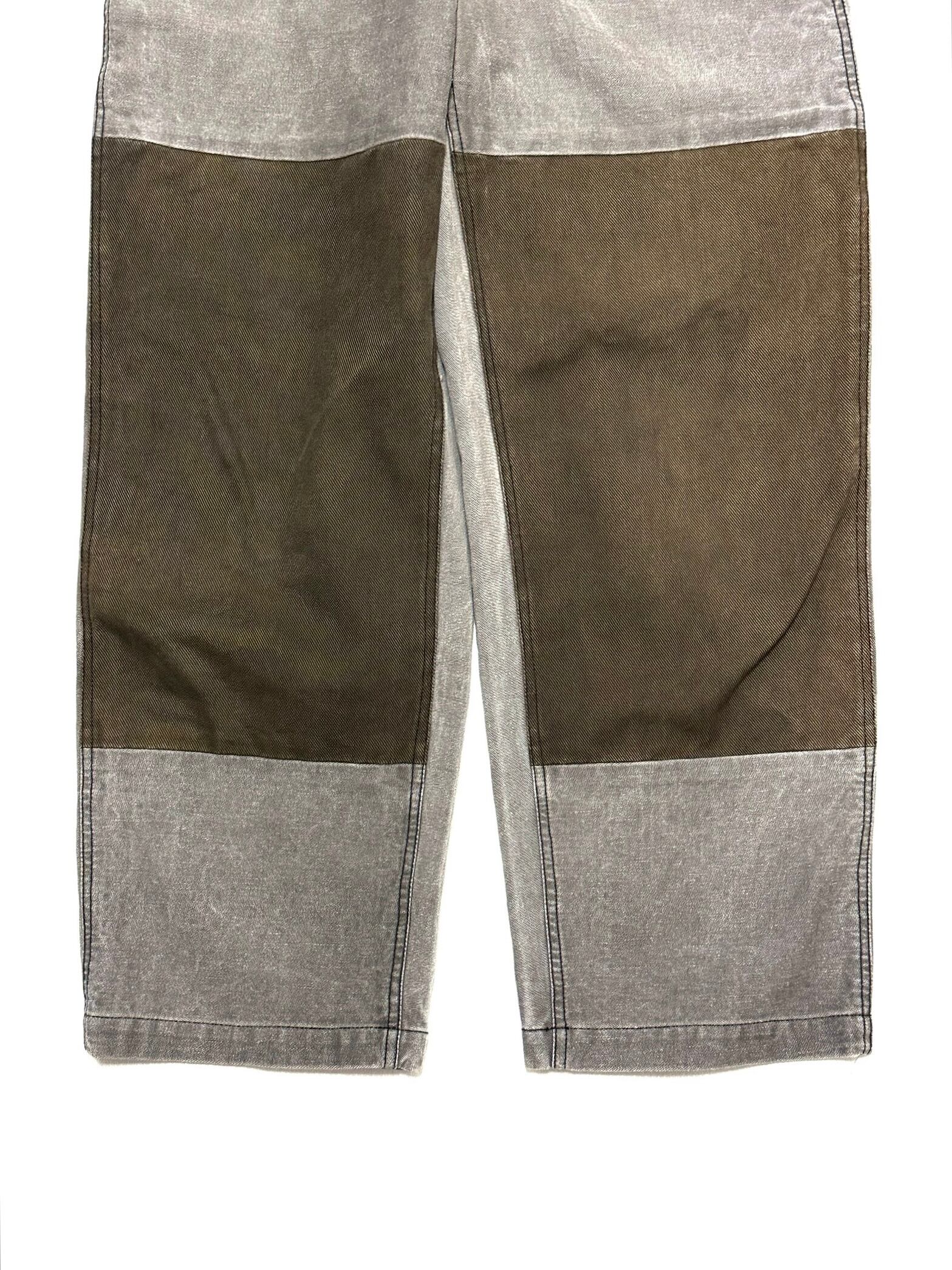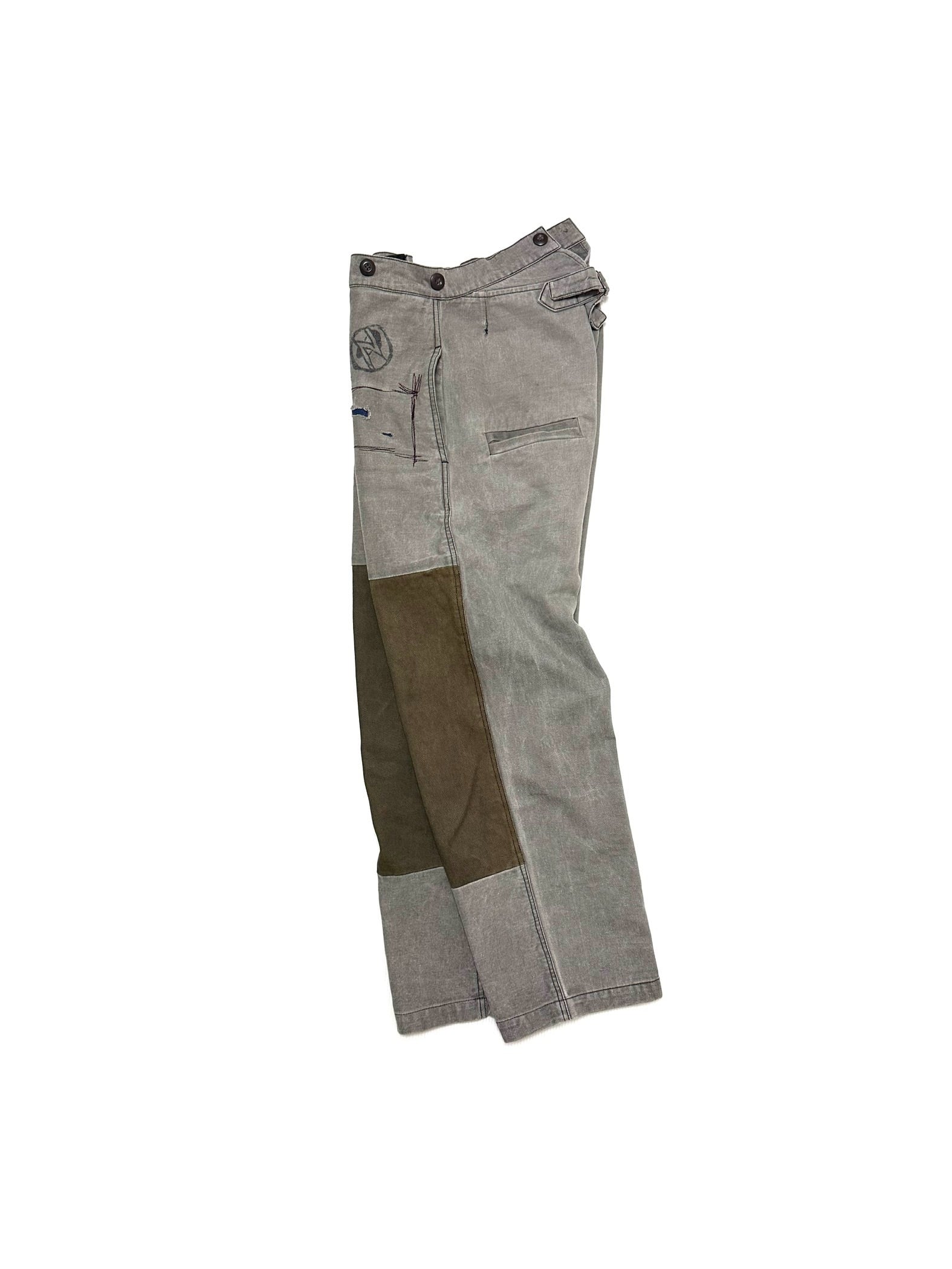 こちらはユーロ圏のレトロなワークパンツを土台に、雑なグラフィック&リペアと後付けダブルニー切替を加えたデザイン。