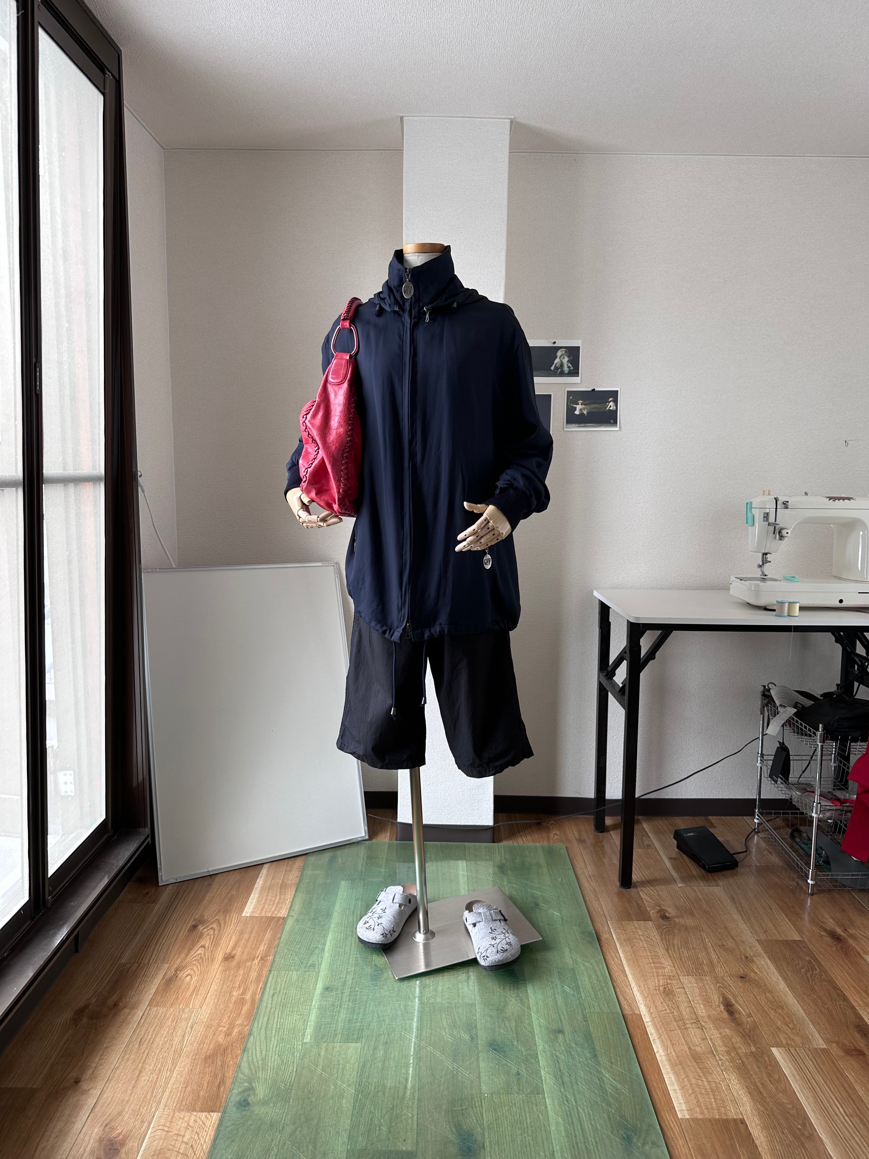 シリアスなネイビーを選び、プリントや刺繍も無くミニマルに仕上げたビジュアル。