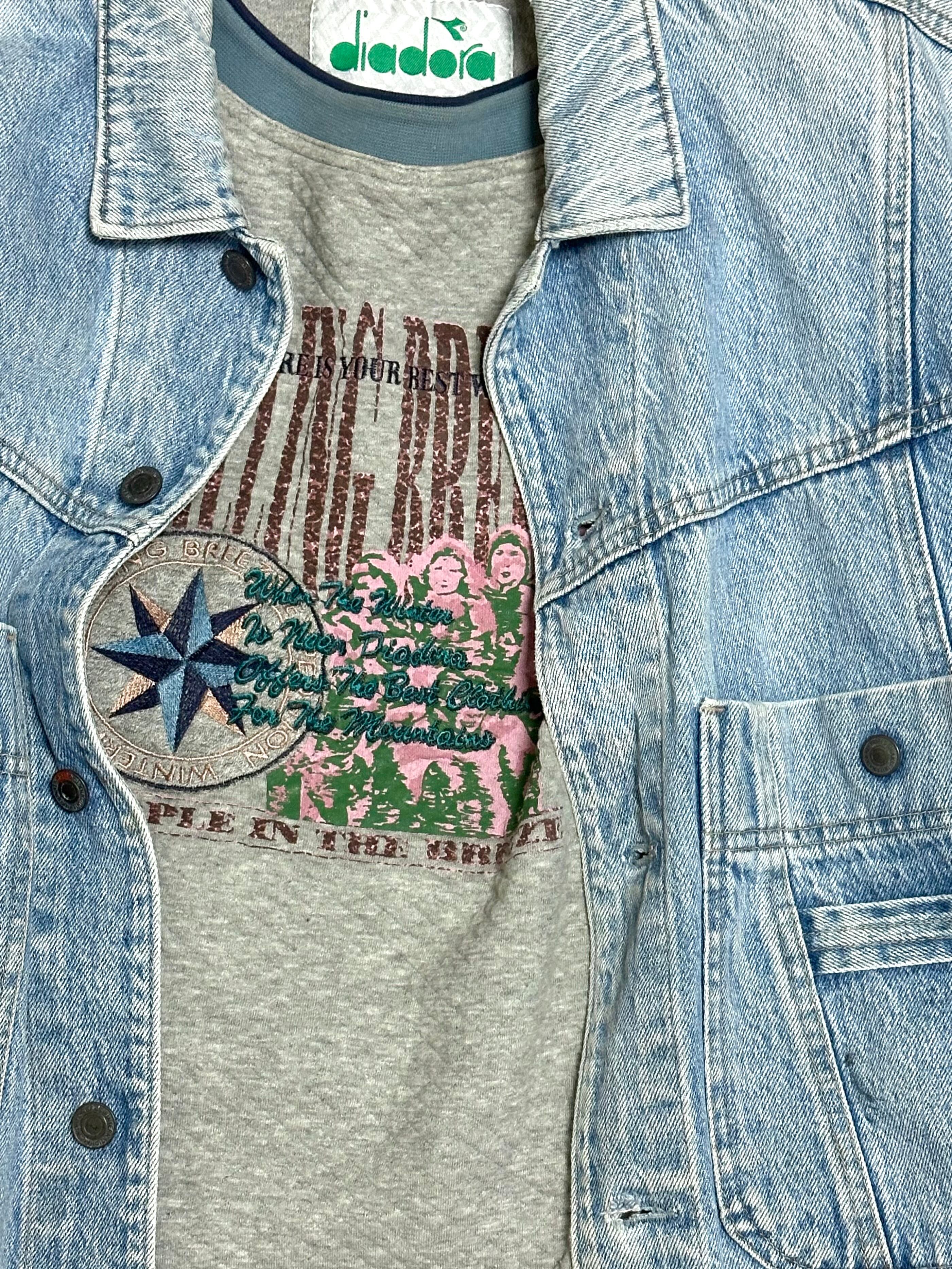 ゆるいスウェットも難なく挟めるサイズバランス、向こうの幻想的なカラーパレットにも馴染みの良いアイスウォッシュの色味。