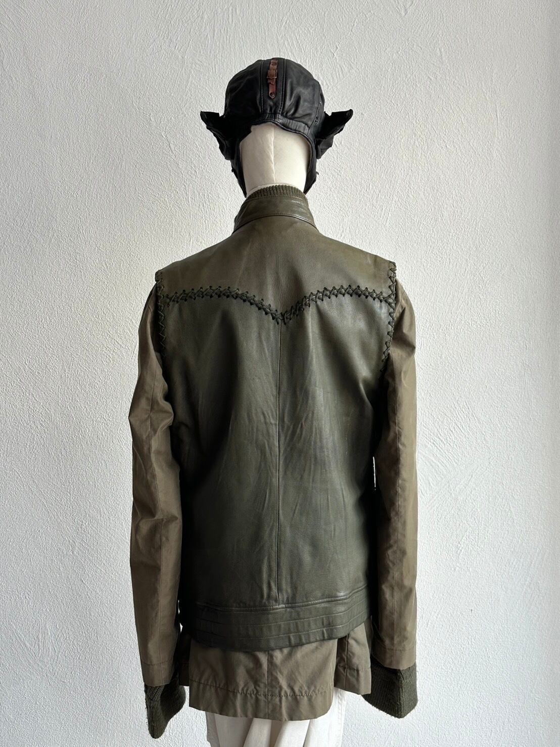 そしてフロントのファスナーは斜めにぐにゃり傾いて、ダブルブレストのライダースとはまた違うオフセットラインに着地。
